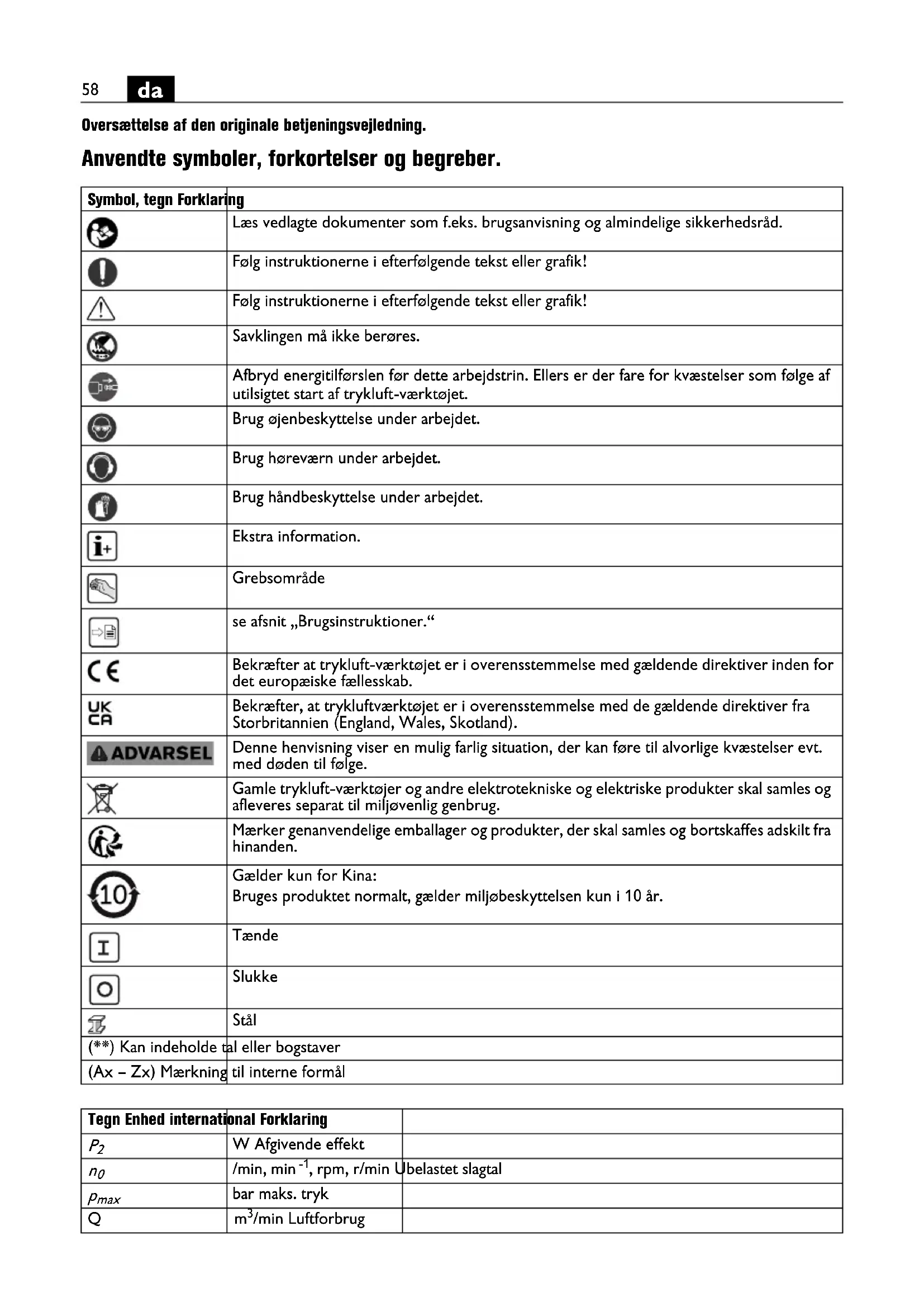 Oversættelse af den originale betjeningsvejledning. Anvendte symboler, forkortelser og begreber. Symbol, tegn Forklaring Læs vedlagte dokumenter som f.eks. brugsanvisning og almindelige sikkerhedsråd. Følg instruktionerne i efterfølgende tekst eller grafik! Følg instruktionerne i efterfølgende tekst eller grafik! Savklingen må ikke berøres. Afbryd energitilførslen før dette arbejdstrin. Ellers er der fare for kvæstelser som følge af utilsigtet start af trykluft-værktøjet. Brug øjenbeskyttelse under arbejdet. Brug høreværn under arbejdet. Brug håndbeskyttelse under arbejdet. Ekstra information. Grebsområde se afsnit „Brugsinstruktioner.“ Bekræfter at trykluft-værktøjet er i overensstemmelse med gældende direktiver inden for det europæiske fællesskab. Bekræfter, at trykluftværktøjet er i overensstemmelse med de gældende direktiver fra Storbritannien (England, Wales, Skotland). Denne henvisning viser en mulig farlig situation, der kan føre til alvorlige kvæstelser evt. med døden til følge. Gamle trykluft-værktøjer og andre elektrotekniske og elektriske produkter skal samles og afleveres separat til miljøvenlig genbrug. Mærker genanvendelige emballager og produkter, der skal samles og bortskaffes adskilt fra hinanden. Gælder kun for Kina: Bruges produktet normalt, gælder miljøbeskyttelsen kun i 10 år. Tænde Slukke Stål (**) Kan indeholde tal eller bogstaver (Ax – Zx) Mærkning til interne formål Tegn Enhed international Forklaring