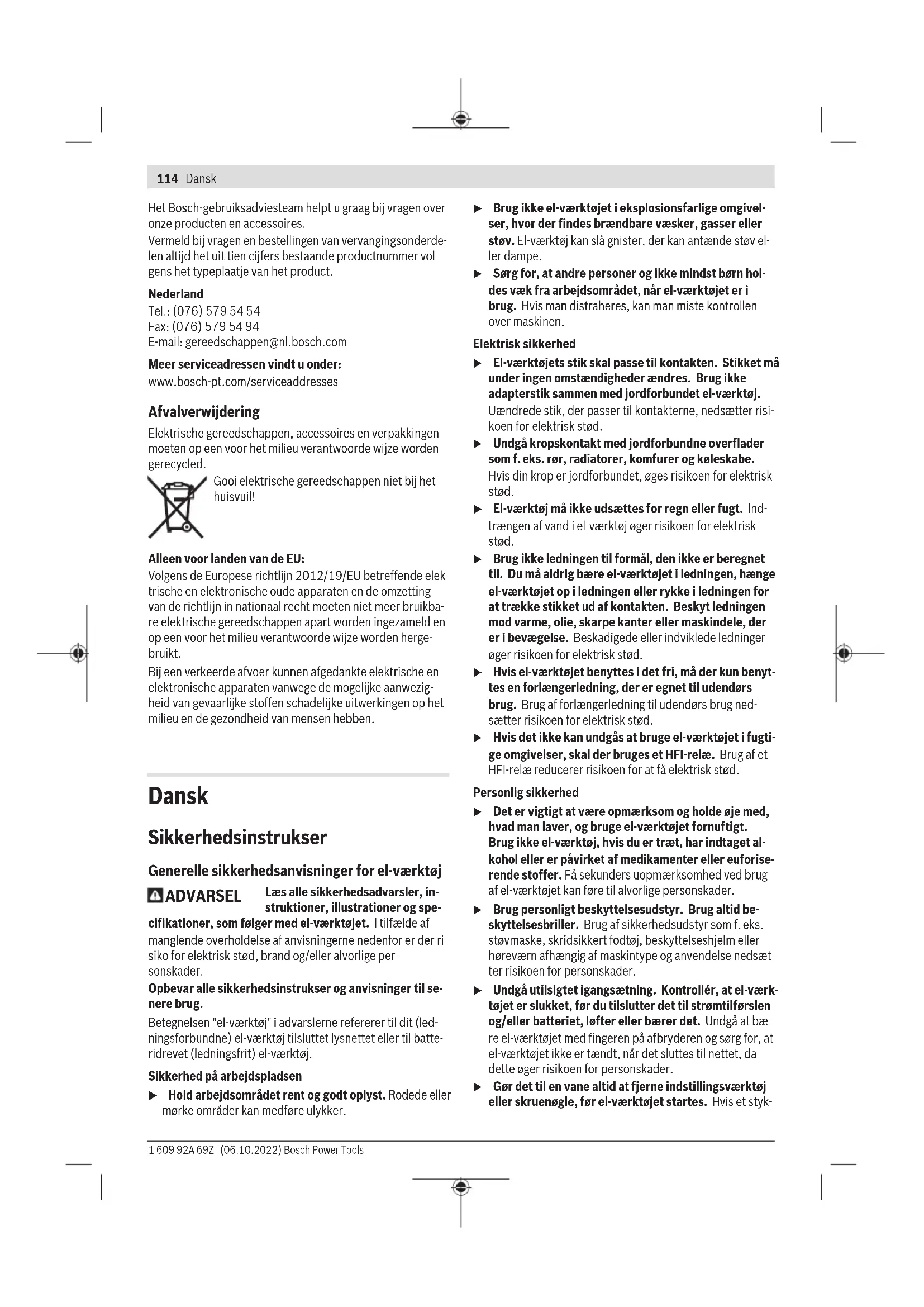 De angivne værdier for hastighedstrin er vejledende værdier. 1 609 92A 69Z | (06.10.2022) Bosch Power ToolsDansk | 123 Montering Montering af beskyttelsesanordning u Træk stikket ud af stikkontakten, før der udføres ar- bejde på el‑værktøjet. Bemærk: Efter brud på slibeskiven under arbejdet eller be- skadigelse af holdeanordningerne på beskyttelseskappen/ el-værktøjet skal el-værktøjet omgående sendes til et autori- seret værksted, adresser se afsnittet "Kundeservice og anvendelsesrådgivning". Beskyttelsesskærm til slibning Læg beskyttelseskappen (11) på holderen på el-værk- tøjet, til beskyttelseskappens kodeknaster stemmer overens med holderen. Tryk og hold herunder frigørings- armen (1). Tryk beskyttelseskappen (11) på spindelhalsen, til be- skyttelseskappens krave sid- der på el-værktøjets flange, og drej beskyttelseskappen, til den tydeligt hørbart går i indgreb. Tilpas beskyttelseskappens (11) position til arbejdsgangens krav. Tryk hertil frigørings- armen (1) opad, og drej beskyttelseskappen (11) i den øn- skede position. u Indstil altid beskyttelsesskærmen(11), så begge kna- ster til frigøringsarmen(1) når ind i de tilsvarende ud- sparinger i beskyttelsesskærmen (11). u Indstil beskyttelsesskærmen (11) , så betjeningsper- sonen ikke udsættes for gnistregn. u Beskyttelsesskærmen (11) må kun kunne drejes ved aktivering af frigøringsarmen (1)! Ellers skal el‑værk- tøjet tages ud af brug og sendes til et autoriseret ser- viceværksted. Bemærk: Kodeknasterne på beskyttelsesskærmen (11) sik- rer, at der kun kan monteres en beskyttelsesskærm, som passer til el-værktøjet. Opsugningskappe til slibning Til støvsvag slibning af maling, lak og kunststof i forbindelse med hårdmetalkopskiver(15) kan du anvende udsugningsskærmen(10). Udsugningsskærmen(10) er ik- ke beregnet til bearbejdning af metal. Udsugningsskærmen(10) kan forbindes med en egnet Bosch-støvsuger. Sæt i den forbindelse sugeslangen med udsugningsadapteren ind i holdestudserne på udsugnings- skærmen. Beskyttelsesskærm til skæring u Brug altid beskyttelsesskærmen til skæring ved skæ- ringsarbejde (12) eller beskyttelsesskærmen til slib- ning (11) sammen med afdækningen til skæring (13). u Sørg for tilstrækkelig støvopsugning, når der skæres i sten. Beskyttelsesskærmen til skæring(12) monteres på samme måde som beskyttelsesskærmen til slibning(11). Metalafdækning i metal til skæring Monter metalafdækningen til skæring (13) på beskyttelses- skærmen til slibning (11) (se billedet A): Sving holdebøjlen tilbage (➊). Sæt afdækningen (13) på beskyttelsesskærmen til slibning (11) (➋). Tryk holdebøjlen fast på beskyttelses- skærmen (11) (➌). Ved afmontering (se billedet B) skal du trykke på knappen på holdebøjlen (➊) og svinge den tilbage (➋). Træk afdæknin- gen (13) af beskyttelsesskærmen (11) (➌). Plastafdækning til skæring Sæt plastafdækningen til skæring(13) på beskyttelsesskær- men til slibning(11) (se billedetC). Afdækningen(13) går hørbart og synligt i indgreb på beskyttelsesskærmen(11). Ved afmontering (se billedetD) skal du låse afdækningen(13) på beskyttelsesafskærmningen(11) (➊) til venstre eller højre op og trække afdækningen af (➋). Udsugningsskærm til skæring med føringsslæde Udsugningsskærm til skæring med føringsslæde(34) mon- teres ligesom beskyttelsesskærmen til slibning. Når ekstrahåndtaget(8)/(9) fastgøres på gearhuset ved hjælp af bøjlen på udsugningsskærmen, fastgøres el-værktø- jet sikkert med udsugningsskærmen. På udsugningsskær- men med føringsslidser(34) kan der monteres en egnet Bosch-støvsuger. Sæt i den forbindelse sugeslangen med udsugningsadapteren ind i holdestudserne på udsugnings- skærmen. Bemærk! Friktion forårsaget af støvet i sugeslangen og i til- behøret under sugning skaber en elektrostatisk ladning, som brugeren kan opfatte som en statisk udladning (afhængigt af miljøfaktorer og brugerens fysiologiske tilstand). Bosch an- befaler generelt at anvende antistatiske sugeslanger (tilbe- hør) til opsugning af fint støv og tørre materialer. Håndbeskyttelse u Ved arbejde med gummislibeskiven(27) eller med kopbørste/konusbørste/diamant-borekrone skal du altid montere håndbeskyttelsen (26). Fastgør håndbeskyttelsen (26) med ekstrahåndtaget (8)/ (9). Standardekstrahåndtag/vibrationsdæmpende ekstrahåndtag Skru ekstrahåndtaget (8)/(9) ind i gearhovedet på højre el- ler venstre side, afhængigt af hvilket arbejde der skal ud- føres. u Brug kun dit el-værktøj med ekstrahåndtaget (8)/(9). u Brug ikke el-værktøjet, hvis ekstrahåndtaget (8)/(9) er beskadiget. Foretag ikke ændringer på ekstrahånd- taget (8)/(9). Det vibrationsdæmpende ekstrahåndtag (9) giver vi- brationssvagt og dermed Bosch Power Tools 1 609 92A 69Z | (06.10.2022)124 | Dansk behageligt og sikkert arbejde. Montering af slibeværktøj u Træk stikket ud af stikkontakten, før der udføres ar- bejde på el‑værktøjet. u Rør ikke ved slibe- og skæreskiverne, før de er kølet af. Skiverne bliver meget varmt under arbejdet. Rengør slibespindlen (25) og alle dele, der skal monteres. Tryk på spindellåsetasten (2) for at låse slibespindlen ved fastspænding og frigørelse af slibeværktøjerne. u Aktivér kun spindellåsetasten, når slibespindlen står stille. Ellers kan el‑værktøjet blive beskadiget. Slibe-/skæreskive Vær opmærksom på slibeværktøjernes dimensioner. Huldia- meteren skal passe til holdeflangen. Brug hverken adaptere eller reduktionsstykker. Sørg ved anvendelse af diamantskæreskiver for, at retning- spilen på diamantskæreskiven og el-værktøjets omdrejnings- retning (se retningspil på huset) stemmer overens. Rækkefølgen ved montering kan ses på grafiksiden. Bemærk! Hvis du monterer slibe- eller skæreskiver i kompo- sitmateriale ved hjælp af den medfølgende holdeflange(14) og spændemøtrikken(21) eller lynspændem