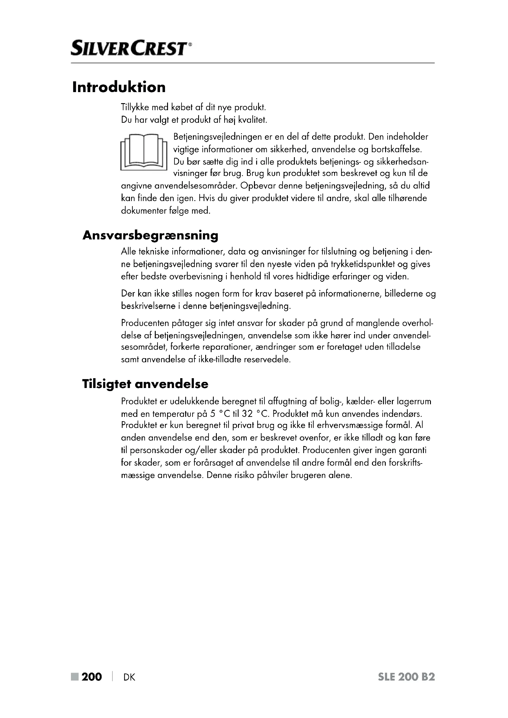 DK SLE 200 B2 Introduktion Tillykke med købet af dit nye produkt. Du har valgt et produkt af høj kvalitet. Betjeningsvejledningen er en del af dette produkt. Den indeholder vigtige informationer om sikkerhed, anvendelse og bortskaffelse. Du bør sætte dig ind i alle produktets betjenings- og sikkerhedsan- visninger før brug. Brug kun produktet som beskrevet og kun til de angivne anvendelsesområder. Opbevar denne betjeningsvejledning, så du altid kan finde den igen. Hvis du giver produktet videre til andre, skal alle tilhørende dokumenter følge med. Ansvarsbegrænsning Alle tekniske informationer, data og anvisninger for tilslutning og betjening i den- ne betjeningsvejledning svarer til den nyeste viden på trykketidspunktet og gives efter bedste overbevisning i henhold til vores hidtidige erfaringer og viden. Der kan ikke stilles nogen form for krav baseret på informationerne, billederne og beskrivelserne i denne betjeningsvejledning. Producenten påtager sig intet ansvar for skader på grund af manglende overhol- delse af betjeningsvejledningen, anvendelse som ikke hører ind under anvendel- sesområdet, forkerte reparationer, ændringer som er foretaget uden tilladelse samt anvendelse af ikke-tilladte reservedele. Tilsigtet anvendelse Produktet er udelukkende beregnet til affugtning af bolig-, kælder- eller lagerrum med en temperatur på 5 °C til 32 °C. Produktet må kun anvendes indendørs. Produktet er kun beregnet til privat brug og ikke til erhvervsmæssige formål. Al anden anvendelse end den, som er beskrevet ovenfor, er ikke tilladt og kan føre til personskader og/eller skader på produktet. Producenten giver ingen garanti for skader, som er forårsaget af anvendelse til andre formål end den forskrifts- mæssige anvendelse. Denne risiko påhviler brugeren alene.DK
