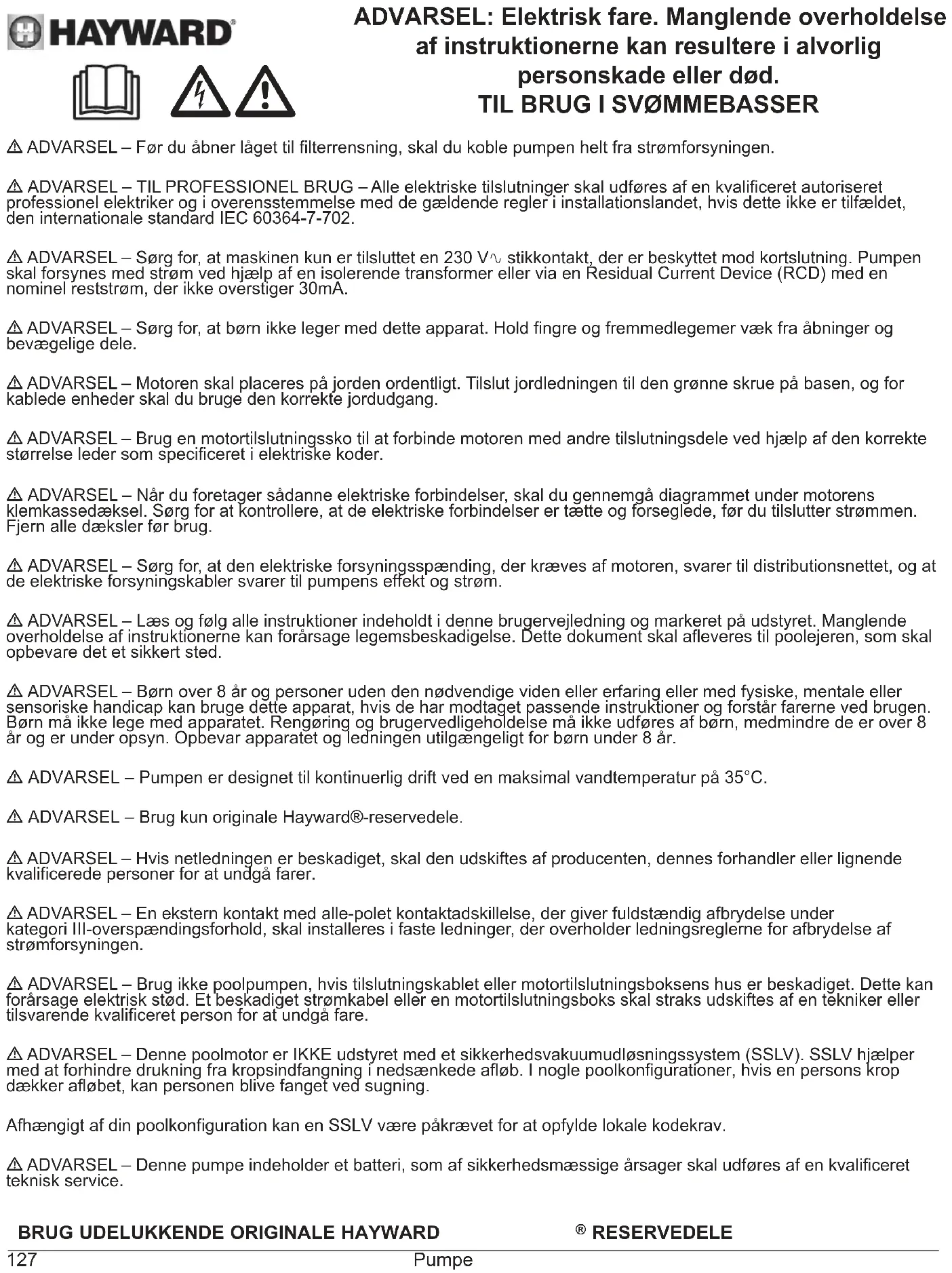 - OBS: Vent i 5 minutter efter at strømmen til pumpen er helt afbrudt før der arbejdes på motoren eller kapslingskassen: Fare for elektrisk stød - dette kan have døden til følge. Elmotorerne på vore pumper er forsynet med en temperaturbeskyttelse, som reagerer ved overspænding eller unormal ophedning af motoren. Denne beskyttelse slår automatisk til igen, når temperaturen i spolen falder. Hvis det er et regelkrav og uanset motortype, skal der ud over de nedennævnte anordninger, installeres en termomagnetisk sikring, som skal kalibreres i henhold til anvisningerne på motorpladen. Tabellen på side 169 viser specifikationerne på de forskellige pumper på vores udstyr.BRUG UDELUKKENDE ORIGINALE HAYWARD