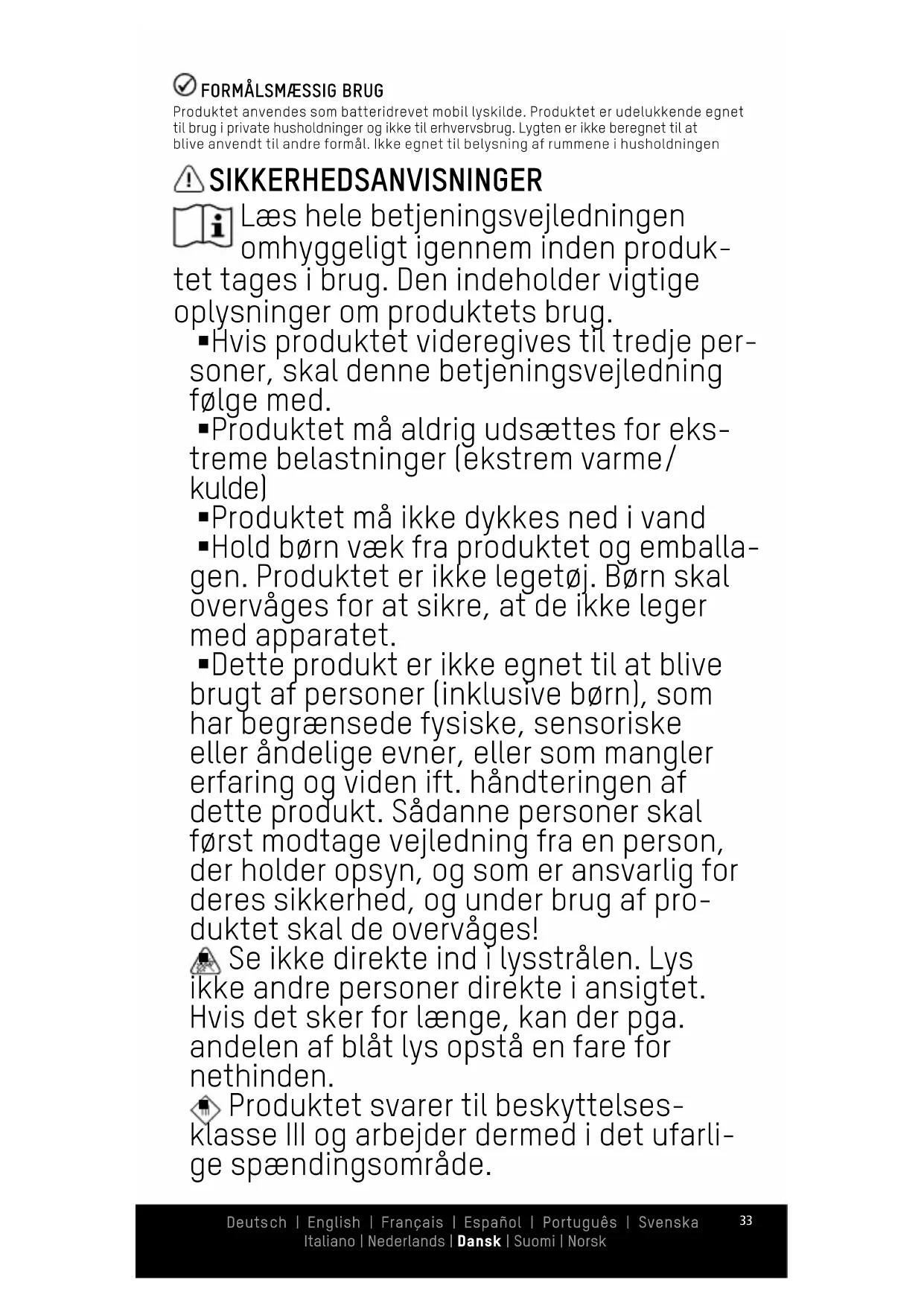 Pas på: §Dette produkt indeholder batterier. Pro- duktet må ikke kastes i åben ild. §Usagkyndigt isat batteri kan løbe ud og/ eller forårsage en brand/eksplosion §Batterier udskiftes komplet som sæt, brug altid den samme type batterier §Opbevares utilgængeligt for børn! Fare for at sluge eller kvælningsfare §Batteriet må aldrig åbnes, klemmes, opvarmes eller udsættes for ild. §Batterierne må ikke anvendes, når pro- duktet viser tegn på at være beskadiget. §Batterierne kan ikke genoplades §Brugte batterier/akkumulatorer skal al- tid bortskaffes i overensstemmelse med lokale live eller krav. §Hvis batterier løber ud, må de ikke berøres. Hvis du alligevel kommer i kon- takt med batterivæske, skal du omgå- ende vaske det pågældende sted med vand. §Søg læge, hvis batterivæsken forårsager en hudreaktion eller er kommet i kontakt med øjnene. §Batterier må ikke kortsluttes! §nvendelsen af genopladelige batterier og højspændings-batterier er pga. andre Deutsch | English | Français | Español | Português | Svenska Italiano | Nederlands | Dansk | Suomi | Norsk35 Deutsch | English | Français | Español | Português | Svenska Italiano | Nederlands | Dansk | Suomi | Norsk elektriske værdier ikke tilladt. §Brugte eller tomme batterier skal omgå- ende tages ud af lygten §Når lygten ikke længere skal benyttes, skal batterierne fjernes inden lygten bortskaffes