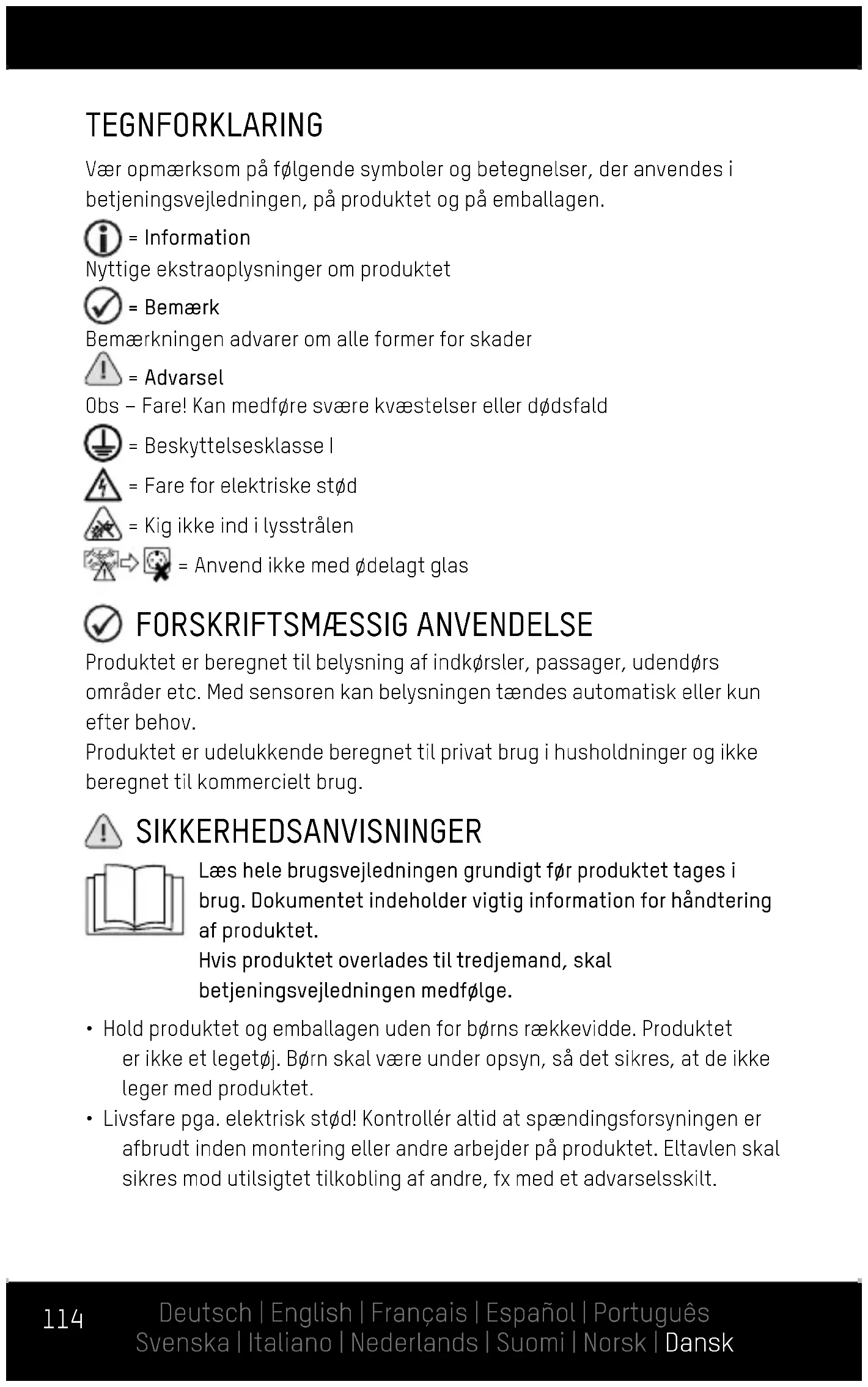 Produktet er beregnet til belysning af indkørsler, passager, udendørs områder etc. Med sensoren kan belysningen tændes automatisk eller kun efter behov. Produktet er udelukkende beregnet til privat brug i husholdninger og ikke beregnet til kommercielt brug. SIKKERHEDSANVISNINGER Læs hele brugsvejledningen grundigt før produktet tages i brug. Dokumentet indeholder vigtig information for håndtering af produktet. Hvis produktet overlades til tredjemand, skal betjeningsvejledningen medfølge.