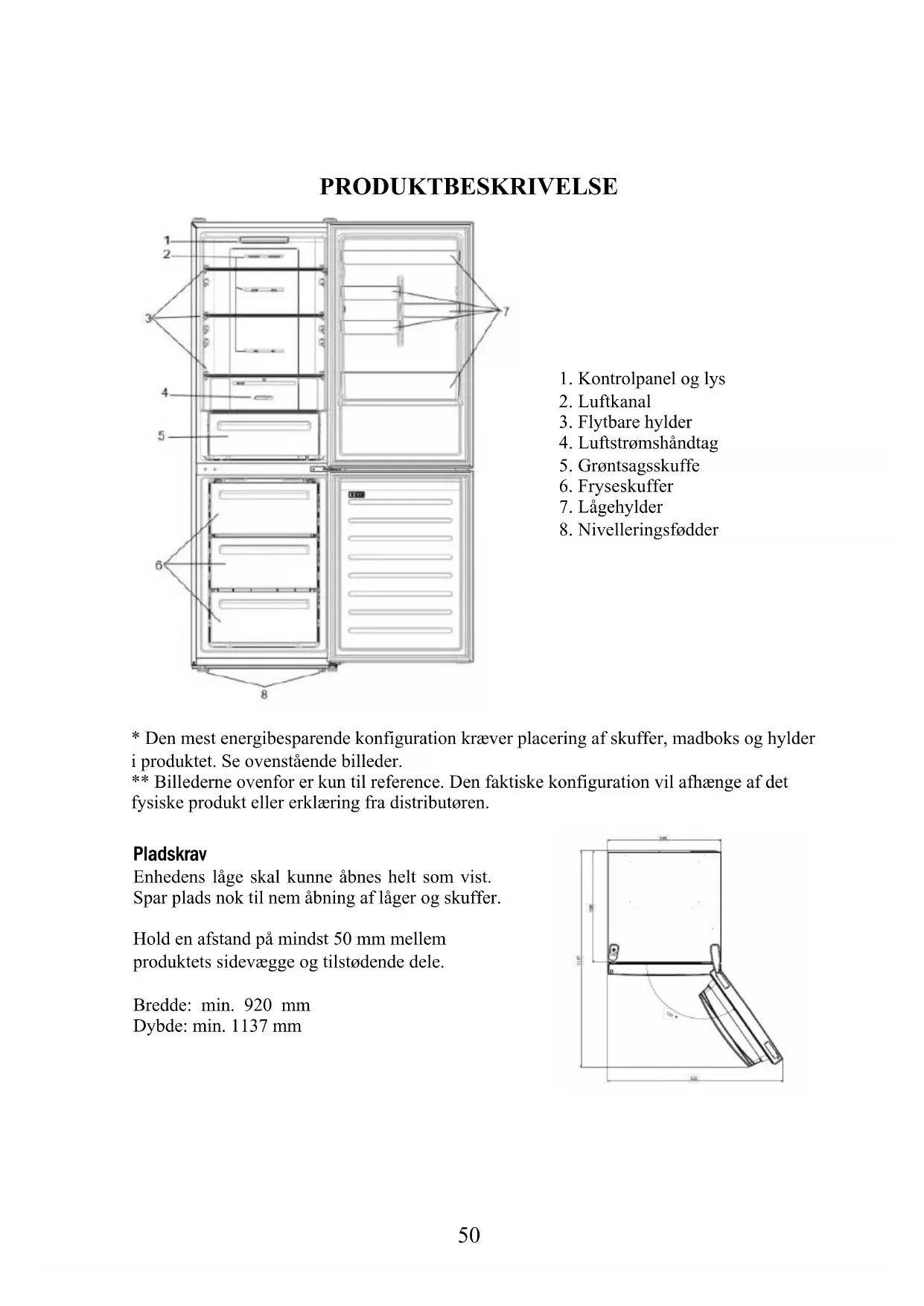 Den mest energibesparende konfiguration kræver placering af skuffer, madboks og hylder i produitet. Se ovenstænde billedder.