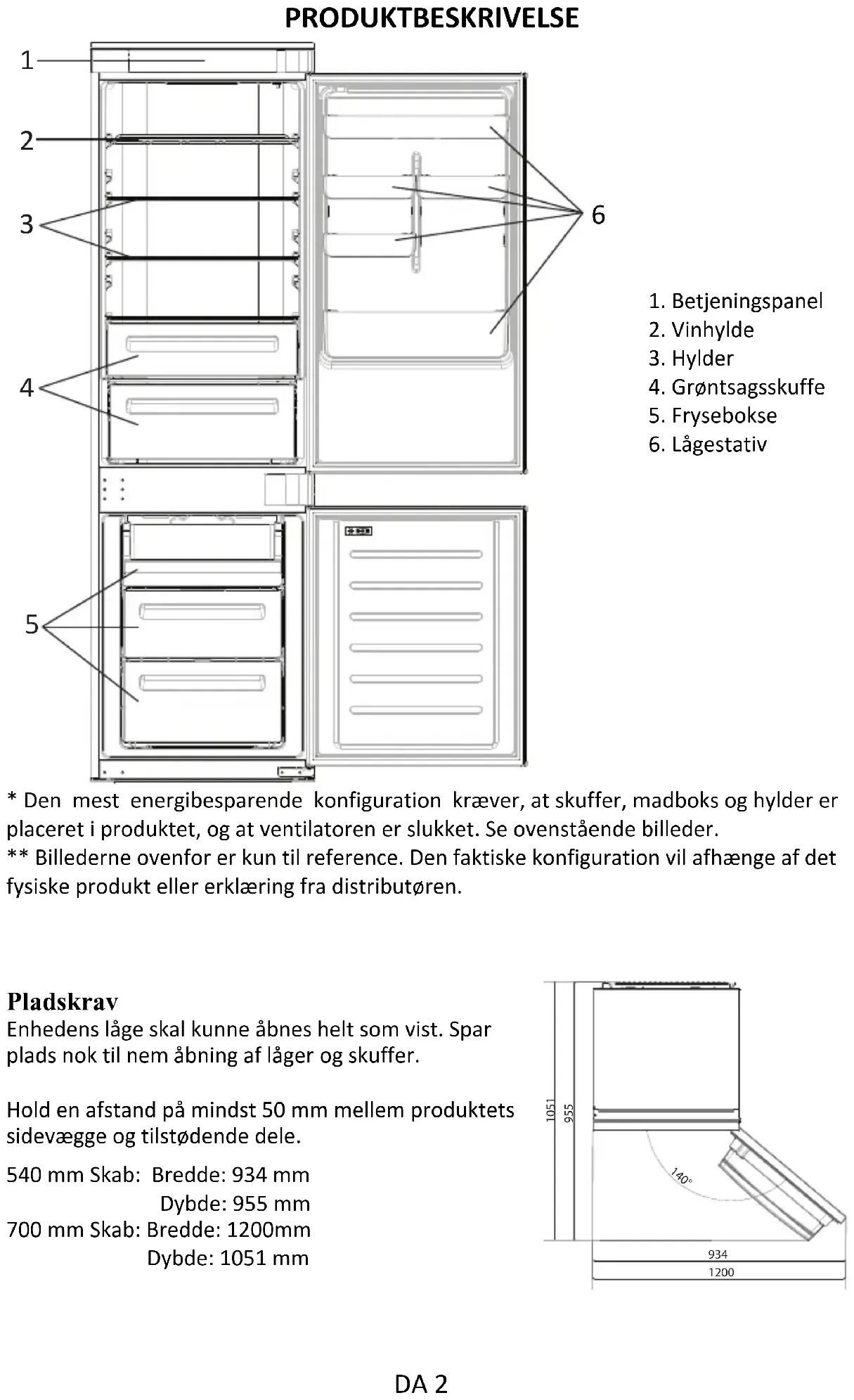 2PRODUKTBESKRIVELSE 1. Betjeningspanel2. Vinhylde3. Hylder4. Grøntsagsskuffe5. Frysebokse6. Lågestativ* Den mest energibesparende konfiguration kræver, at skuffer, madboks og hylder erplaceret i produktet, og at ventilatoren er slukket. Se ovenstående billeder.** Billederne ovenfor er kun til reference. Den faktiske konfiguration vil afhænge af detfysiske produkt eller erklæring fra distributøren.Pladskrav Enhedens låge skal kunne åbnes helt som vist. Spar plads nok til nem åbning af låger og skuffer. Hold en afstand på mindst 50 mm mellem produktets sidevægge og tilstødende dele.