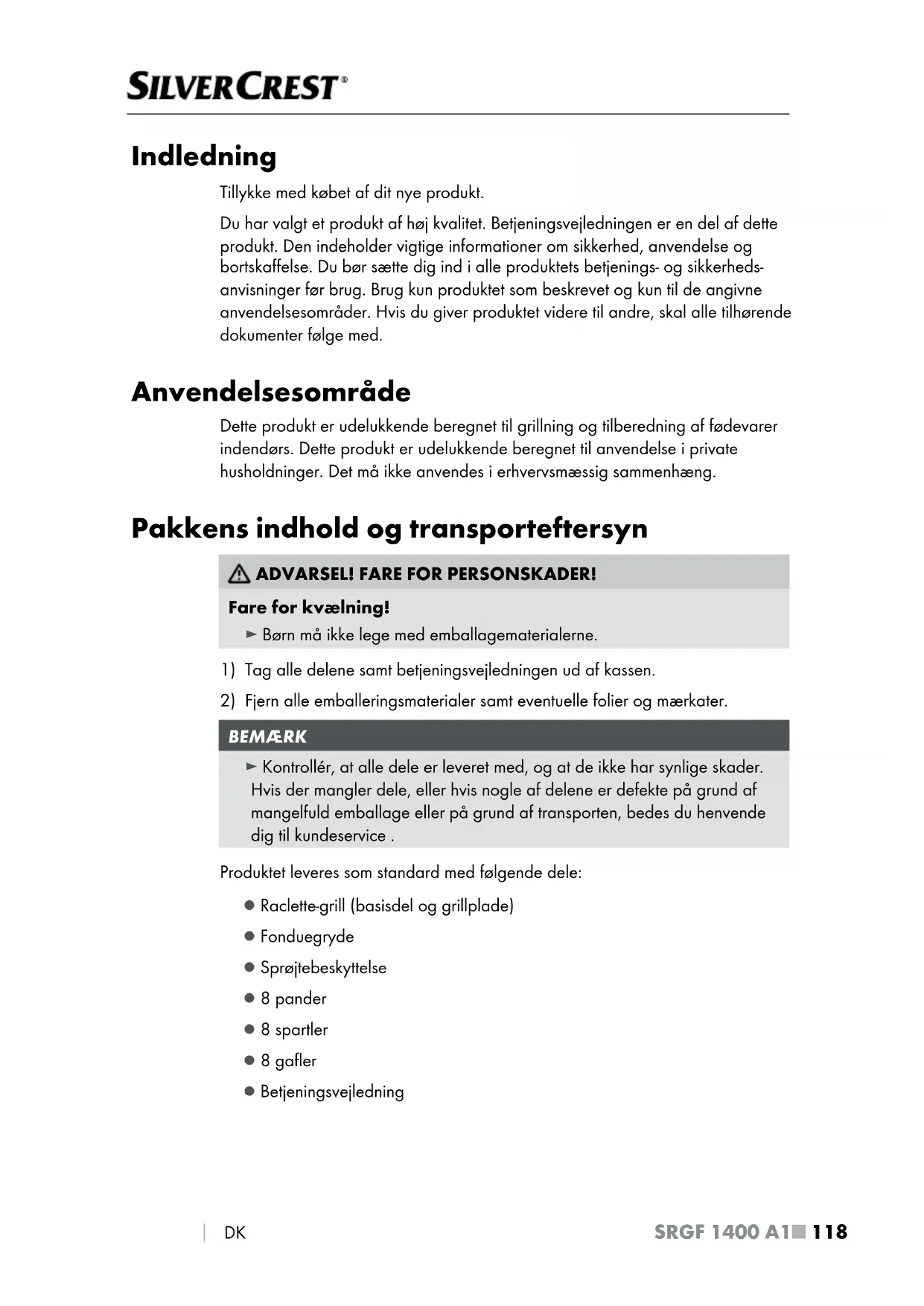 BEMÆRK ► Kontrollér, at alle dele er leveret med, og at de ikke har synlige skader. Hvis der mangler dele, eller hvis nogle af delene er defekte på grund af mangelfuld emballage eller på grund af transporten, bedes du henvende dig til kundeservice . Produktet leveres som standard med følgende dele: ▯ Raclette-grill (basisdel og grillplade) ▯ Fonduegryde ▯ Sprøjtebeskyttelse ▯ 8 pander ▯ 8 spartler ▯ 8 gafler ▯ BetjeningsvejledningSRGF 1400 A1 DK