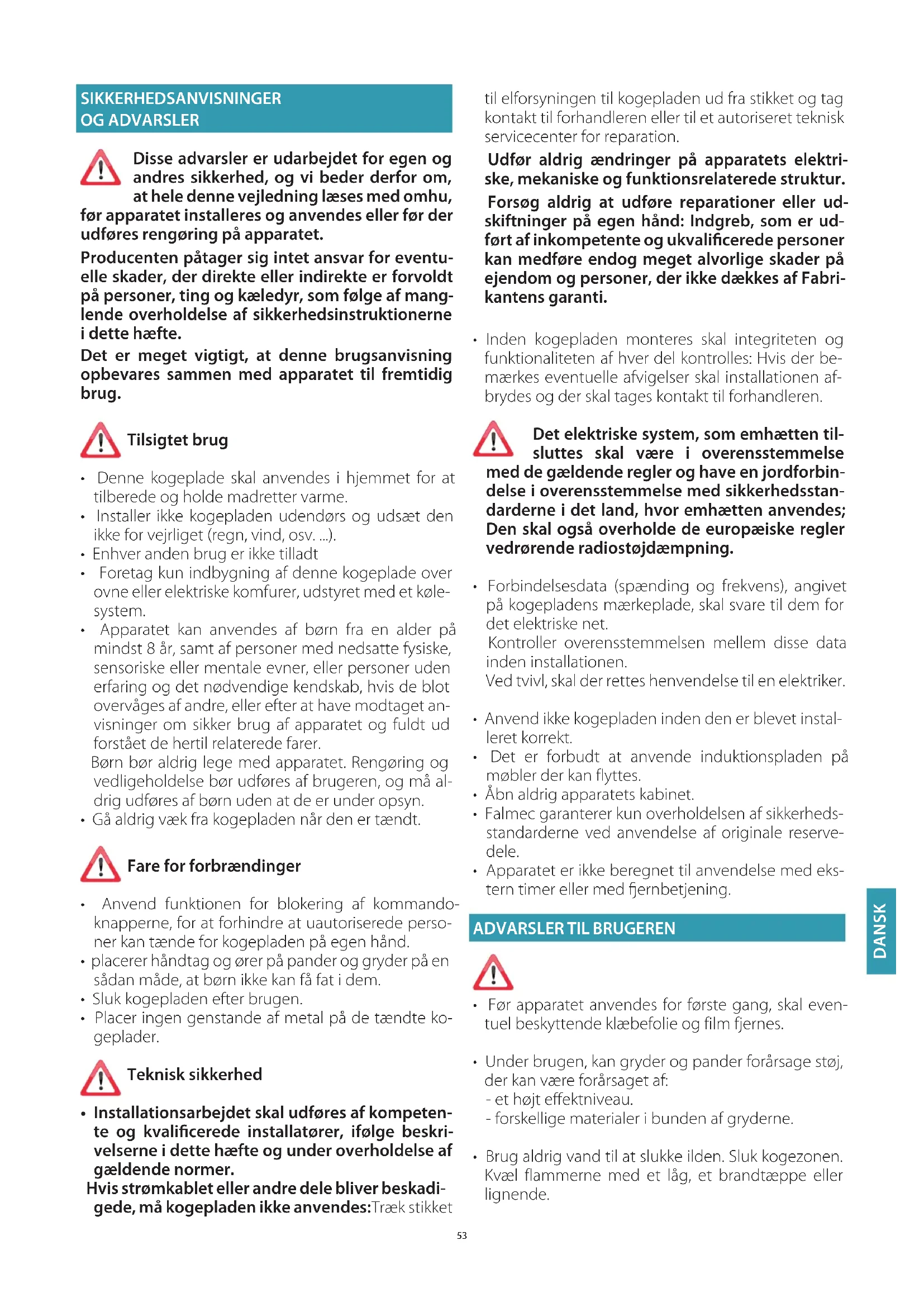 - Installationsarbejdet skal udføres af kompeten- te og kvalicerede installatører, ifølge beskri- velserne i dette hæfte og under overholdelse af gældende normer. Hvis strømkablet eller andre dele bliver beskadi- gede, må kogepladen ikke anvendes: Træk stikket til elforsyningen til kogepladen ud fra stikket og tag kontakt til forhandleren eller til et autoriseret teknisk servicecenter for reparation. Udfør aldrig ændringer på apparatets elektri- ske, mekaniske og funktionsrelaterede struktur. Forsøg aldrig at udføre reparationer eller ud- skiftninger på egen hånd: Indgreb, som er ud- ført af inkompetente og ukvalicerede personer kan medføre endog meget alvorlige skader på ejendom og personer, der ikke dækkes af Fabri- kantens garanti.