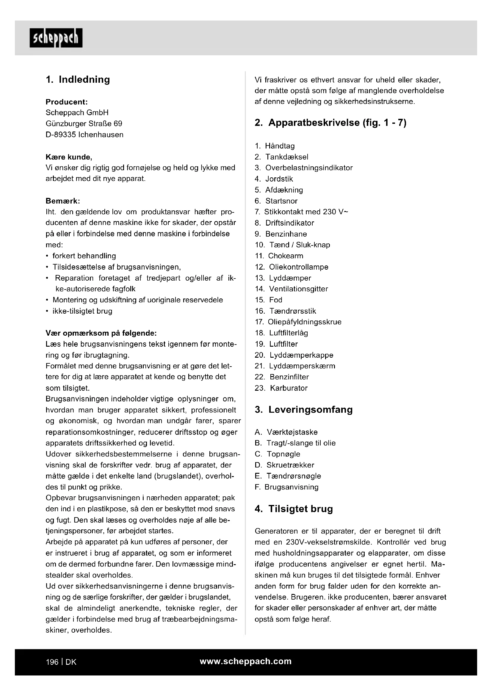 Producent: Scheppach GmbH Günzburger Straße 69 D-89335 Ichenhausen Kære kunde, Vi ønsker dig rigtig god fornøjelse og held og lykke med arbejdet med dit nye apparat. Bemærk: Iht. den gældende lov om produktansvar hæfter pro- ducenten af denne maskine ikke for skader, der opstår på eller i forbindelse med denne maskine i forbindelse med: