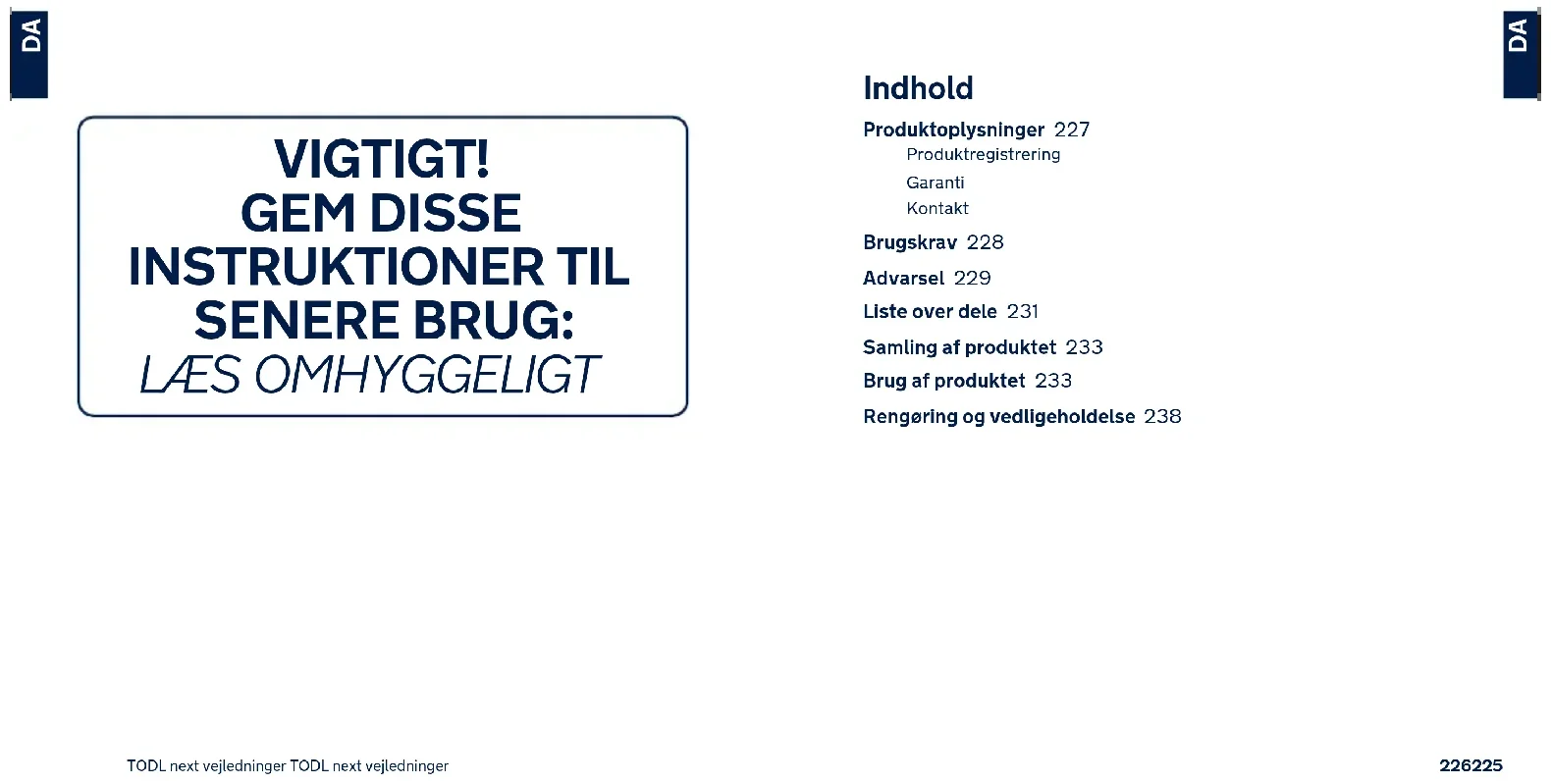 ADVARSEL Manglende overholdelse af disse advarsler og instruktioner kan medføre alvorlige kvæstelser eller dødsfald. Når autostolen monteres SKAL du holde øje med at dens hårde genstande og plastdele ikke kan komme i klemme i et bevægeligt sæde eller i en køretøjets døre. Brug IKKE en bagudvendt autostol på siddepladser, hvor der er en fremadvendt airbag. For at bruge denne autostol i henhold til FN regulativ nr. 129, skal dit barn opfylde følgende krav. Bagudvendt: (Barnets højde 40-105cm/Barnets vægt ≤ 19kg) Fremadvendt: Barnets højde 76-105cm / Barnets vægt ≤ 19kg. VIGTIGT - AUTOSTOLEN MÅ IKKE VENDRE FREMAD, FØR BARNET ER OVER 15 MÅNEDER (se vejledningerne) Ethvert støtteben skal være i kontakt med køretøjets gulv, og alle seler der fastholder barnet, skal tilpasses barnets krop. Selerne må ikke vrides. Sørg for, at alle skødestropper sidder lavt, så bækkenet sidder fast. Hvis denne forstærket autostol udsættes for voldsomme belastninger i en ulykke, skal den skiftes. En ulykke kan forårsage skader, som ikke kan ses. Vær opmærksom på faren ved at foretage ændringer eller tilføjelser til anordningen, uden godkendelse af den typegodkendende myndighed, og faren ved ikke at følge autostolens installationsvejledninger, der følger med produktet. Denne forstærkede autostol skal holdes væk fra direkte sollys, da den ellers kan blive for varm for barnets hud. Mærk altid temperaturen efter med en hånd, inden du anbringer barnet i autostolen. Barnet må ikke efterlades i autostolen uden opsyn. Bagage eller andre genstande kan føre til skader i tilfælde af et sammenstød, og de skal derfor spændes ordentligt fast. Autostolen passer muligvis ikke altid i alle positioner i godkendte køretøjer. Autostolen må IKKE bruges uden de bløde dele. De bløde dele må ikke erstattes med nogen andre dele, undtagen dele der anbefales af producenten, da de bløde dele er en integreret del af autostolens funktion. Instruktionerne skal opbevares i autostolen i hele dens levetid. Du bedes også være opmærksom på instruktionerne og advarslerne i brugsvejledningen til bilen.232231 TODL next vejledninger TODL next vejledninger