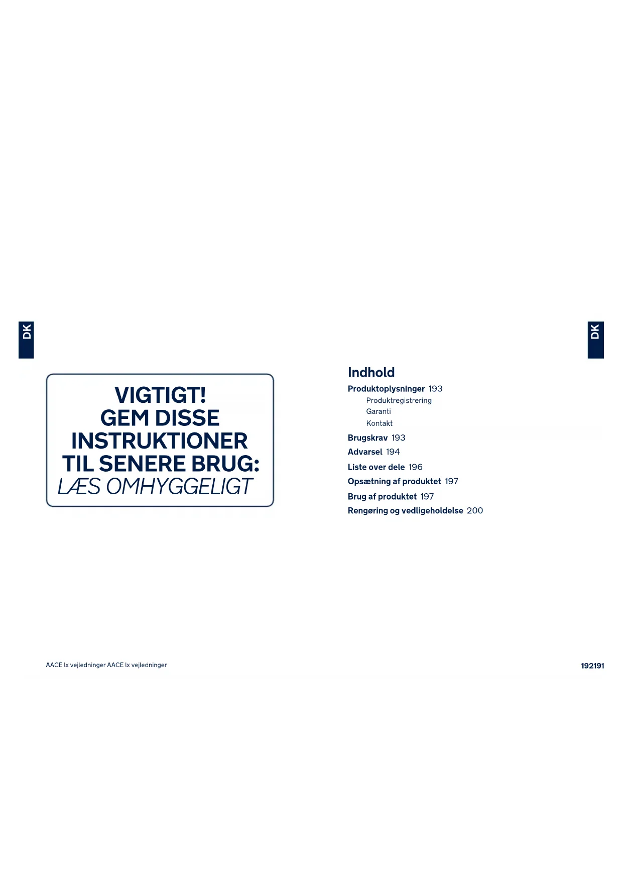 Indhold Produktoplysninger 193 Produktregistrering Garanti Kontakt Brugskrav 193 Advarsel 194 Liste over dele 196 Opsætning af produktet 197 Brug af produktet 197 Rengøring og vedligeholdelse 200