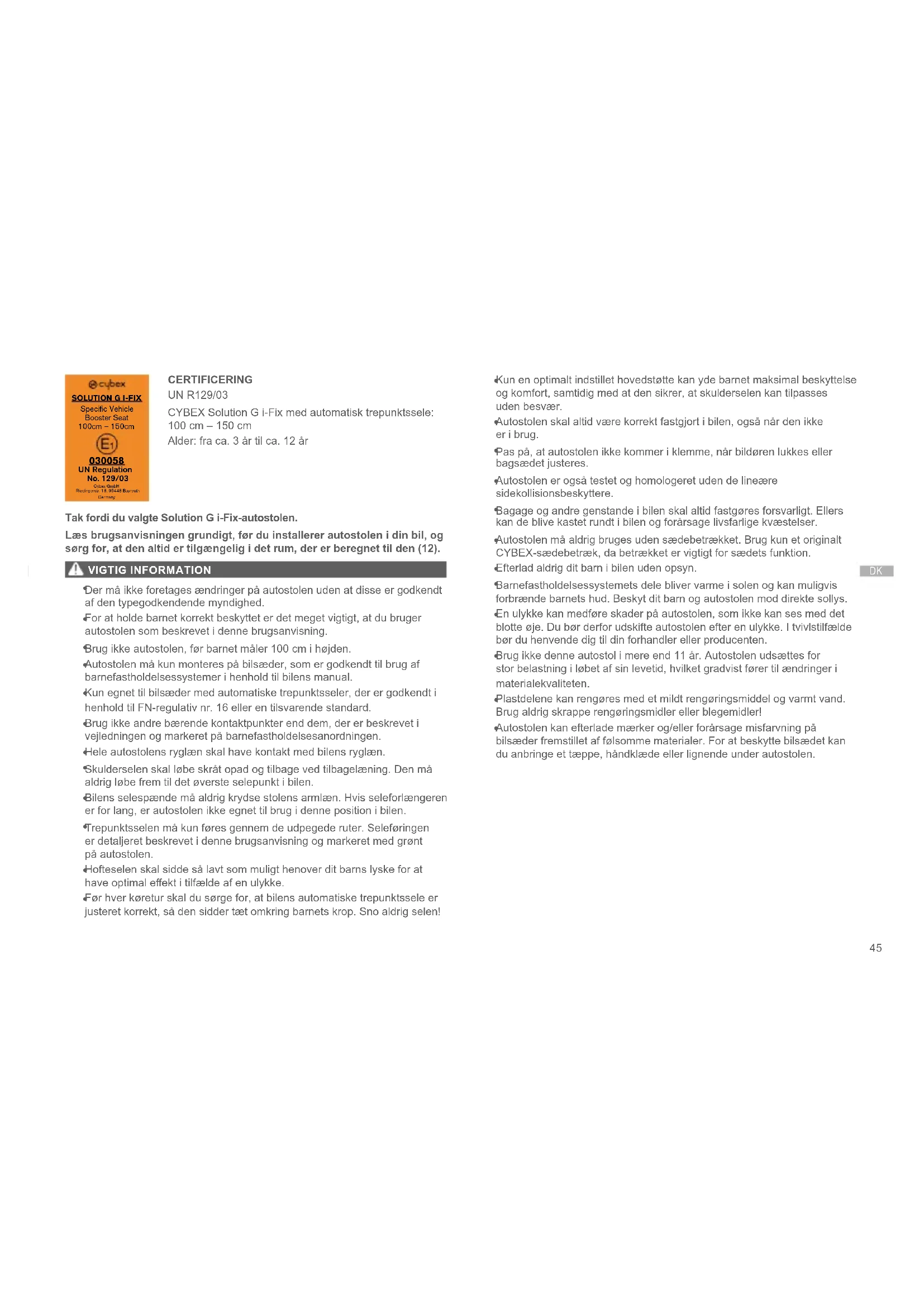 CERTIFICERING UN R129/03 CYBEX Solution G i-Fix med automatisk trepunktssele: 100 cm – 150 cm Alder: fra ca. 3 år til ca. 12 år Tak fordi du valgte Solution G i-Fix-autostolen. Læs brugsanvisningen grundigt, før du installerer autostolen i din bil, og sørg for, at den altid er tilgængelig i det rum, der er beregnet til den (12). VIGTIG INFORMATION