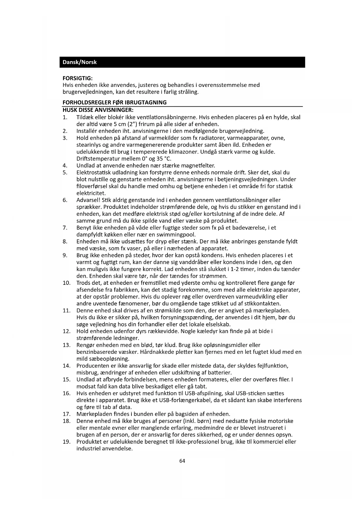 stearinlys og andre varmegenererende produkter samt åben ild. Enheden er udelukkende til brug i tempererede klimazoner. Undgå stærk varme og kulde. Driftstemperatur mellem 0° og 35 °C.