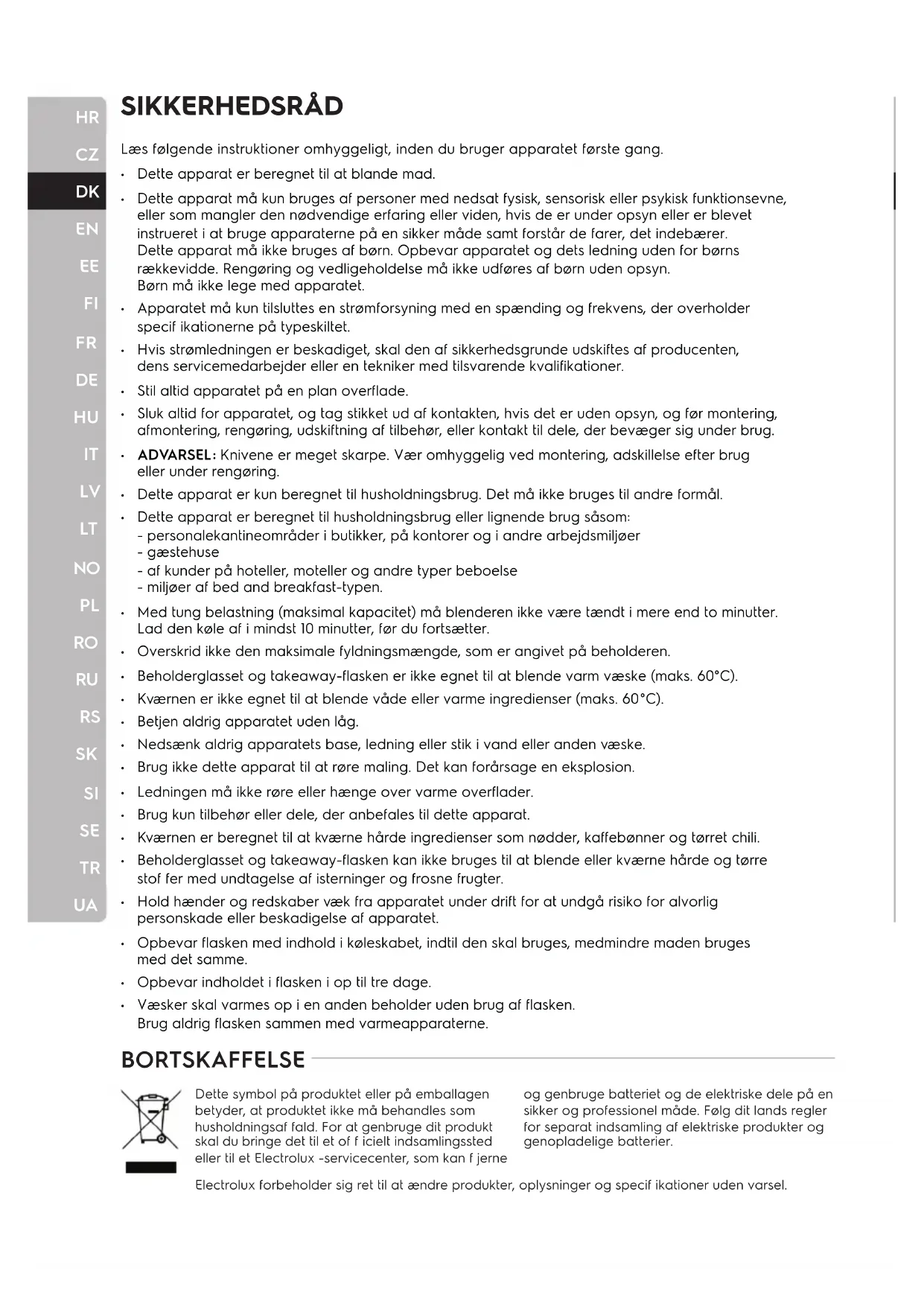 Dette apparat er beregnet til at blande mad. Dette apparat må kun bruges af personer med nedsat fysisk, sensorisk eller psykisk funktionsevne, eller som mangler den nødvendige erfaring eller viden, hvis de er under opsyn eller er blevet instrueret i at bruge apparaterne på en sikker måde samt forstår de farer, det indebærer. Dette apparat må ikke bruges af børn. Opbevar apparatet og dets ledning uden for børns rækkevidde. Rengøring og vedligeholdelse må ikke udføres af børn uden opsyn. Børn må ikke lege med apparatet. Apparatet må kun tilsluttes en strømforsyning med en spænding og frekvens, der overholder specif ikationerne på typeskiltet. Hvis strømledningen er beskadiget, skal den af sikkerhedsgrunde udskiftes af producenten, dens servicemedarbejder eller en tekniker med tilsvarende kvalif ikationer. Stil altid apparatet på en plan overflade. Sluk altid for apparatet, og tag stikket ud af kontakten, hvis det er uden opsyn, og før montering, afmontering, rengøring, udskiftning af tilbehør, eller kontakt til dele, der bevæger sig under brug. ADVARSEL: Knivene er meget skarpe. Vær omhyggelig ved montering, adskillelse efter brug eller under rengøring. Dette apparat er kun beregnet til husholdningsbrug. Det må ikke bruges til andre formål. Dette apparat er beregnet til husholdningsbrug eller lignende brug såsom: - personalekantineområder i butikker, på kontorer og i andre arbejdsmiljøer - gæstehuse - af kunder på hoteller, moteller og andre typer beboelse - miljøer af bed and breakfast-typen. Med tung belastning (maksimal kapacitet) må blenderen ikke være tændt i mere end to minutter. Lad den køle af i mindst 10 minutter, før du fortsætter. Overskrid ikke den maksimale fyldningsmængde, som er angivet på beholderen. Beholderglasset og takeaway-flasken er ikke egnet til at blende varm væske (maks. 60°C). Kværnen er ikke egnet til at blende våde eller varme ingredienser (maks. 60°C). Betjen aldrig apparatet uden låg. Nedsænk aldrig apparatets base, ledning eller stik i vand eller anden væske. Brug ikke dette apparat til at røre maling. Det kan forårsage en eksplosion. Ledningen må ikke røre eller hænge over varme overflader. Brug kun tilbehør eller dele, der anbefales til dette apparat. Kværnen er beregnet til at kværne hårde ingredienser som nødder, kaf febønner og tørret chili. Beholderglasset og takeaway-flasken kan ikke bruges til at blende eller kværne hårde og tørre stof fer med undtagelse af isterninger og frosne frugter. Hold hænder og redskaber væk fra apparatet under drift for at undgå risiko for alvorlig personskade eller beskadigelse af apparatet. Opbevar flasken med indhold i køleskabet, indtil den skal bruges, medmindre maden bruges med det samme. Opbevar indholdet i flasken i op til tre dage. Væsker skal varmes op i en anden beholder uden brug af flasken. Brug aldrig flasken sammen med varmeapparaterne. BORTSKAFFELSE Electrolux forbeholder sig ret til at ændre produkter, oplysninger og specif ikationer uden varsel. Dette symbol på produktet eller på emballagen betyder, at produktet ikke må behandles som husholdningsaf fald. For at genbruge dit produkt skal du bringe det til et of f icielt indsamlingssted eller til et Electrolux -servicecenter, som kan f jerne og genbruge batteriet og de elektriske dele på en sikker og professionel måde. Følg dit lands regler for separat indsamling af elektriske produkter og genopladelige batterier.HR