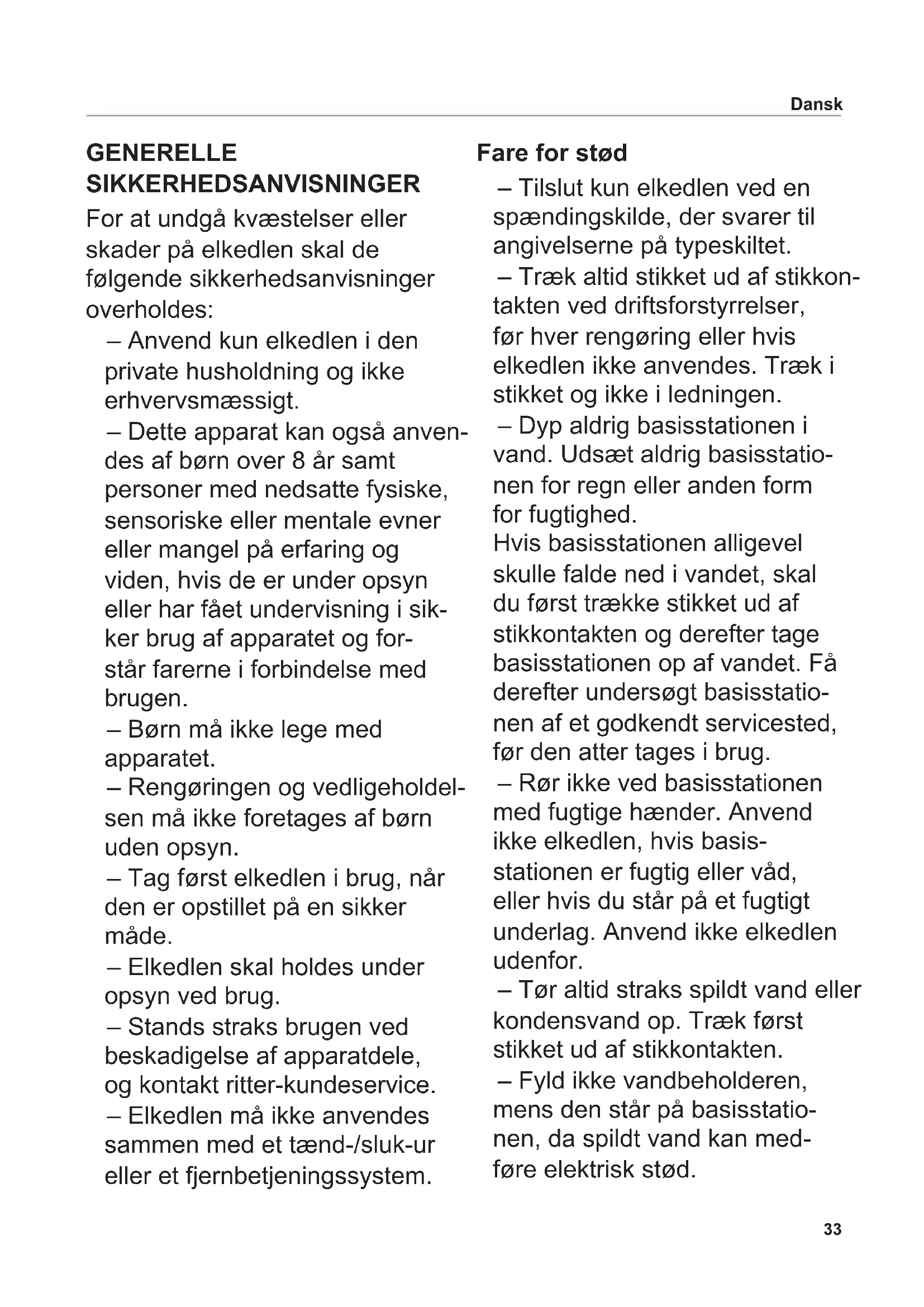 Symbol Význam Označení CE: Výrobek odpovídá platným nařízením Evropské unie. Výrobek byl uveden na trh po 13. srpnu 2005. Nesmí být likvidován s běžným domovním odpadem. Symbol přeškrtnutého kontejneru upozorňuje na nutnost třídění odpadu. Určeno pro kontakt s potravinami Přístroj třídy ochrany I Čeština33 Dansk GENERELLE SIKKERHEDSANVISNINGER For at undgå kvæstelser eller skader på elkedlen skal de følgende sikkerhedsanvisninger overholdes: – Anvend kun elkedlen i den private husholdning og ikke erhvervsmæssigt. – Dette apparat kan også anven- des af børn over 8 år samt personer med nedsatte fysiske, sensoriske eller mentale evner eller mangel på erfaring og viden, hvis de er under opsyn eller har fået undervisning i sik- ker brug af apparatet og for- står farerne i forbindelse med brugen. – Børn må ikke lege med apparatet. – Rengøringen og vedligeholdel- sen må ikke foretages af børn uden opsyn. – Tag først elkedlen i brug, når den er opstillet på en sikker måde. – Elkedlen skal holdes under opsyn ved brug. – Stands straks brugen ved beskadigelse af apparatdele, og kontakt ritter-kundeservice. – Elkedlen må ikke anvendes sammen med et tænd-/sluk-ur eller et fjernbetjeningssystem. Fare for stød – Tilslut kun elkedlen ved en spændingskilde, der svarer til angivelserne på typeskiltet. – Træk altid stikket ud af stikkon- takten ved driftsforstyrrelser, før hver rengøring eller hvis elkedlen ikke anvendes. Træk i stikket og ikke i ledningen. – Dyp aldrig basisstationen i vand. Udsæt aldrig basisstatio- nen for regn eller anden form for fugtighed. Hvis basisstationen alligevel skulle falde ned i vandet, skal du først trække stikket ud af stikkontakten og derefter tage basisstationen op af vandet. Få derefter undersøgt basisstatio- nen af et godkendt servicested, før den atter tages i brug. – Rør ikke ved basisstationen med fugtige hænder. Anvend ikke elkedlen, hvis basis- stationen er fugtig eller våd, eller hvis du står på et fugtigt underlag. Anvend ikke elkedlen udenfor. – Tør altid straks spildt vand eller kondensvand op. Træk først stikket ud af stikkontakten. – Fyld ikke vandbeholderen, mens den står på basisstatio- nen, da spildt vand kan med- føre elektrisk stød.34 Dansk – Anvend kun elkedlen, når net- ledningen, basisstationen og vandbeholderen ikke har syn- lige skader. Hvis netledningen er beskadiget, skal den udskif- tes af producenten, kundeservi- cen eller lignende, kvalicerede personer, så farer undgås. – Arbejd aldrig med metalgen- stande på basisstationen. – Anvend kun elkedlen med den tilhørende basisstation (type fontana