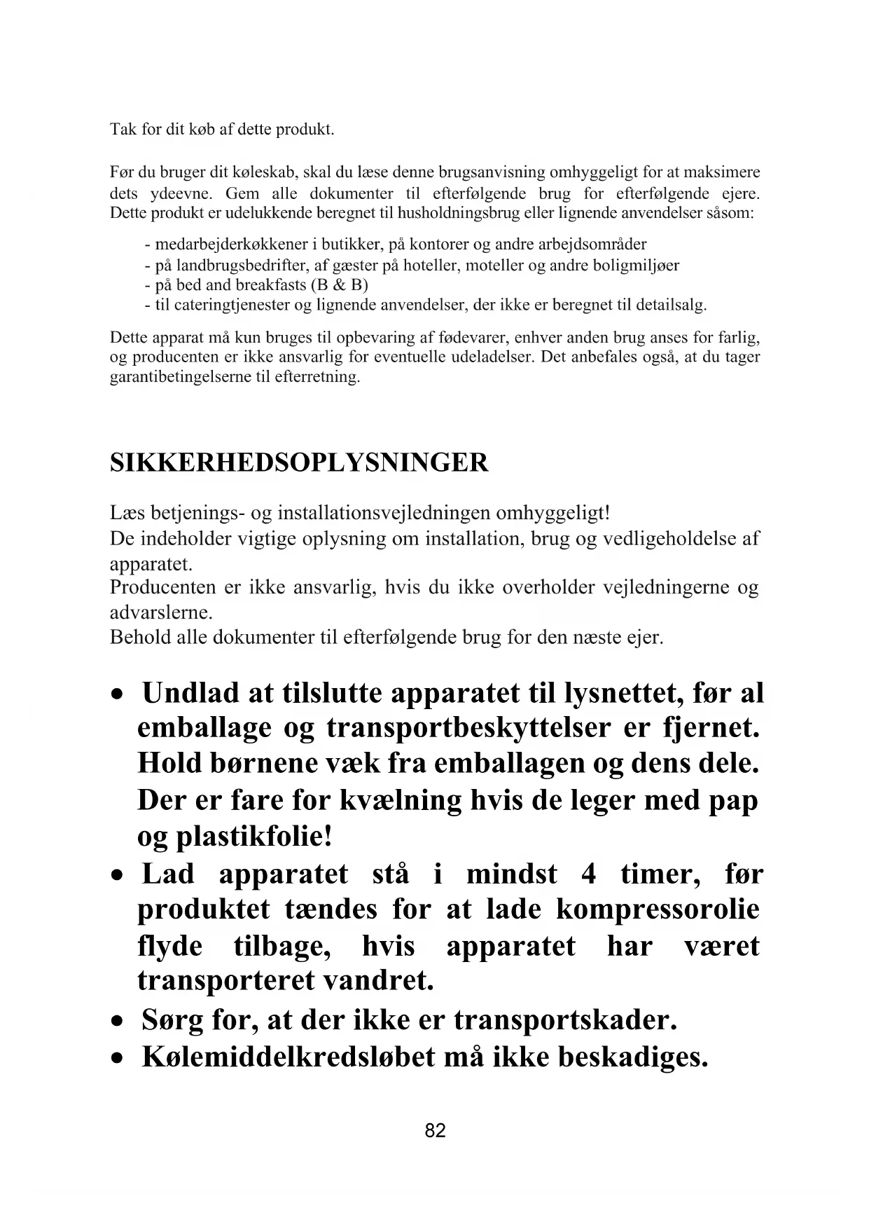 - Fejlfinding 8182 Tak for dit køb af dette produkt. Før du bruger dit køleskab, skal du læse denne brugsanvisning omhyggeligt for at maksimere dets ydeevne. Gem alle dokumenter til efterfølgende brug for efterfølgende ejere. Dette produkt er udelukkende beregnet til husholdningsbrug eller lignende anvendelser såsom: - medarbejderkøkkener i butikker, på kontorer og andre arbejdsområder - på landbrugsbedrifter, af gæster på hoteller, moteller og andre boligmiljøer - på bed and breakfasts (B & B) - til cateringtjenester og lignende anvendelser, der ikke er beregnet til detailsalg. Dette apparat må kun bruges til opbevaring af fødevarer, enhver anden brug anses for farlig, og producenten er ikke ansvarlig for eventuelle udeladelser. Det anbefales også, at du tager garantibetingelserne til efterretning. SIKKERHEDSOPLYSNINGER Læs betjenings- og installationsvejledningen omhyggeligt! De indeholder vigtige oplysning om installation, brug og vedligeholdelse af apparatet. Producenten er ikke ansvarlig, hvis du ikke overholder vejledningerne og advarslerne. Behold alle dokumenter til efterfølgende brug for den næste ejer. p. 104