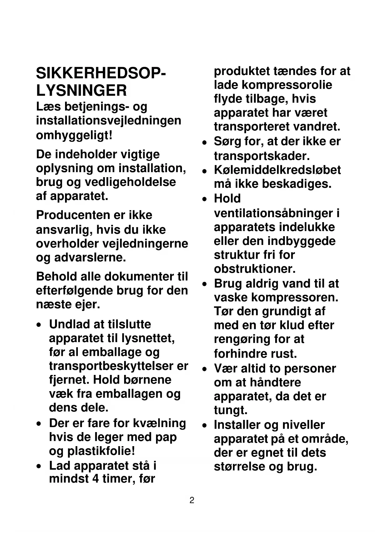 Lad apparatet stå i mindst 4 timer, før produktet tændes for at lade kompressorolie flyde tilbage, hvis apparatet har været transporteret vandret.