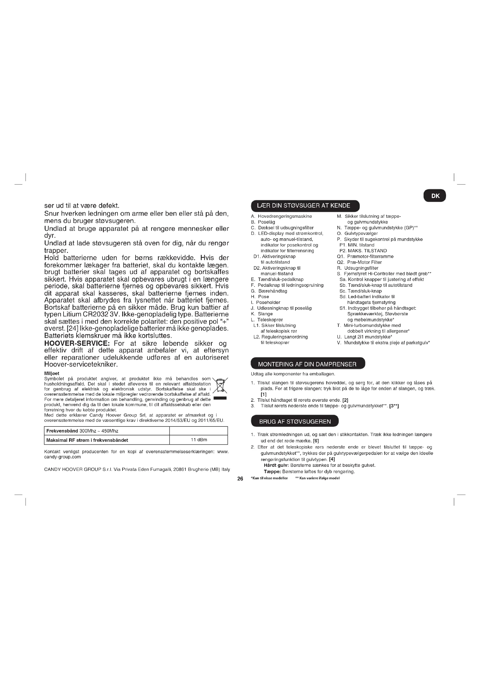 Denne støvsuger må kun anvendes til almindelig husholdningsrengøring, som beskrevet i brugsanvisningen. Du bør sikre dig, at du har forstået indholdet af denne brugervejledning fuldt ud, inden apparatet tages i brug. Efterlad ikke støvsugeren tilsluttet. Inden du rengør eller foretager vedligeholdelse af støvsugeren, skal du altid slukke for den og tage stikket ud af stikkontakten. Dette udstyr kan anvendes af børn, der er 8 år gamle og derover, og af personer med nedsatte fysiske, sensoriske eller mentale evner eller manglende erfaring og viden, hvis de er under opsyn eller vejledning i at bruge udstyret på en sikker måde og forstår de risici, der er involveret. Børn må ikke lege med udstyret. Rengøring og vedligeholdelse må ikke udføres af børn uden en voksen tilstede. Hvis netledningen er ødelagt, skal du stoppe med at bruge støvsugeren øjeblikkeligt. For at undgå en sikkerhedsrisiko, skal en autoriseret HOOVER servicetekniker udskifte strømkablet. Hold hænder, fødder, løstsiddende tøj og hår væk fra roterende børster. Brug kun tilbehør, forbrugsvarer eller reservedele, som anbefalet eller leveret af Hoover. Statisk elektricitet: Visse tæpper kan forårsage en mindre akkumulering af statisk elektricitet. Udledning af statisk elektricitet er ikke sundhedsfarligt. Brug ikke støvsugeren udendørs eller på våde overader eller til opsugning af væsker. Undlad at opsuge hårde eller skarpe genstande, tændstikker, varm aske, cigaretstumper eller andre lignende genstande. Undlad at sprøjte med eller opsuge brændbare væsker, rensevæsker, spraydåser eller spray fra disse. Undlad at køre over strømkablet når du bruger din støvsuger og undlad at trække stikket ud ved at trække i strømkablet, men hold fast i stikket. Lad være med at fortsætte at bruge støvsugeren, hvis den26 ser ud til at være defekt. Snur hverken ledningen om arme eller ben eller stå på den, mens du bruger støvsugeren. Undlad at bruge apparatet på at rengøre mennesker eller dyr. Undlad at lade støvsugeren stå oven for dig, når du rengør trapper. Hold batterierne uden for børns rækkevidde. Hvis der forekommer lækager fra batteriet, skal du kontakte lægen. brugt batterier skal tages ud af apparatet og bortskaffes sikkert. Hvis apparatet skal opbevares ubrugt i en længere periode, skal batterierne fjernes og opbevares sikkert. Hvis dit apparat skal kasseres, skal batterierne fjernes inden. Apparatet skal afbrydes fra lysnettet når batteriet fjernes. Bortskaf batterierne på en sikker måde. Brug kun battier af typen Litium CR2032 3V. Ikke-genopladelig type. Batterierne skal sættes i med den korrekte polaritet: den positive pol “+” øverst. [24] Ikke-genopladelige batterier må ikke genoplades. Batteriets klemskruer må ikke kortsluttes. HOOVER-SERVICE: For at sikre løbende sikker og effektiv drift af dette apparat anbefaler vi, at eftersyn eller reparationer udelukkende udføres af en autoriseret Hoover-servicetekniker. Miljøet Symbolet på produktet angiver, at produktet ikke må behandles som husholdningsaffald. Det skal i stedet aeveres til en relevant affaldsstation for genbrug af elektrisk og elektronisk udstyr. Bortskaffelse skal ske i overensstemmelse med de lokale miljøregler vedrørende bortskaffelse af affald. For mere detaljeret information om behandling, genvinding og genbrug af dette produkt, henvend dig da til den lokale kommune, til dit affaldsselskab eller den forretning hvor du købte produktet. Med dette erklærer Candy Hoover Group Srl, at apparatet er afmærket og i overensstemmelse med de væsentlige krav i direktiverne 2014/53/EU og 2011/65/EU. Kontakt venligst producenten for en kopi af overensstemmelseserklæringen: www. candy-group.com CANDY HOOVER GROUP S.r.l. Via Privata Eden Fumagalli, 20861 Brugherio (MB) Italy