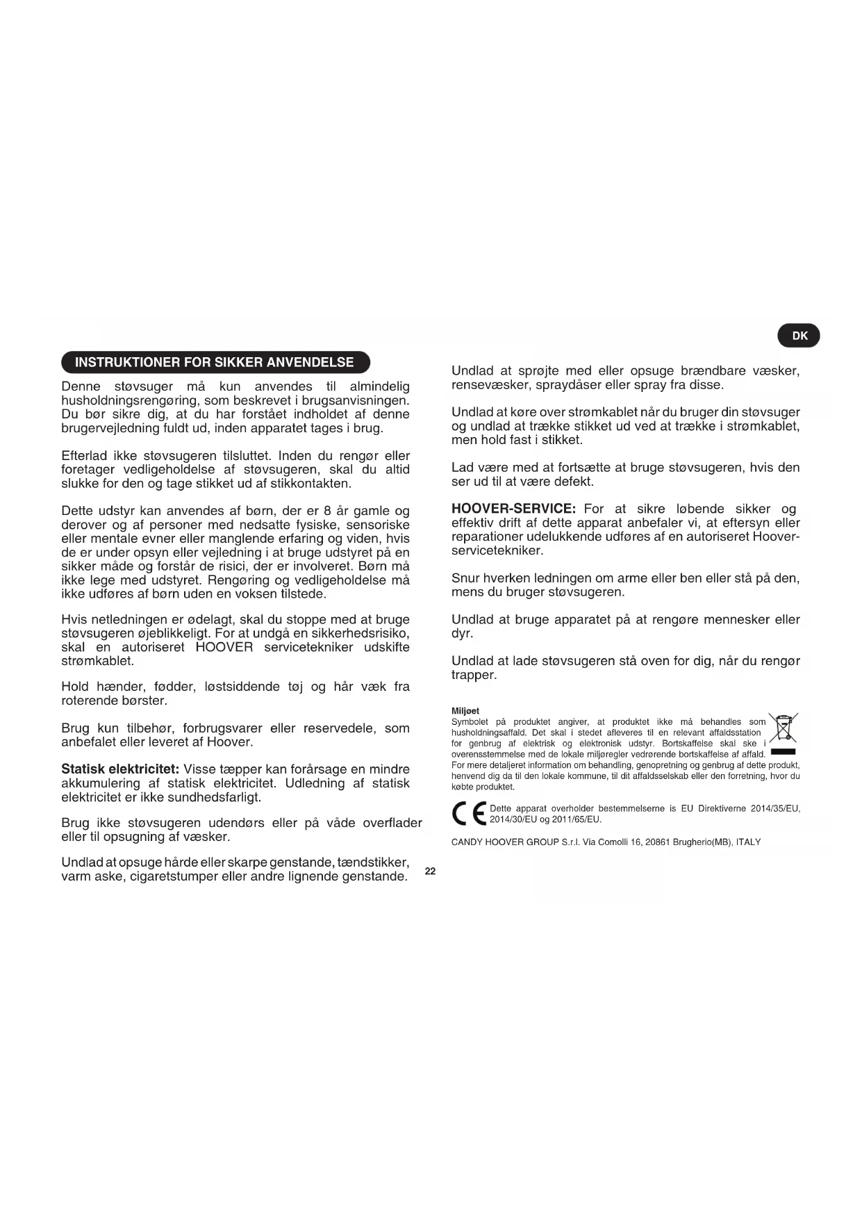 Denne støvsuger må kun anvendes til almindelig husholdningsrengøring, som beskrevet i brugsanvisningen. Du bør sikre dig, at du har forstået indholdet af denne brugervejledning fuldt ud, inden apparatet tages i brug. Efterlad ikke støvsugeren tilsluttet. Inden du rengør eller foretager vedligeholdelse af støvsugeren, skal du altid slukke for den og tage stikket ud af stikkontakten. Dette udstyr kan anvendes af børn, der er 8 år gamle og derover og af personer med nedsatte fysiske, sensoriske eller mentale evner eller manglende erfaring og viden, hvis de er under opsyn eller vejledning i at bruge udstyret på en sikker måde og forstår de risici, der er involveret. Børn må ikke lege med udstyret. Rengøring og vedligeholdelse må ikke udføres af børn uden en voksen tilstede. Hvis netledningen er ødelagt, skal du stoppe med at bruge støvsugeren øjeblikkeligt. For at undgå en sikkerhedsrisiko, skal en autoriseret HOOVER servicetekniker udskifte strømkablet. Hold hænder, fødder, løstsiddende tøj og hår væk fra roterende børster. Brug kun tilbehør, forbrugsvarer eller reservedele, som anbefalet eller leveret af Hoover. Statisk elektricitet: Visse tæpper kan forårsage en mindre akkumulering af statisk elektricitet. Udledning af statisk elektricitet er ikke sundhedsfarligt. Brug ikke støvsugeren udendørs eller på våde overader eller til opsugning af væsker. Undlad at opsuge hårde eller skarpe genstande, tændstikker, varm aske, cigaretstumper eller andre lignende genstande. Undlad at sprøjte med eller opsuge brændbare væsker, rensevæsker, spraydåser eller spray fra disse. Undlad at køre over strømkablet når du bruger din støvsuger og undlad at trække stikket ud ved at trække i strømkablet, men hold fast i stikket. Lad være med at fortsætte at bruge støvsugeren, hvis den ser ud til at være defekt. HOOVER-SERVICE: For at sikre løbende sikker og effektiv drift af dette apparat anbefaler vi, at eftersyn eller reparationer udelukkende udføres af en autoriseret Hoover- servicetekniker. Snur hverken ledningen om arme eller ben eller stå på den, mens du bruger støvsugeren. Undlad at bruge apparatet på at rengøre mennesker eller dyr. Undlad at lade støvsugeren stå oven for dig, når du rengør trapper. Miljøet Symbolet på produktet angiver, at produktet ikke må behandles som husholdningsaffald. Det skal i stedet aeveres til en relevant affaldsstation for genbrug af elektrisk og elektronisk udstyr. Bortskaffelse skal ske i overensstemmelse med de lokale miljøregler vedrørende bortskaffelse af affald. For mere detaljeret information om behandling, genopretning og genbrug af dette produkt, henvend dig da til den lokale kommune, til dit affaldsselskab eller den forretning, hvor du købte produktet. Dette apparat overholder bestemmelserne is EU Direktiverne 2014/35/EU, 2014/30/EU og 2011/65/EU. CANDY HOOVER GROUP S.r.l. Via Comolli 16, 20861 Brugherio(MB), ITALY DK23 L. Skyder til sugekontrol M. Tæppe- og gulvmundstykke** N. Hovedrengøringsmaskine O. Udløsningknap til poselåg P. Poseholder Q. Præmotor-lterramme R. Præ-Motor Filter S. Udsugningslter T. Mini-turbomundstykke til dyrehår* U. Mini-turbomundstykke til allergener*