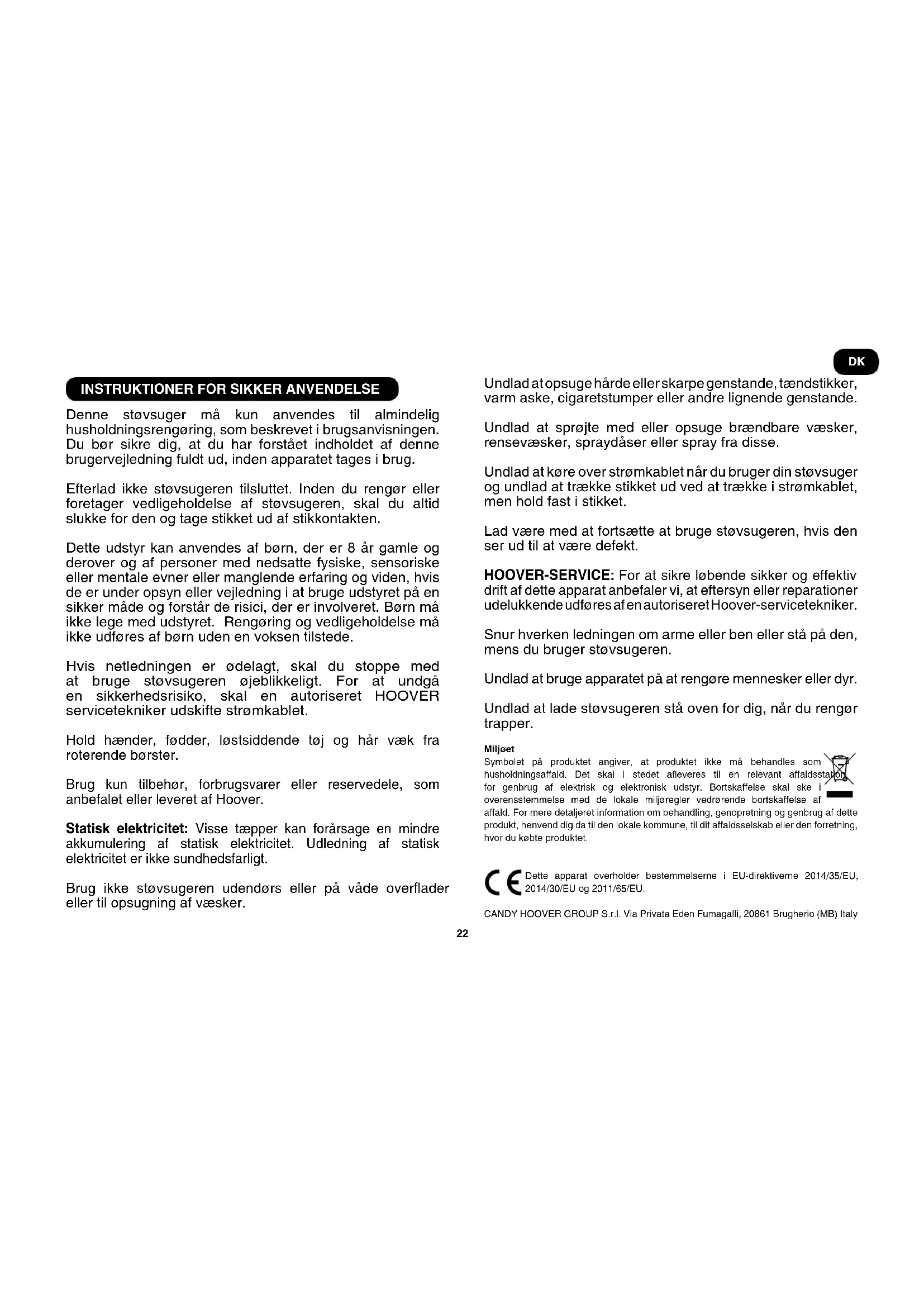 Denne støvsuger må kun anvendes til almindelig husholdningsrengøring, som beskrevet i brugsanvisningen. Du bør sikre dig, at du har forstået indholdet af denne brugervejledning fuldt ud, inden apparatet tages i brug. Efterlad ikke støvsugeren tilsluttet. Inden du rengør eller foretager vedligeholdelse af støvsugeren, skal du altid slukke for den og tage stikket ud af stikkontakten. Dette udstyr kan anvendes af børn, der er 8 år gamle og derover og af personer med nedsatte fysiske, sensoriske eller mentale evner eller manglende erfaring og viden, hvis de er under opsyn eller vejledning i at bruge udstyret på en sikker måde og forstår de risici, der er involveret. Børn må ikke lege med udstyret. Rengøring og vedligeholdelse må ikke udføres af børn uden en voksen tilstede. Hvis netledningen er ødelagt, skal du stoppe med at bruge støvsugeren øjeblikkeligt. For at undgå en sikkerhedsrisiko, skal en autoriseret HOOVER servicetekniker udskifte strømkablet. Hold hænder, fødder, løstsiddende tøj og hår væk fra roterende børster. Brug kun tilbehør, forbrugsvarer eller reservedele, som anbefalet eller leveret af Hoover. Statisk elektricitet: Visse tæpper kan forårsage en mindre akkumulering af statisk elektricitet. Udledning af statisk elektricitet er ikke sundhedsfarligt. Brug ikke støvsugeren udendørs eller på våde overader eller til opsugning af væsker. Undlad at opsuge hårde eller skarpe genstande, tændstikker, varm aske, cigaretstumper eller andre lignende genstande. Undlad at sprøjte med eller opsuge brændbare væsker, rensevæsker, spraydåser eller spray fra disse. Undlad at køre over strømkablet når du bruger din støvsuger og undlad at trække stikket ud ved at trække i strømkablet, men hold fast i stikket. Lad være med at fortsætte at bruge støvsugeren, hvis den ser ud til at være defekt. HOOVER-SERVICE: For at sikre løbende sikker og effektiv drift af dette apparat anbefaler vi, at eftersyn eller reparationer udelukkende udføres af en autoriseret Hoover-servicetekniker. Snur hverken ledningen om arme eller ben eller stå på den, mens du bruger støvsugeren. Undlad at bruge apparatet på at rengøre mennesker eller dyr. Undlad at lade støvsugeren stå oven for dig, når du rengør trapper. Miljøet Symbolet på produktet angiver, at produktet ikke må behandles som husholdningsaffald. Det skal i stedet aeveres til en relevant affaldsstation for genbrug af elektrisk og elektronisk udstyr. Bortskaffelse skal ske i overensstemmelse med de lokale miljøregler vedrørende bortskaffelse af affald. For mere detaljeret information om behandling, genopretning og genbrug af dette produkt, henvend dig da til den lokale kommune, til dit affaldsselskab eller den forretning, hvor du købte produktet. Dette apparat overholder bestemmelserne i EU-direktiverne 2014/35/EU, 2014/30/EU og 2011/65/EU. CANDY HOOVER GROUP S.r.l. Via Privata Eden Fumagalli, 20861 Brugherio (MB) Italy DK23 LÆR DIN STØVSUGER AT KENDE A. Slange B. Poselåg C. Dæksel til udsugningslter D. Hovedrengøringsmaskine E. Bærehåndtag F. Udløsningknap til poselåg G. Mekanisk posekontrolindikator H. Tænd/sluk-pedalknap