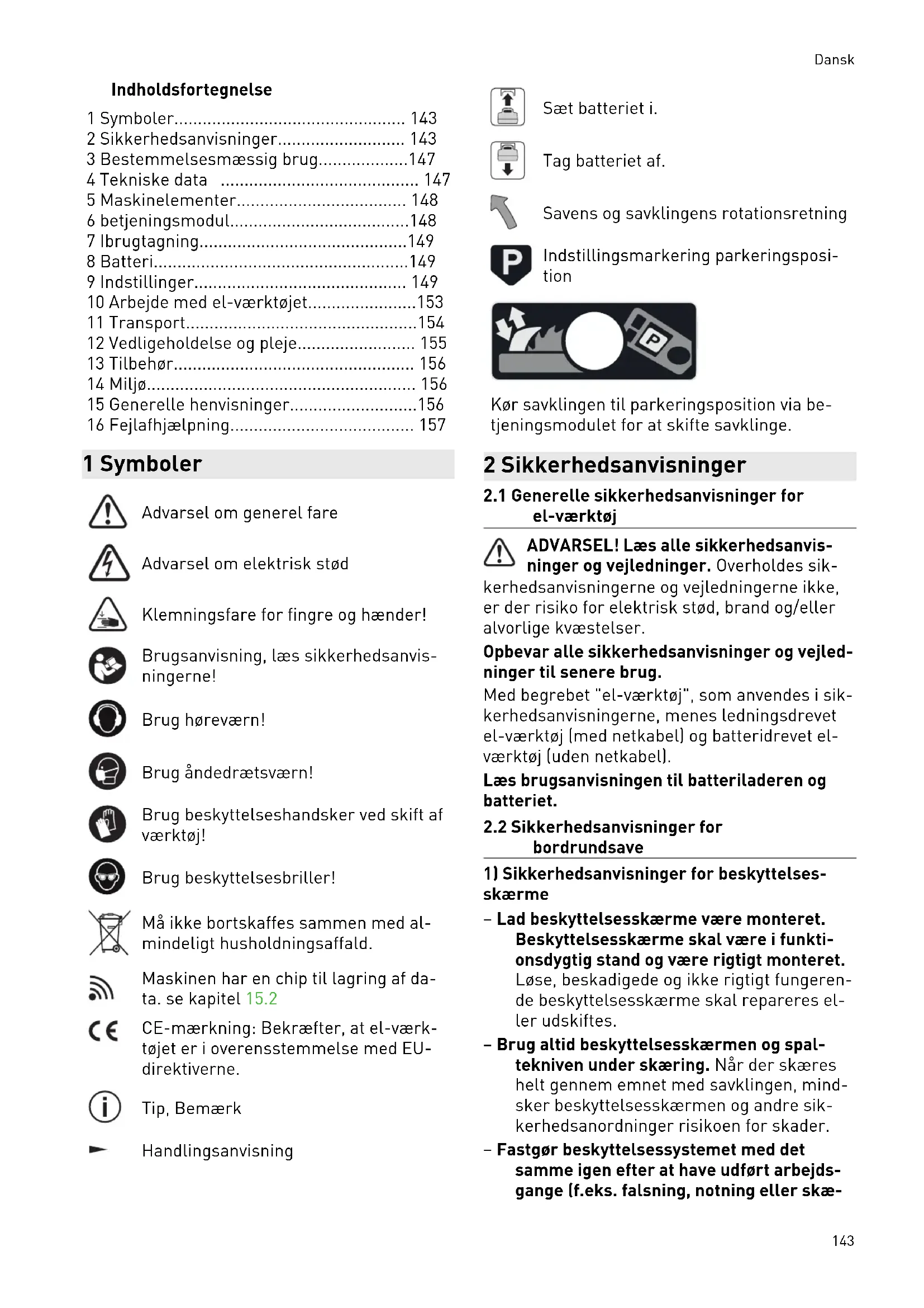 - 16 Fejlafhjælpning 1 Symboler Advarsel om generel fare Advarsel om elektrisk stød Klemningsfare for fingre og hænder! Brugsanvisning, læs sikkerhedsanvis ningerne! Brug høreværn! Brug åndedrætsværn! Brug beskyttelseshandsker ved skift af værktøj! Brug beskyttelsesbriller! Må ikke bortskaffes sammen med al mindeligt husholdningsaffald. Maskinen har en chip til lagring af da ta. se kapitel 15.2 CE-mærkning: Bekræfter, at el-værk tøjet er i overensstemmelse med EU- direktiverne. Tip, Bemærk Handlingsanvisning Sæt batteriet i. Tag batteriet af. Savens og savklingens rotationsretning Indstillingsmarkering parkeringsposi tion Kør savklingen til parkeringsposition via be tjeningsmodulet for at skifte savklinge. 2 Sikkerhedsanvisninger p. 157