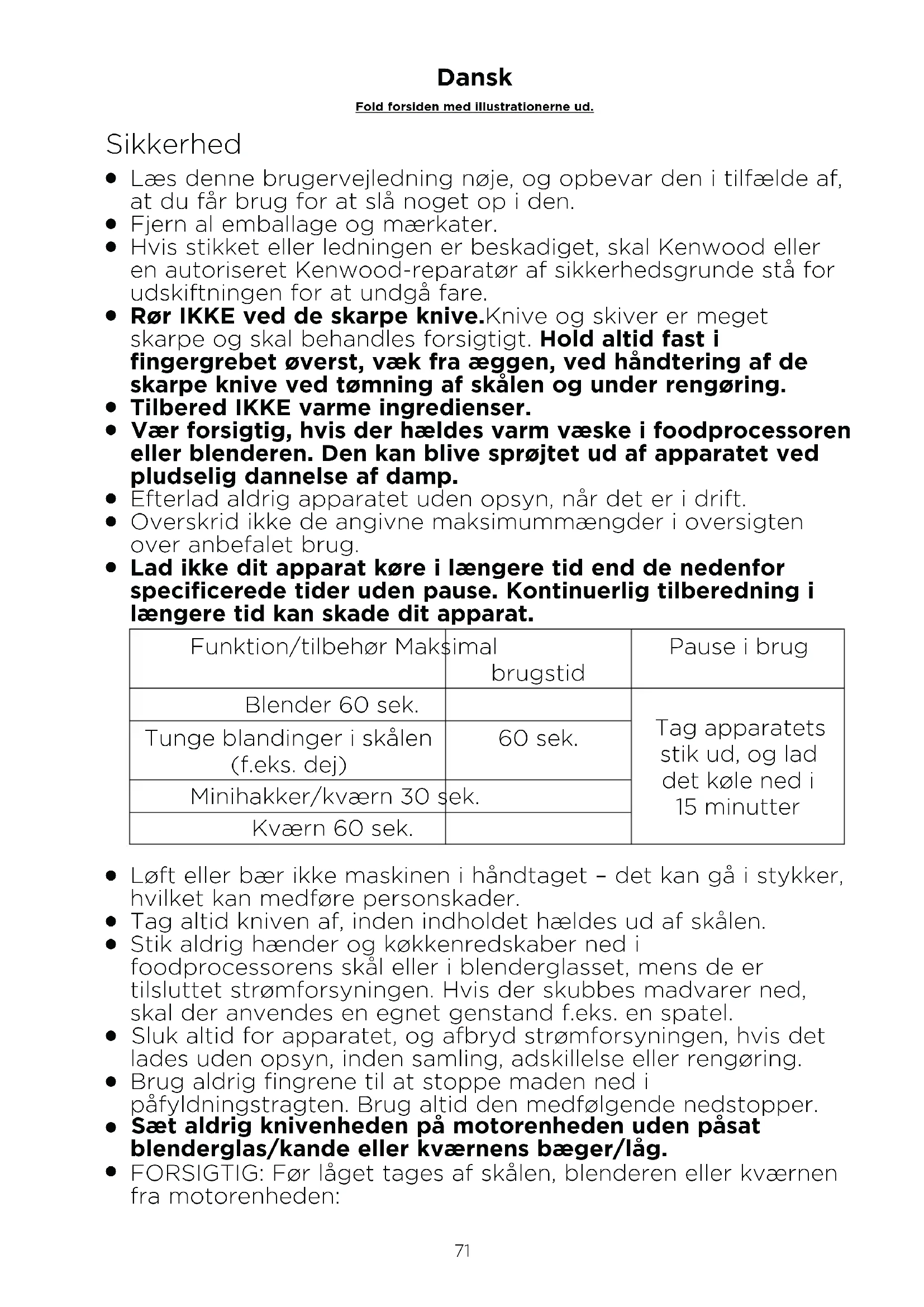 Lad ikke dit apparat køre i længere tid end de nedenfor specificerede tider uden pause. Kontinuerlig tilberedning i længere tid kan skade dit apparat. Funktion/tilbehør Maksimal brugstid Pause i brug Blender 60 sek. Tag apparatets stik ud, og lad det køle ned i 15 minutter Tunge blandinger i skålen (f.eks. dej) 60 sek. Minihakker/kværn 30 sek. Kværn 60 sek.