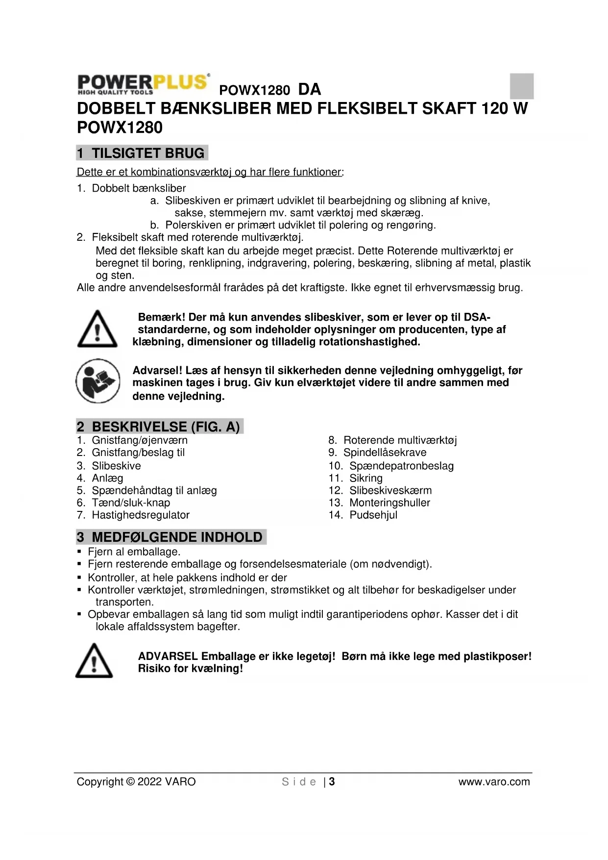 Copyright © 2022 VARO S i d e | 3 www.varo.com DOBBELT BÆNKSLIBER MED FLEKSIBELT SKAFT 120 W POWX1280 1 TILSIGTET BRUG Dette er et kombinationsværktøj og har flere funktioner: