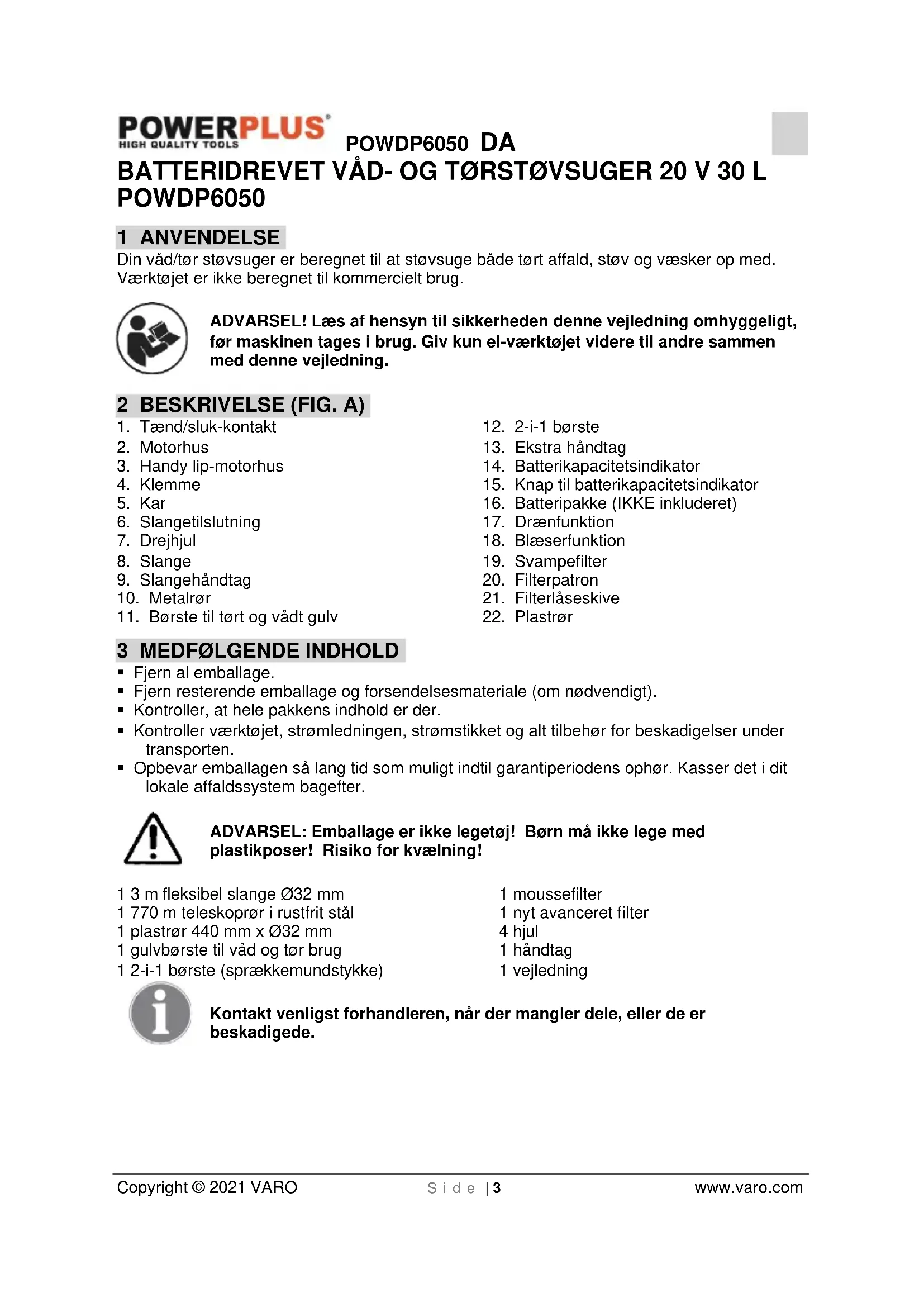 Copyright © 2021 VARO S i d e | 3 www.varo.com BATTERIDREVET VÅD- OG TØRSTØVSUGER 20 V 30 L POWDP6050 1 ANVENDELSE Din våd/tør støvsuger er beregnet til at støvsuge både tørt affald, støv og væsker op med. Værktøjet er ikke beregnet til kommercielt brug. ADVARSEL! Læs af hensyn til sikkerheden denne vejledning omhyggeligt, før maskinen tages i brug. Giv kun el-værktøjet videre til andre sammen med denne vejledning. 2 BESKRIVELSE (FIG. A)