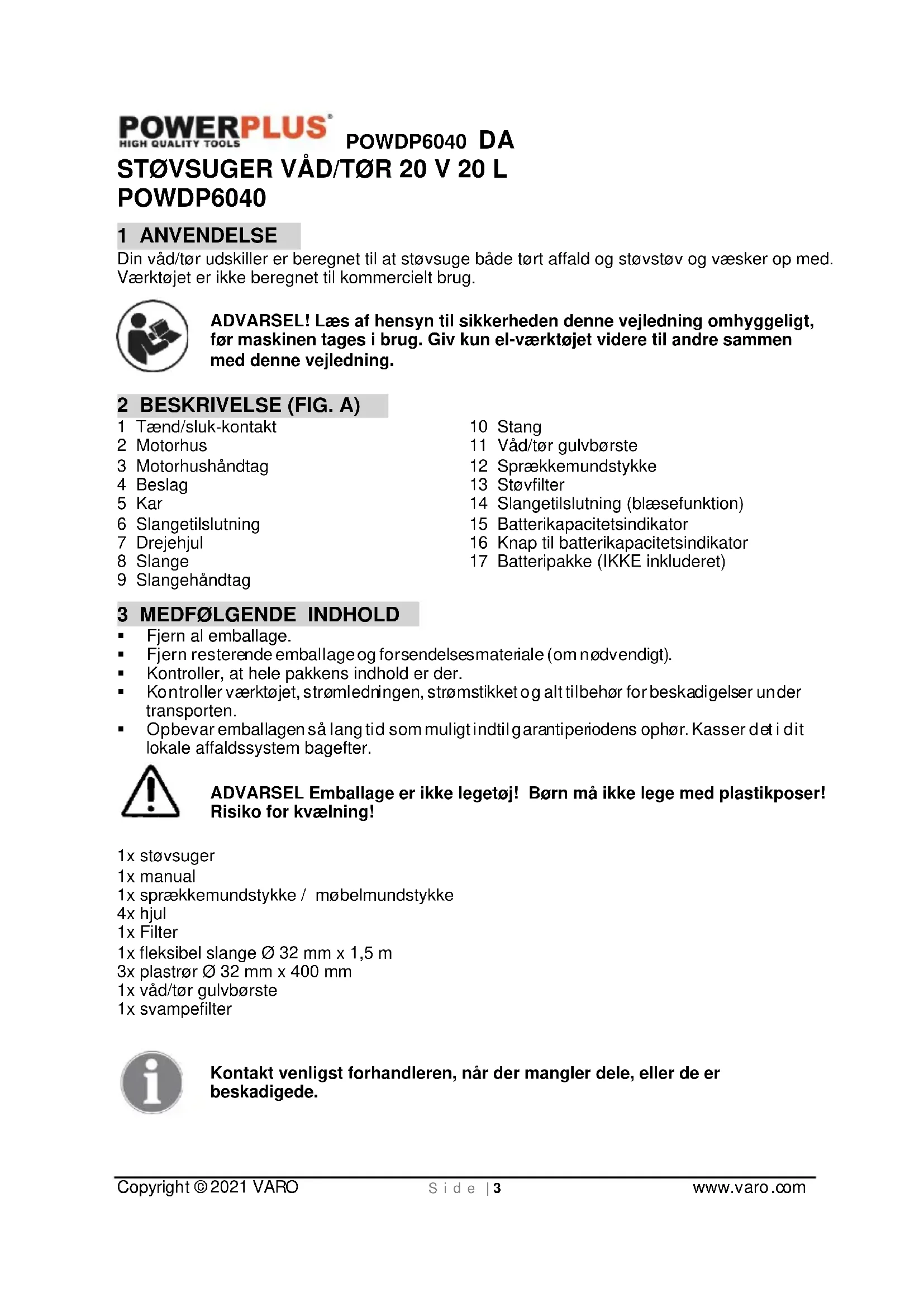 Copyright © 2021 VARO S i d e | 3 www.varo.com STØVSUGER VÅD/TØR 20 V 20 L POWDP6040 1 ANVENDELSE Din våd/tør udskiller er beregnet til at støvsuge både tørt affald og støvstøv og væsker op med. Værktøjet er ikke beregnet til kommercielt brug. ADVARSEL! Læs af hensyn til sikkerheden denne vejledning omhyggeligt, før maskinen tages i brug. Giv kun el-værktøjet videre til andre sammen med denne vejledning. 2 BESKRIVELSE (FIG. A) 1 Tænd/sluk-kontakt 2 Motorhus 3 Motorhushåndtag 4 Beslag 5 Kar 6 Slangetilslutning 7 Drejehjul 8 Slange 9 Slangehåndtag 10 Stang 11 Våd/tør gulvbørste 12 Sprækkemundstykke 13 Støvfilter 14 Slangetilslutning (blæsefunktion) 15 Batterikapacitetsindikator 16 Knap til batterikapacitetsindikator 17 Batteripakke (IKKE inkluderet)