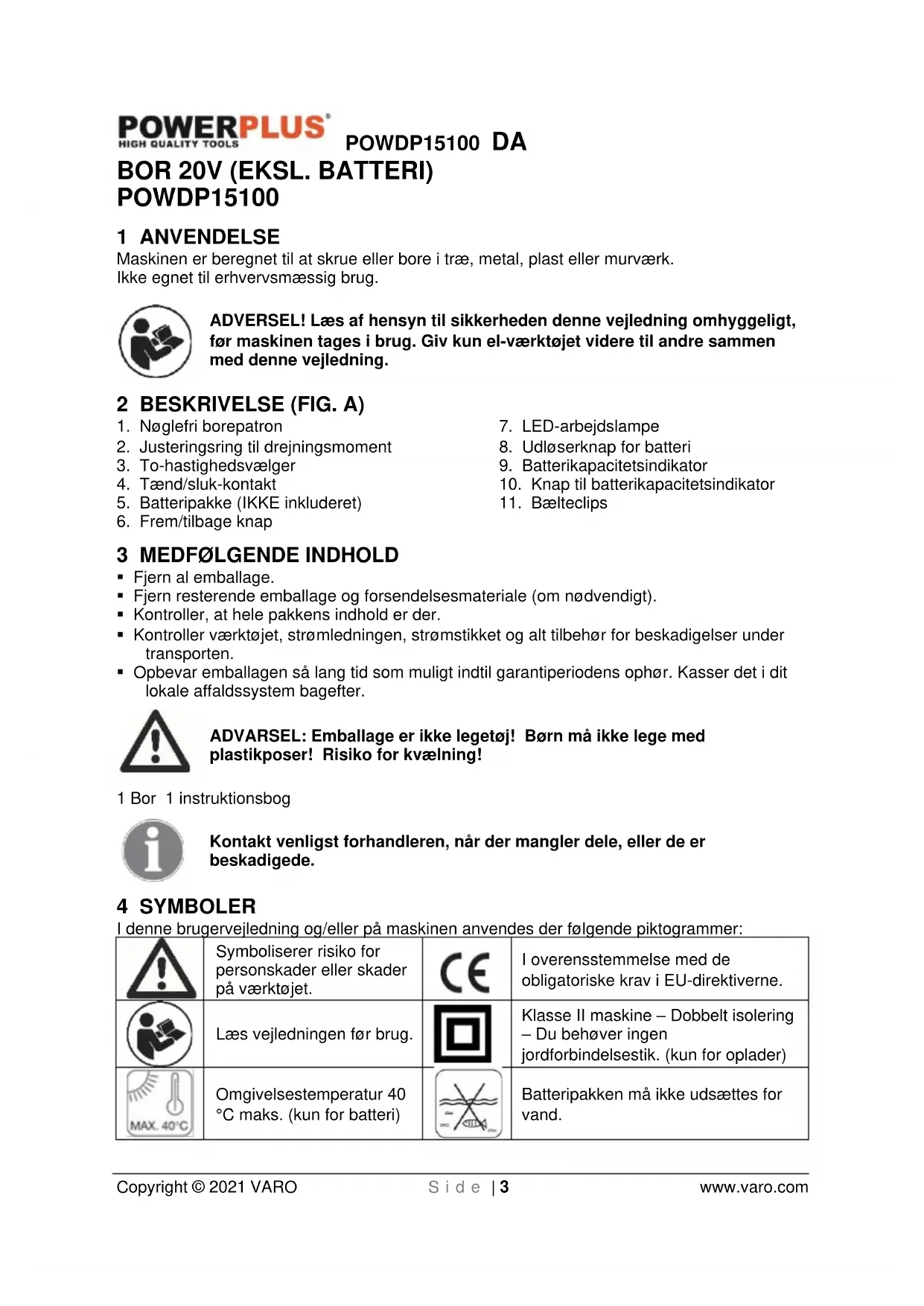 Batteripakken må ikke udsættes for vand.POWDP15100 DA Copyright © 2021 VARO S i d e | 4 www.varo.com