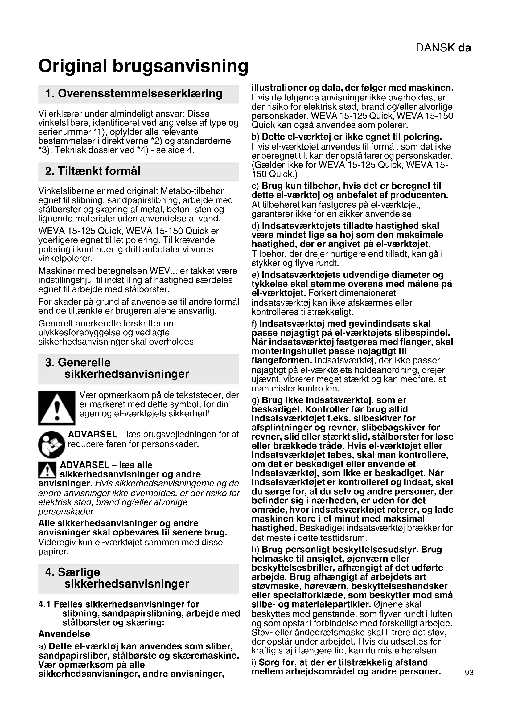 Original brugsanvisning Vi erklærer under almindeligt ansvar: Disse vinkelslibere, identificeret ved angivelse af type og serienummer *1), opfylder alle relevante bestemmelser i direktiverne *2) og standarderne *3). Teknisk dossier ved *4) - se side 4. Vinkelsliberne er med originalt Metabo-tilbehør egnet til slibning, sandpapirslibning, arbejde med stålbørster og skæring af metal, beton, sten og lignende materialer uden anvendelse af vand. WEVA 15-125 Quick, WEVA 15-150 Quick er yderligere egnet til let polering. Til krævende polering i kontinuerlig drift anbefaler vi vores vinkelpolerer. Maskiner med betegnelsen WEV... er takket være indstillingshjul til indstilling af hastighed særdeles egnet til arbejde med stålbørster. For skader på grund af anvendelse til andre formål end de tiltænkte er brugeren alene ansvarlig. Generelt anerkendte forskrifter om ulykkesforebyggelse og vedlagte sikkerhedsanvisninger skal overholdes. Vær opmærksom på de tekststeder, der er markeret med dette symbol, for din egen og el-værktøjets sikkerhed! ADVARSEL – læs brugsvejledningen for at reducere faren for personskader. ADVARSEL – læs alle sikkerhedsanvisninger og andre anvisninger. Hvis sikkerhedsanvisningerne og de andre anvisninger ikke overholdes, er der risiko for elektrisk stød, brand og/eller alvorlige personskader. Alle sikkerhedsanvisninger og andre anvisninger skal opbevares til senere brug. Videregiv kun el-værktøjet sammen med disse papirer.