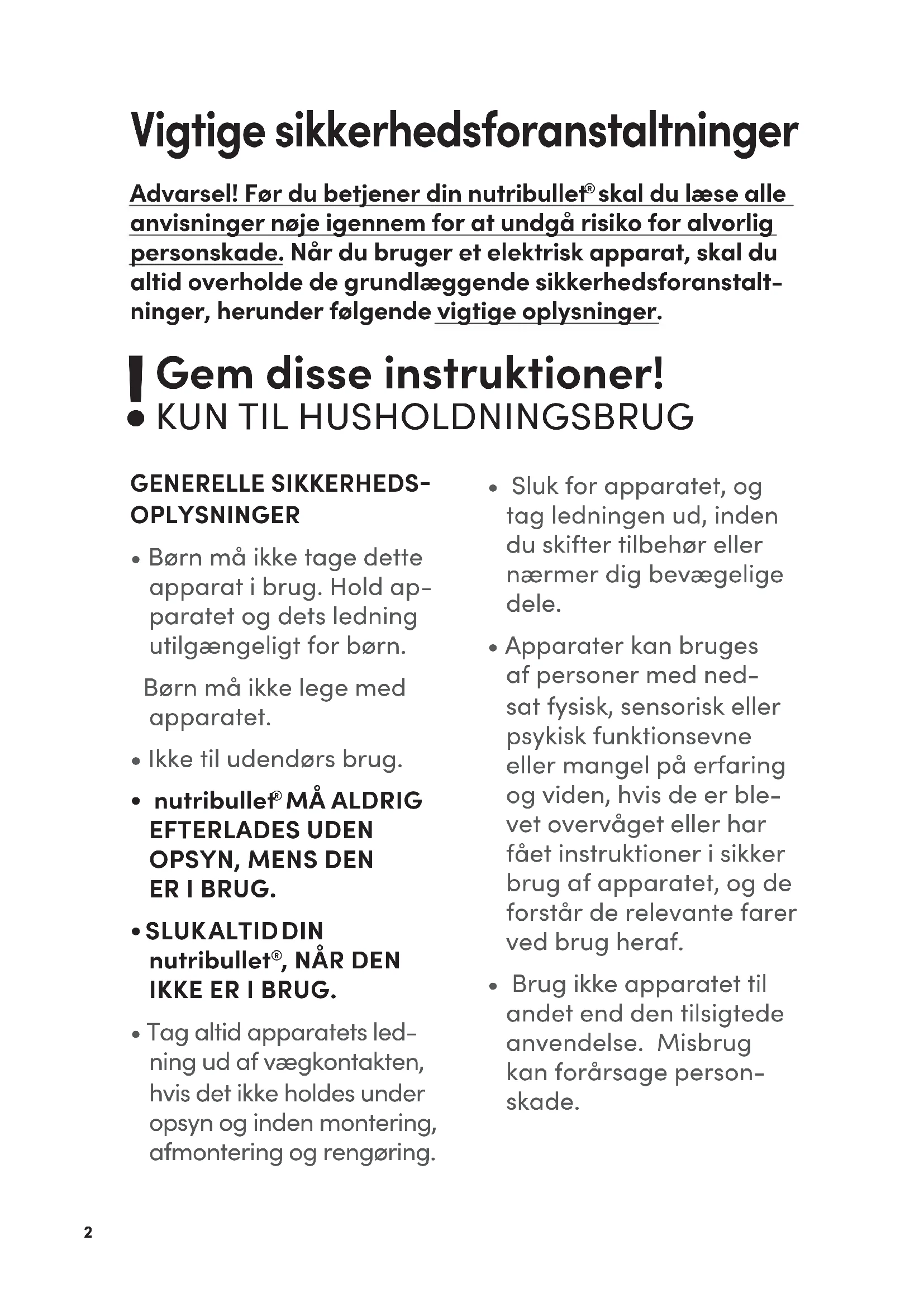 - Tag altid apparatets led- ning ud af vægkontakten, hvis det ikke holdes under opsyn og inden montering, afmontering og rengøring. Vigtige sikkerhedsforanstaltninger Advarsel! Før du betjener din nutribullet