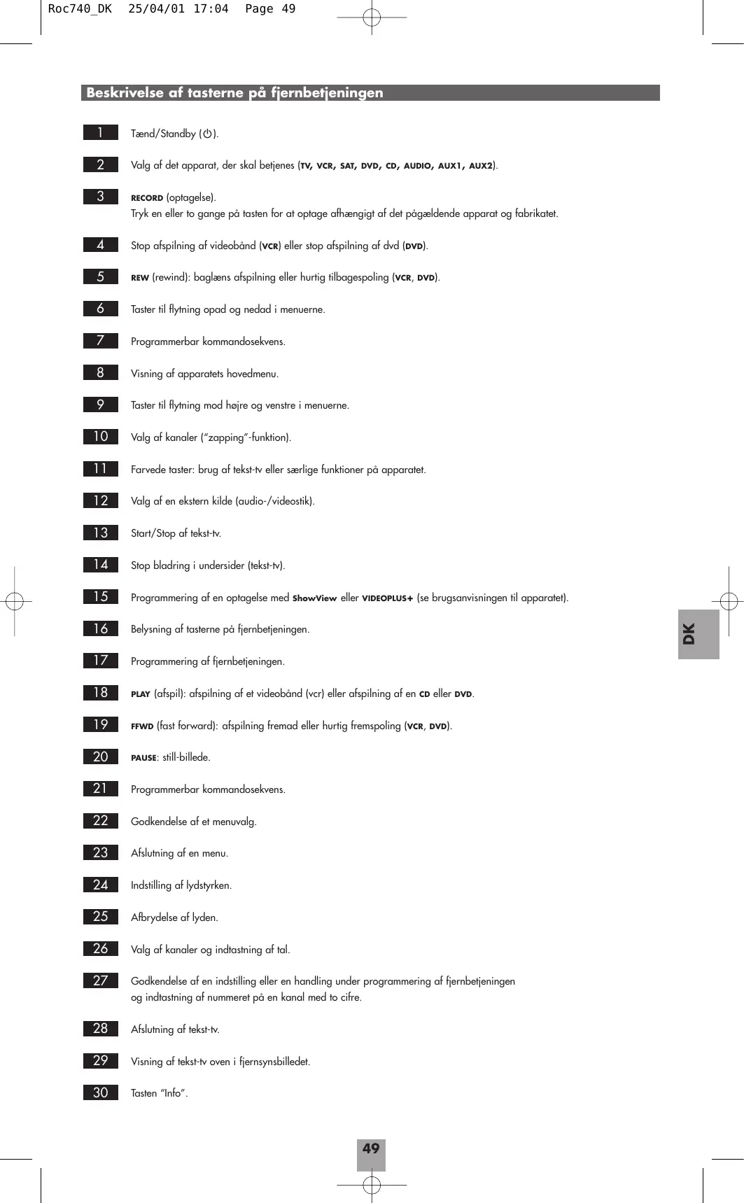 Roc740_DK 25/04/01 17:04 Page 50 Fjernbetjeningens funktioner Fjernbetjeningen ROC 740 er en universal fjernbetjening, der kan bruges sammen med de fleste gængse audio- og videoapparater, f.eks. fjernsyn, videobåndoptager, satellitmodtager, stereoanlæg, cd- eller dvd-afspiller mv. Denne fjernbetjening kan erstatte op til 8 andre fjernbetjeninger. Følgende 8 taster (2) bruges til at vælge det apparat, der skal betjenes: VCR SAT DVD AUDIO AUX1 AUX2