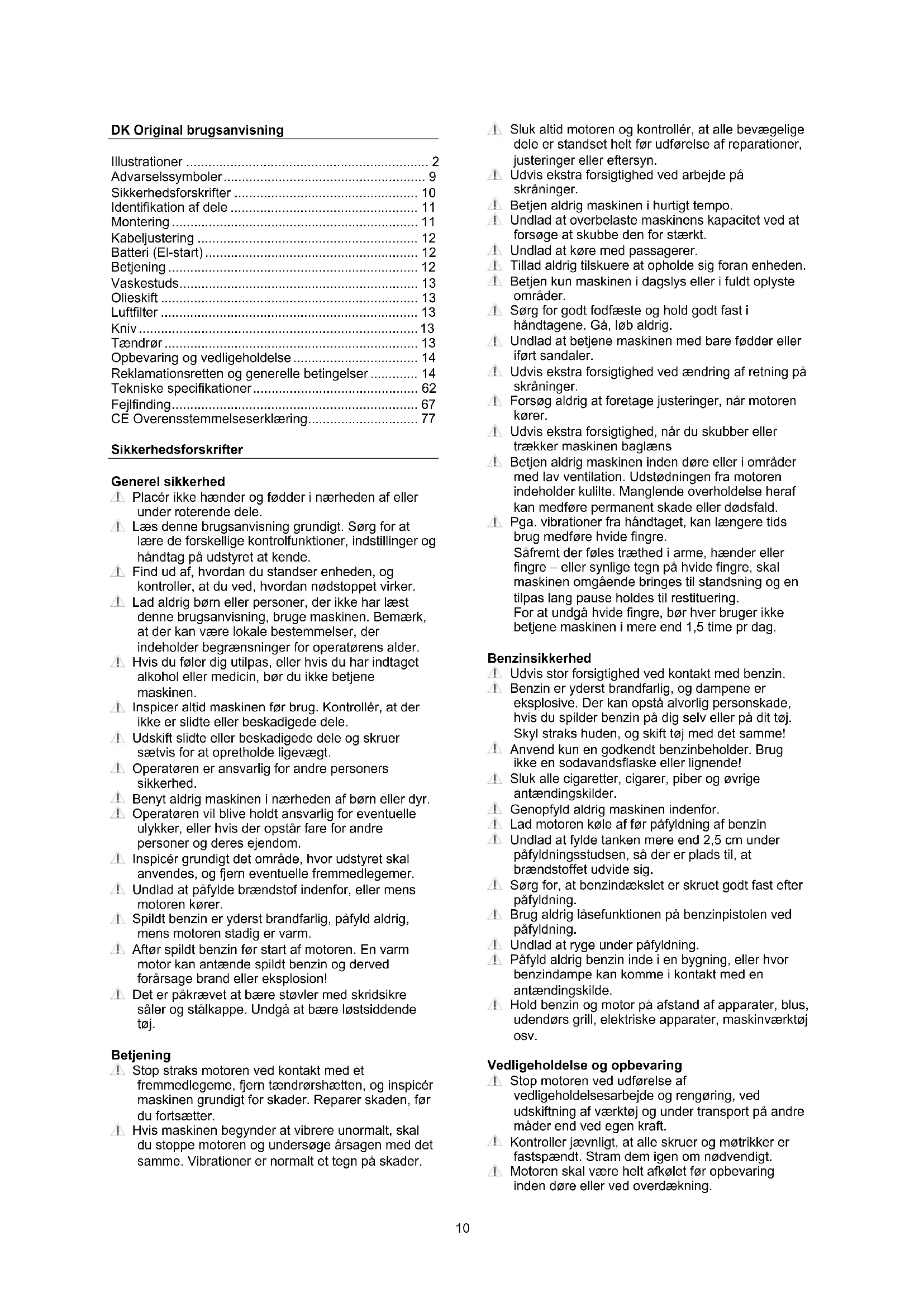 - CE Overensstemmelseserklæring Sikkerhedsforskrifter Generel sikkerhed Placér ikke hænder og fødder i nærheden af eller under roterende dele. Læs denne brugsanvisning grundigt. Sørg for at lære de forskellige kontrolfunktioner, indstillinger og håndtag på udstyret at kende. Find ud af, hvordan du standser enheden, og kontroller, at du ved, hvordan nødstoppet virker. Lad aldrig børn eller personer, der ikke har læst denne brugsanvisning, bruge maskinen. Bemærk, at der kan være lokale bestemmelser, der indeholder begrænsninger for operatørens alder. Hvis du føler dig utilpas, eller hvis du har indtaget alkohol eller medicin, bør du ikke betjene maskinen. Inspicer altid maskinen før brug. Kontrollér, at der ikke er slidte eller beskadigede dele. Udskift slidte eller beskadigede dele og skruer sætvis for at opretholde ligevægt. Operatøren er ansvarlig for andre personers sikkerhed. Benyt aldrig maskinen i nærheden af børn eller dyr. Operatøren vil blive holdt ansvarlig for eventuelle ulykker, eller hvis der opstår fare for andre personer og deres ejendom. Inspicér grundigt det område, hvor udstyret skal anvendes, og fjern eventuelle fremmedlegemer. Undlad at påfylde brændstof indenfor, eller mens motoren kører. Spildt benzin er yderst brandfarlig, påfyld aldrig, mens motoren stadig er varm. Aftør spildt benzin før start af motoren. En varm motor kan antænde spildt benzin og derved forårsage brand eller eksplosion! Det er påkrævet at bære støvler med skridsikre såler og stålkappe. Undgå at bære løstsiddende tøj. Betjening Stop straks motoren ved kontakt med et fremmedlegeme, fjern tændrørshætten, og inspicér maskinen grundigt for skader. Reparer skaden, før du fortsætter. Hvis maskinen begynder at vibrere unormalt, skal du stoppe motoren og undersøge årsagen med det samme. Vibrationer er normalt et tegn på skader. Sluk altid motoren og kontrollér, at alle bevægelige dele er standset helt før udførelse af reparationer, justeringer eller eftersyn. Udvis ekstra forsigtighed ved arbejde på skråninger. Betjen aldrig maskinen i hurtigt tempo. Undlad at overbelaste maskinens kapacitet ved at forsøge at skubbe den for stærkt. Undlad at køre med passagerer. Tillad aldrig tilskuere at opholde sig foran enheden. Betjen kun maskinen i dagslys eller i fuldt oplyste områder. Sørg for godt fodfæste og hold godt fast i håndtagene. Gå, løb aldrig. Undlad at betjene maskinen med bare fødder eller iført sandaler. Udvis ekstra forsigtighed ved ændring af retning på skråninger. Forsøg aldrig at foretage justeringer, når motoren kører. Udvis ekstra forsigtighed, når du skubber eller trækker maskinen baglæns Betjen aldrig maskinen inden døre eller i områder med lav ventilation. Udstødningen fra motoren indeholder kulilte. Manglende overholdelse heraf kan medføre permanent skade eller dødsfald. Pga. vibrationer fra håndtaget, kan længere tids brug medføre hvide fingre. Såfremt der føles træthed i arme, hænder eller fingre – eller synlige tegn på hvide fingre, skal maskinen omgående bringes til standsning og en tilpas lang pause holdes til restituering. For at undgå hvide fingre, bør hver bruger ikke betjene maskinen i mere end 1,5 time pr dag. Benzinsikkerhed Udvis stor forsigtighed ved kontakt med benzin. Benzin er yderst brandfarlig, og dampene er eksplosive. Der kan opstå alvorlig personskade, hvis du spilder benzin på dig selv eller på dit tøj. Skyl straks huden, og skift tøj med det samme! Anvend kun en godkendt benzinbeholder. Brug ikke en sodavandsflaske eller lignende! Sluk alle cigaretter, cigarer, piber og øvrige antændingskilder. Genopfyld aldrig maskinen indenfor. Lad motoren køle af før påfyldning af benzin Undlad at fylde tanken mere end 2,5 cm under påfyldningsstudsen, så der er plads til, at brændstoffet udvide sig. Sørg for, at benzindækslet er skruet godt fast efter påfyldning. Brug aldrig låsefunktionen på benzinpistolen ved påfyldning. Undlad at ryge under påfyldning. Påfyld aldrig benzin inde i en bygning, eller hvor benzindampe kan komme i kontakt med en antændingskilde. Hold benzin og motor på afstand af apparater, blus, udendørs grill, elektriske apparater, maskinværktøj osv. Vedligeholdelse og opbevaring Stop motoren ved udførelse af vedligeholdelsesarbejde og rengøring, ved udskiftning af værktøj og under transport på andre måder end ved egen kraft. Kontroller jævnligt, at alle skruer og møtrikker er fastspændt. Stram dem igen om nødvendigt. Motoren skal være helt afkølet før opbevaring inden døre eller ved overdækning.11 Hvis maskinen ikke er i brug i en periode, henvises til instrukserne i denne brugsanvisning. Vedligehold eller udskift sikkerheds- og instruktionsmærkater efter behov. Brug kun originale reservedele eller tilbehør. Hvis der ikke anvendes originale dele eller tilbehør, bortfalder garantien. Diverse Der er ikke påfyldt olie på motoren. Tjek altid motor olieniveau før start. Fabriksmonterede styreanordninger, f.eks. koblingskabler monteret på håndtaget, må ikke fjernes eller blotlægges. Tøm kun benzintanken udenfor. Benzin er yderst brandfarlig, og dampene er eksplosive. Kontrollér, at maskinen står ordentligt fast under transport, f.eks. på en ladvogn. p. 77