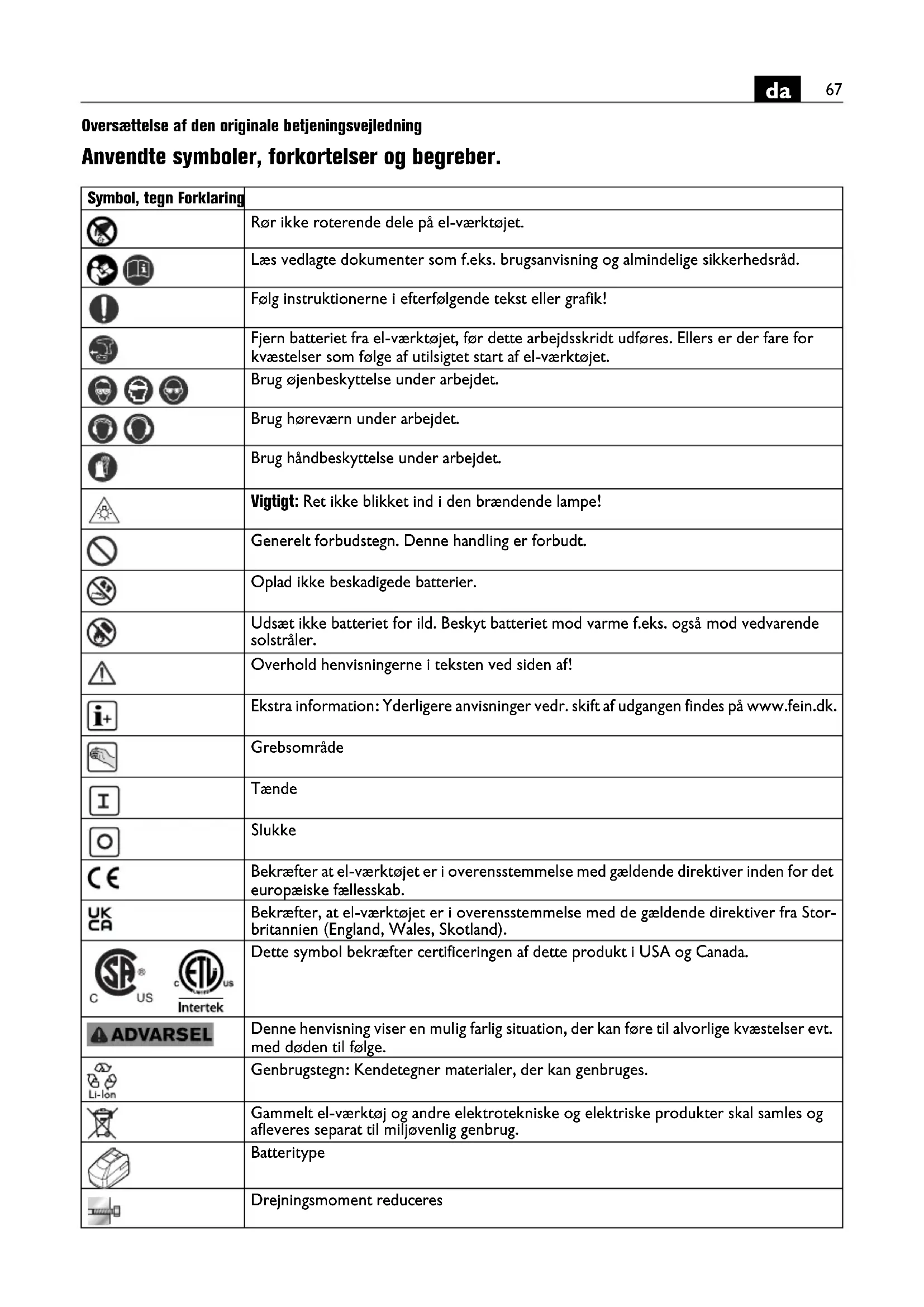 Oversættelse af den originale betjeningsvejledning Anvendte symboler, forkortelser og begreber. Symbol, tegn Forklaring Rør ikke roterende dele på el-værktøjet. Læs vedlagte dokumenter som f.eks. brugsanvisning og almindelige sikkerhedsråd. Følg instruktionerne i efterfølgende tekst eller grafik! Fjern batteriet fra el-værktøjet, før dette arbejdsskridt udføres. Ellers er der fare for kvæstelser som følge af utilsigtet start af el-værktøjet. Brug øjenbeskyttelse under arbejdet. Brug høreværn under arbejdet. Brug håndbeskyttelse under arbejdet. Vigtigt: Ret ikke blikket ind i den brændende lampe! Generelt forbudstegn. Denne handling er forbudt. Oplad ikke beskadigede batterier. Udsæt ikke batteriet for ild. Beskyt batteriet mod varme f.eks. også mod vedvarende solstråler. Overhold henvisningerne i teksten ved siden af! Ekstra information: Yderligere anvisninger vedr. skift af udgangen findes på www.fein.dk. Grebsområde Tænde Slukke Bekræfter at el-værktøjet er i overensstemmelse med gældende direktiver inden for det europæiske fællesskab. Bekræfter, at el-værktøjet er i overensstemmelse med de gældende direktiver fra Stor- britannien (England, Wales, Skotland). Dette symbol bekræfter certificeringen af dette produkt i USA og Canada. Denne henvisning viser en mulig farlig situation, der kan føre til alvorlige kvæstelser evt. med døden til følge. Genbrugstegn: Kendetegner materialer, der kan genbruges. Gammelt el-værktøj og andre elektrotekniske og elektriske produkter skal samles og afleveres separat til miljøvenlig genbrug. Batteritype Drejningsmoment reduceres68