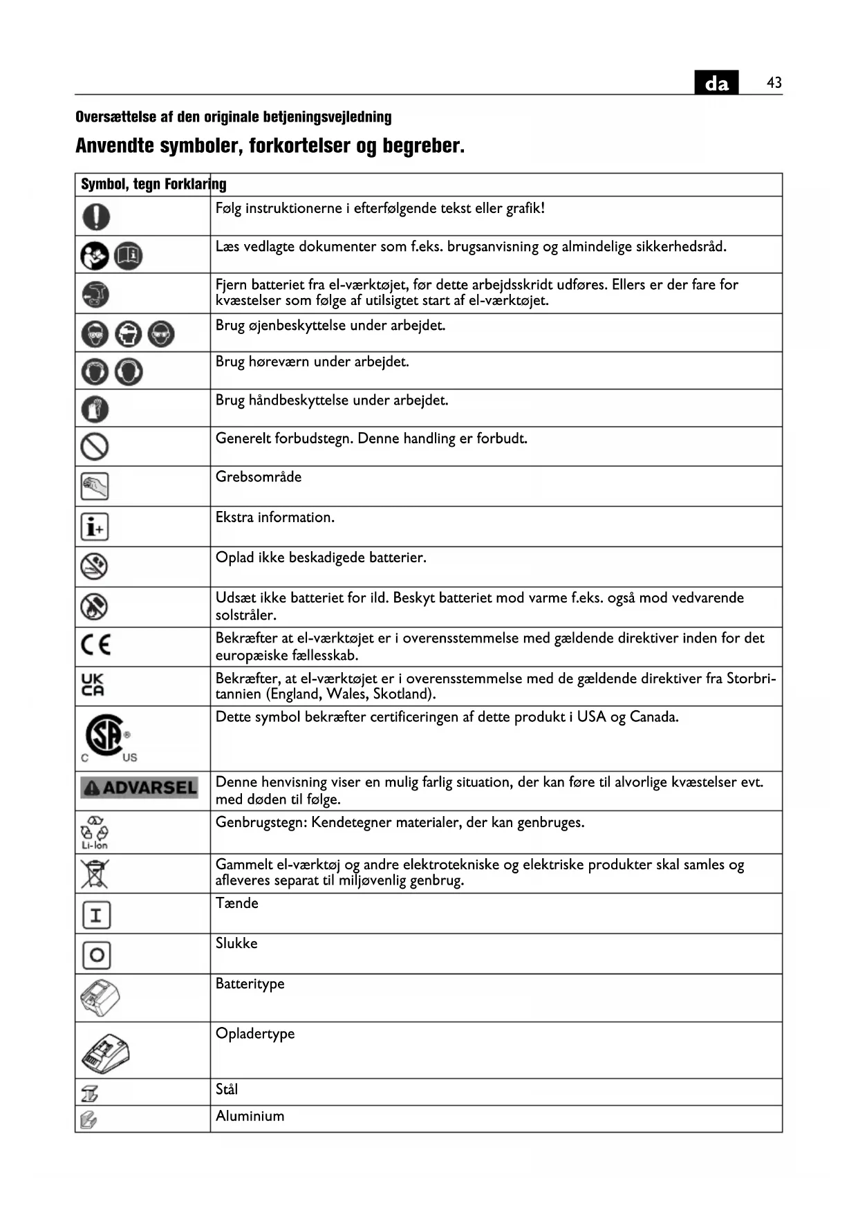 Oversættelse af den originale betjeningsvejledning Anvendte symboler, forkortelser og begreber. Symbol, tegn Forklaring Følg instruktionerne i efterfølgende tekst eller grafik! Læs vedlagte dokumenter som f.eks. brugsanvisning og almindelige sikkerhedsråd. Fjern batteriet fra el-værktøjet, før dette arbejdsskridt udføres. Ellers er der fare for kvæstelser som følge af utilsigtet start af el-værktøjet. Brug øjenbeskyttelse under arbejdet. Brug høreværn under arbejdet. Brug håndbeskyttelse under arbejdet. Generelt forbudstegn. Denne handling er forbudt. Grebsområde Ekstra information. Oplad ikke beskadigede batterier. Udsæt ikke batteriet for ild. Beskyt batteriet mod varme f.eks. også mod vedvarende solstråler. Bekræfter at el-værktøjet er i overensstemmelse med gældende direktiver inden for det europæiske fællesskab. Bekræfter, at el-værktøjet er i overensstemmelse med de gældende direktiver fra Storbri- tannien (England, Wales, Skotland). Dette symbol bekræfter certificeringen af dette produkt i USA og Canada. Denne henvisning viser en mulig farlig situation, der kan føre til alvorlige kvæstelser evt. med døden til følge. Genbrugstegn: Kendetegner materialer, der kan genbruges. Gammelt el-værktøj og andre elektrotekniske og elektriske produkter skal samles og afleveres separat til miljøvenlig genbrug. Tænde Slukke Batteritype Opladertype Stål Aluminium44