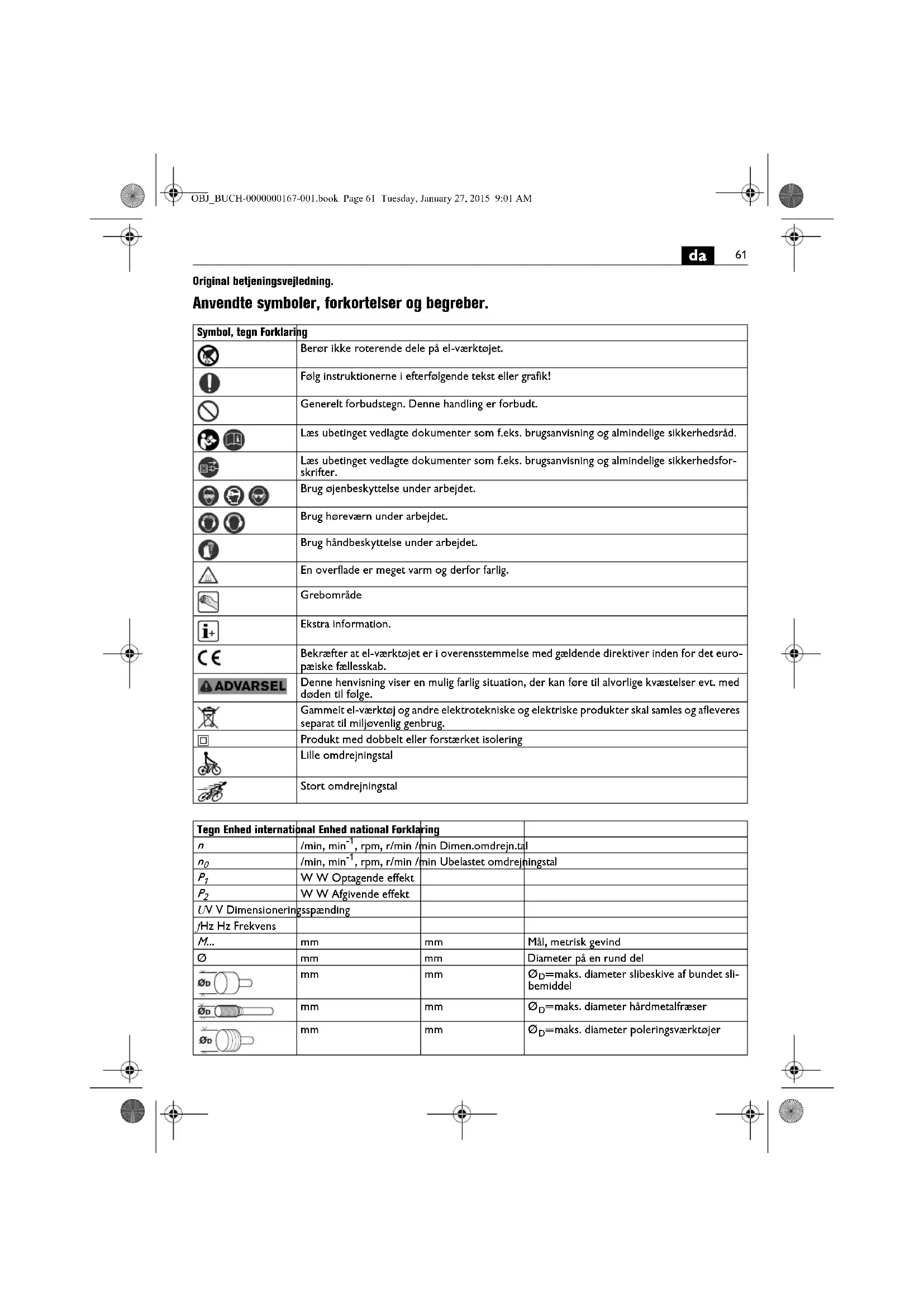 Original betjeningsvejledning. Anvendte symboler, forkortelser og begreber. Symbol, tegn Forklaring Berør ikke roterende dele på el-værktøjet. Følg instruktionerne i efterfølgende tekst eller grafik! Generelt forbudstegn. Denne handling er forbudt. Læs ubetinget vedlagte dokumenter som f.eks. brugsanvisning og almindelige sikkerhedsråd. Læs ubetinget vedlagte dokumenter som f.eks. brugsanvisning og almindelige sikkerhedsfor- skrifter. Brug øjenbeskyttelse under arbejdet. Brug høreværn under arbejdet. Brug håndbeskyttelse under arbejdet. En overflade er meget varm og derfor farlig. Grebområde Ekstra information. Bekræfter at el-værktøjet er i overensstemmelse med gældende direktiver inden for det euro- pæiske fællesskab. Denne henvisning viser en mulig farlig situation, der kan føre til alvorlige kvæstelser evt. med døden til følge. Gammelt el-værktøj og andre elektrotekniske og elektriske produkter skal samles og afleveres separat til miljøvenlig genbrug. Produkt med dobbelt eller forstærket isolering Lille omdrejningstal Stort omdrejningstal Tegn Enhed international Enhed national Forklaring