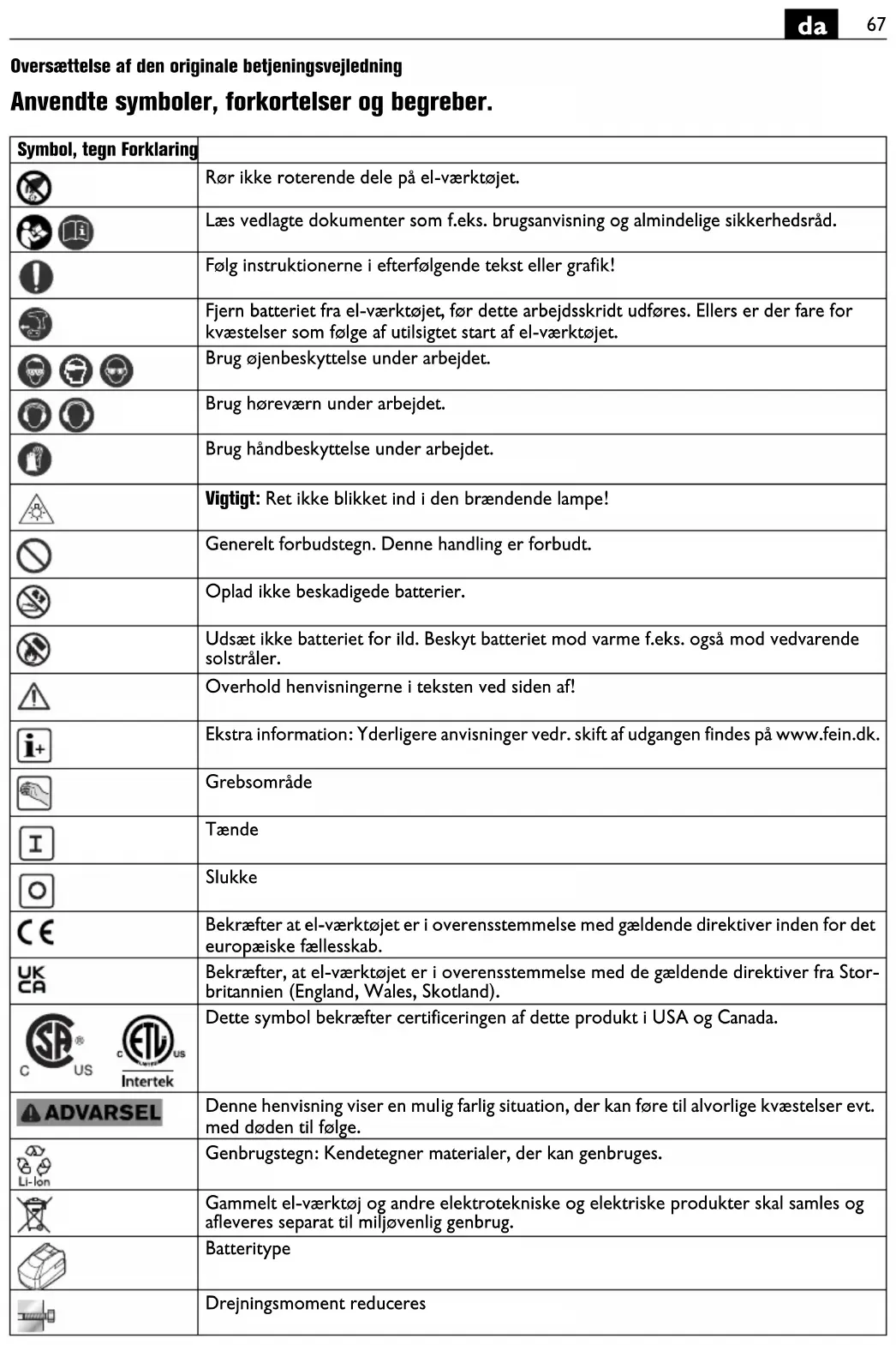 Oversættelse af den originale betjeningsvejledning Anvendte symboler, forkortelser og begreber. Symbol, tegn Forklaring Rør ikke roterende dele på el-værktøjet. Læs vedlagte dokumenter som f.eks. brugsanvisning og almindelige sikkerhedsråd. Følg instruktionerne i efterfølgende tekst eller grafik! Fjern batteriet fra el-værktøjet, før dette arbejdsskridt udføres. Ellers er der fare for kvæstelser som følge af utilsigtet start af el-værktøjet. Brug øjenbeskyttelse under arbejdet. Brug høreværn under arbejdet. Brug håndbeskyttelse under arbejdet. Vigtigt: Ret ikke blikket ind i den brændende lampe! Generelt forbudstegn. Denne handling er forbudt. Oplad ikke beskadigede batterier. Udsæt ikke batteriet for ild. Beskyt batteriet mod varme f.eks. også mod vedvarende solstråler. Overhold henvisningerne i teksten ved siden af! Ekstra information: Yderligere anvisninger vedr. skift af udgangen findes på www.fein.dk. Grebsområde Tænde Slukke Bekræfter at el-værktøjet er i overensstemmelse med gældende direktiver inden for det europæiske fællesskab. Bekræfter, at el-værktøjet er i overensstemmelse med de gældende direktiver fra Stor- britannien (England, Wales, Skotland). Dette symbol bekræfter certificeringen af dette produkt i USA og Canada. Denne henvisning viser en mulig farlig situation, der kan føre til alvorlige kvæstelser evt. med døden til følge. Genbrugstegn: Kendetegner materialer, der kan genbruges. Gammelt el-værktøj og andre elektrotekniske og elektriske produkter skal samles og afleveres separat til miljøvenlig genbrug. Batteritype Drejningsmoment reduceres68