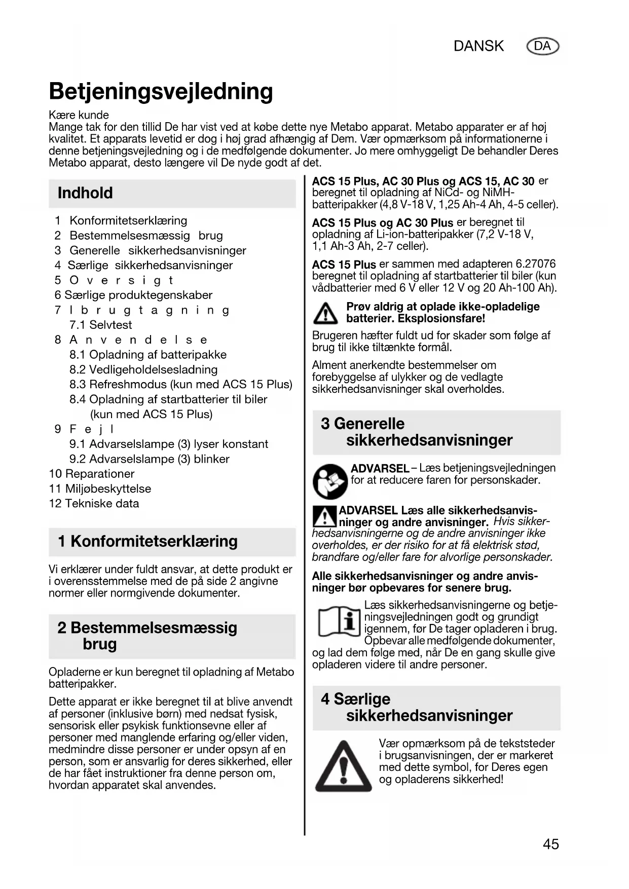 beregnet til opladning af NiCd- og NiMH- batteripakker (4,8 V-18 V, 1,25 Ah-4 Ah, 4-5 celler). ACS 15 Plus og AC 30 Plus er beregnet til opladning af Li-ion-batteripakker (7,2 V-18 V, 1,1 Ah-3 Ah, 2-7 celler). ACS 15 Plus er sammen med adapteren 6.27076 beregnet til opladning af startbatterier til biler (kun vådbatterier med 6 V eller 12 V og 20 Ah-100 Ah). Prøv aldrig at oplade ikke-opladelige batterier. Eksplosionsfare! Brugeren hæfter fuldt ud for skader som følge af brug til ikke tiltænkte formål. Alment anerkendte bestemmelser om forebyggelse af ulykker og de vedlagte sikkerhedsanvisninger skal overholdes. ADVARSEL – Læs betjeningsvejledningen for at reducere faren for personskader. ADVARSEL Læs alle sikkerhedsanvis- ninger og andre anvisninger. Hvis sikker- hedsanvisningerne og de andre anvisninger ikke overholdes, er der risiko for at få elektrisk stød, brandfare og/eller fare for alvorlige personskader. Alle sikkerhedsanvisninger og andre anvis- ninger bør opbevares for senere brug. Læs sikkerhedsanvisningerne og betje- ningsvejledningen godt og grundigt igennem, før De tager opladeren i brug. Opbevar alle medfølgende dokumenter, og lad dem følge med, når De en gang skulle give opladeren videre til andre personer. Vær opmærksom på de tekststeder i brugsanvisningen, der er markeret med dette symbol, for Deres egen og opladerens sikkerhed! Betjeningsvejledning Kære kunde Mange tak for den tillid De har vist ved at købe dette nye Metabo apparat. Metabo apparater er af høj kvalitet. Et apparats levetid er dog i høj grad afhængig af Dem. Vær opmærksom på informationerne i denne betjeningsvejledning og i de medfølgende dokumenter. Jo mere omhyggeligt De behandler Deres Metabo apparat, desto længere vil De nyde godt af det. Indhold 1 Konformitetserklæring 2 Bestemmelsesmæssig brug 3 Generelle sikkerhedsanvisninger 4 Særlige sikkerhedsanvisninger 17024963_0309 ACS 15 AC 30.book Seite 45 Mittwoch, 4. März 2009 4:29 1646 DANSK