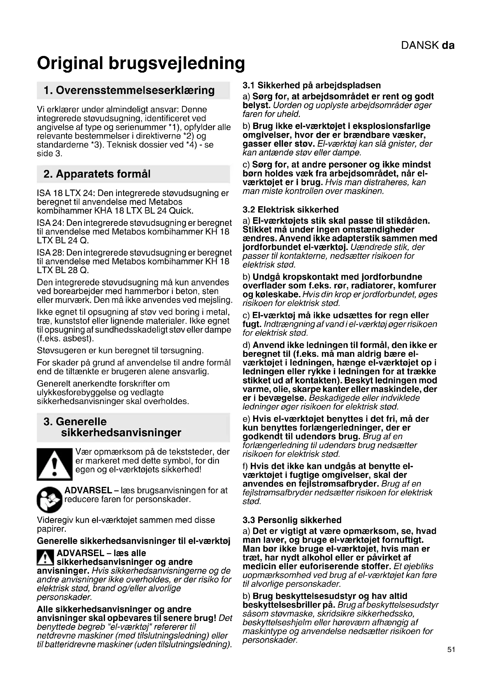 Original brugsvejledning Vi erklærer under almindeligt ansvar: Denne integrerede støvudsugning, identificeret ved angivelse af type og serienummer *1), opfylder alle relevante bestemmelser i direktiverne *2) og standarderne *3). Teknisk dossier ved *4) - se side 3. ISA 18 LTX 24: Den integrerede støvudsugning er beregnet til anvendelse med Metabos kombihammer KHA 18 LTX BL 24 Quick. ISA 24: Den integrerede støvudsugning er beregnet til anvendelse med Metabos kombihammer KH 18 LTX BL 24 Q. ISA 28: Den integrerede støvudsugning er beregnet til anvendelse med Metabos kombihammer KH 18 LTX BL 28 Q. Den integrerede støvudsugning må kun anvendes ved borearbejder med hammerbor i beton, sten eller murværk. Den må ikke anvendes ved mejsling. Ikke egnet til opsugning af støv ved boring i metal, træ, kunststof eller lignende materialer. Ikke egnet til opsugning af sundhedsskadeligt støv eller dampe (f.eks. asbest). Støvsugeren er kun beregnet til tørsugning. For skader på grund af anvendelse til andre formål end de tiltænkte er brugeren alene ansvarlig. Generelt anerkendte forskrifter om ulykkesforebyggelse og vedlagte sikkerhedsanvisninger skal overholdes. Vær opmærksom på de tekststeder, der er markeret med dette symbol, for din egen og el-værktøjets sikkerhed! ADVARSEL – læs brugsanvisningen for at reducere faren for personskader. Videregiv kun el-værktøjet sammen med disse papirer. Generelle sikkerhedsanvisninger til el-værktøj ADVARSEL – læs alle sikkerhedsanvisninger og andre anvisninger. Hvis sikkerhedsanvisningerne og de andre anvisninger ikke overholdes, er der risiko for elektrisk stød, brand og/eller alvorlige personskader. Alle sikkerhedsanvisninger og andre anvisninger skal opbevares til senere brug! Det benyttede begreb "el-værktøj" refererer til netdrevne maskiner (med tilslutningsledning) eller til batteridrevne maskiner (uden tilslutningsledning).