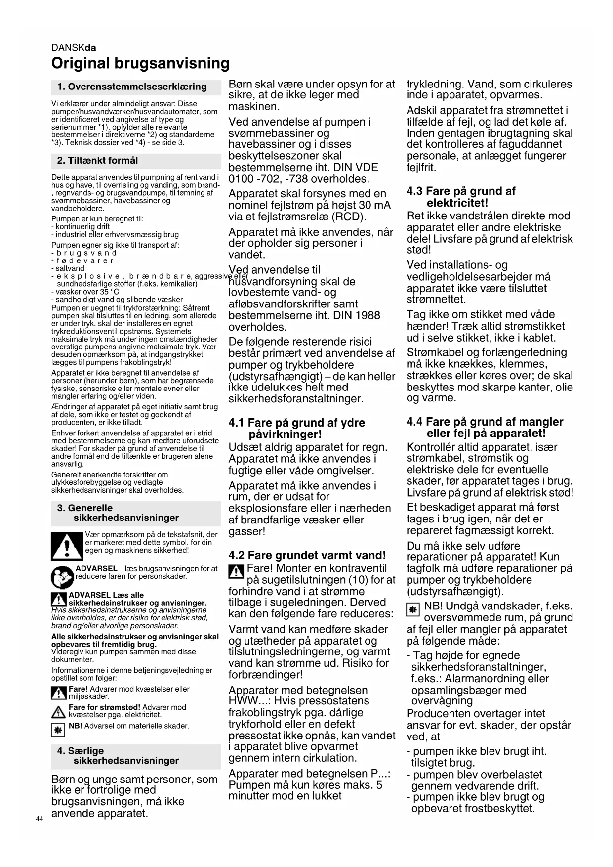 Original brugsanvisning Vi erklærer under almindeligt ansvar: Disse pumper/husvandværker/husvandautomater, som er identificeret ved angivelse af type og serienummer *1), opfylder alle relevante bestemmelser i direktiverne *2) og standarderne *3). Teknisk dossier ved *4) - se side 3. Dette apparat anvendes til pumpning af rent vand i hus og have, til overrisling og vanding, som brønd- , regnvands- og brugsvandpumpe, til tømning af svømmebassiner, havebassiner og vandbeholdere. Pumpen er kun beregnet til: - kontinuerlig drift - industriel eller erhvervsmæssig brug Pumpen egner sig ikke til transport af: -brugsvand -fødevarer - saltvand -eksplosive, brændbare, aggressive eller sundhedsfarlige stoffer (f.eks. kemikalier) - væsker over 35 °C - sandholdigt vand og slibende væsker Pumpen er uegnet til trykforstærkning: Såfremt pumpen skal tilsluttes til en ledning, som allerede er under tryk, skal der installeres en egnet trykreduktionsventil opstrøms. Systemets maksimale tryk må under ingen omstændigheder overstige pumpens angivne maksimale tryk. Vær desuden opmærksom på, at indgangstrykket lægges til pumpens frakoblingstryk! Apparatet er ikke beregnet til anvendelse af personer (herunder børn), som har begrænsede fysiske, sensoriske eller mentale evner eller mangler erfaring og/eller viden. Ændringer af apparatet på eget initiativ samt brug af dele, som ikke er testet og godkendt af producenten, er ikke tilladt. Enhver forkert anvendelse af apparatet er i strid med bestemmelserne og kan medføre uforudsete skader! For skader på grund af anvendelse til andre formål end de tiltænkte er brugeren alene ansvarlig. Generelt anerkendte forskrifter om ulykkesforebyggelse og vedlagte sikkerhedsanvisninger skal overholdes. Vær opmærksom på de tekstafsnit, der er markeret med dette symbol, for din egen og maskinens sikkerhed! ADVARSEL – læs brugsanvisningen for at reducere faren for personskader. ADVARSEL Læs alle sikkerhedsinstrukser og anvisninger. Hvis sikkerhedsinstrukserne og anvisningerne ikke overholdes, er der risiko for elektrisk stød, brand og/eller alvorlige personskader. Alle sikkerhedsinstrukser og anvisninger skal opbevares til fremtidig brug. Videregiv kun pumpen sammen med disse dokumenter. Informationerne i denne betjeningsvejledning er opstillet som følger: Fare! Advarer mod kvæstelser eller miljøskader. Fare for strømstød! Advarer mod kvæstelser pga. elektricitet. NB! Advarsel om materielle skader. Børn og unge samt personer, som ikke er fortrolige med brugsanvisningen, må ikke anvende apparatet. Børn skal være under opsyn for at sikre, at de ikke leger med maskinen. Ved anvendelse af pumpen i svømmebassiner og havebassiner og i disses beskyttelseszoner skal bestemmelserne iht. DIN VDE 0100 -702, -738 overholdes. Apparatet skal forsynes med en nominel fejlstrøm på højst 30 mA via et fejlstrømsrelæ (RCD). Apparatet må ikke anvendes, når der opholder sig personer i vandet. Ved anvendelse til husvandforsyning skal de lovbestemte vand- og afløbsvandforskrifter samt bestemmelserne iht. DIN 1988 overholdes. De følgende resterende risici består primært ved anvendelse af pumper og trykbeholdere (udstyrsafhængigt) – de kan heller ikke udelukkes helt med sikkerhedsforanstaltninger.
