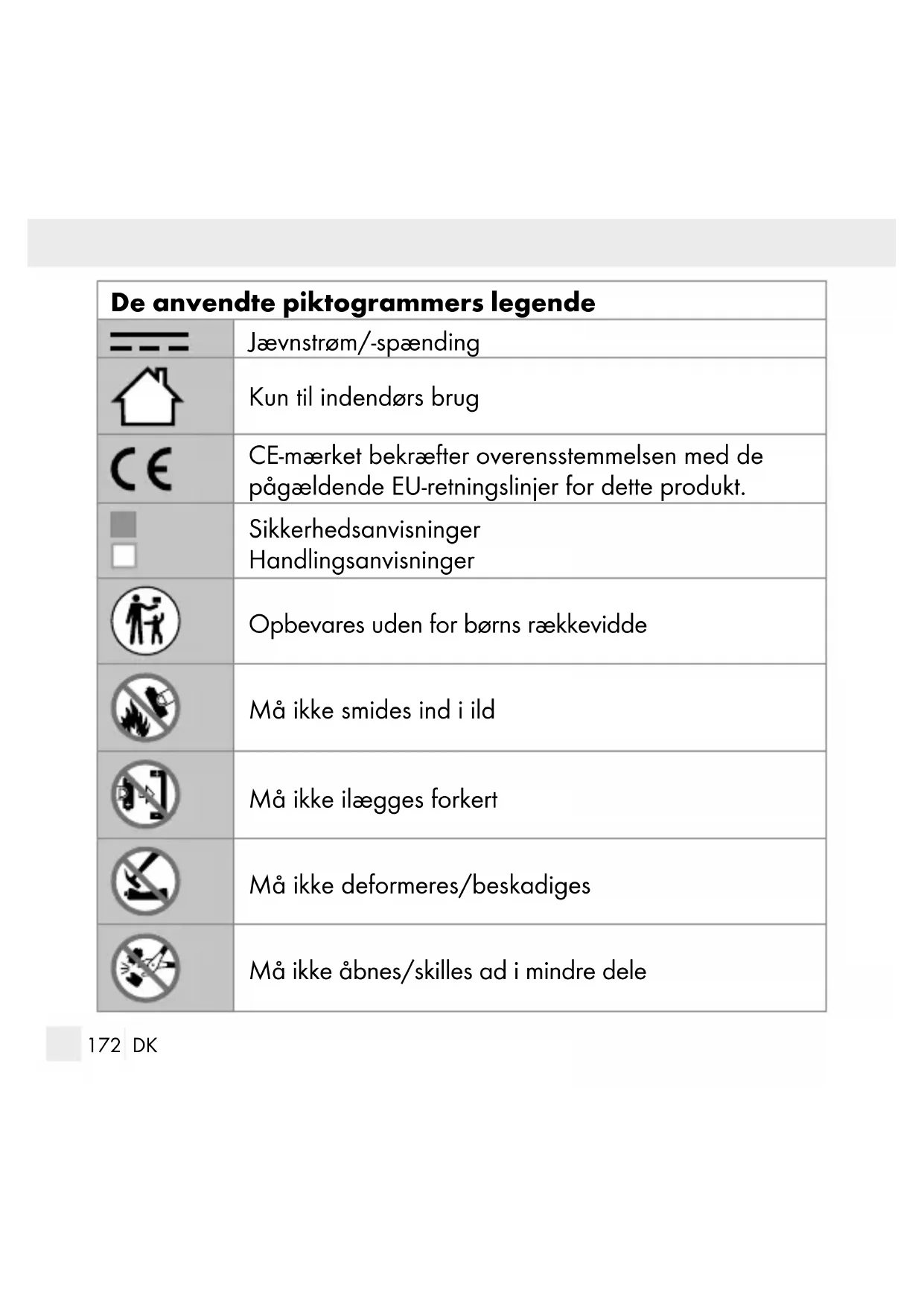 RÆKKEVIDDE! Slugningen kan forårsage kemiske forbrændinger, perforering af bløddelsvæv. Alvorlige forbrændinger kan optræde indenfor 2 timer efter slugningen. Opsøg med det samme en læge. LIVSFARE! Hold batterier/akkuer udenfor børns rækkevidde. Opsøg i tilfælde af slugning straks lægehjælp! Indtagelse kan forårsage forbrændinger, perforering af blødt væv og døden. Alvorlige forbrændinger kan forekomme inden for 2 timer efter indtagelse. EKSPLOSIONSFARE! Genoplad aldrig ikkeopladelige batterier igen. Kortslut ikke batterier/akkuer og/eller åben disse ikke. Der kan opstå overophedning, brandfare eller eksplosion. Smid batterier/akkuer aldrig i ild eller vand. Udsæt batterier/akkuer ikke for mekanisk belastning.181 DK Risiko for udsivning fra batteriene/akkuerne Undgå ekstreme betingelser og temperaturer, som kan påvirke batterier/akkuer, f.eks. varmelegemer/direkte sollys. Hvis batterier/akkuer er lækket, skal du undgå at få kemikalierne på huden, i øjnene og i slimhinderne! Skyl de berørte steder med det samme med klart vand og opsøg en læge! BÆR BESKYTTELSESHANDSKER! Udløbne eller beskadigede batterier/akkuer kan forårsage ætsnin- ger ved berøring med huden. Bær i dette tilfælde der- for egnede beskyttelseshandsker. I tilfælde af en lækage hos batterierne/akkuerne, skal De fjerne disse med det samme fra produktet for at undgå beskadigelser. Anvend kun batterier/akkuer af samme type. Bland ikke gamle batterier/akkuer med nye! Fjern batterierne/akkuerne, når produktet ikke anvendes i en læn- gere periode. Risiko for beskadigelse af produktet Anvend udelukkende den angivne batteri-/akkutype! Indsæt batterier/akkuer iht. polaritetsmærkningen (+) og (-) til batteri/akku og produktet.182 DK Rengør kontakter ved batteriet/det genopladelige batteri og i batterirummet før ilægningen med en tør, fnugfri klud eller en vatpind! Fjern brugte batterier/akkuer omgående fra produktet. Ikke åbenlyse symptomer, som kan opstå pga. slugning af batterier Det er desværre ikke tydeligt, når en knapcelle eller et møntbatteri sidder fast i barnets spiserør. Der er ikke nogen specifikke symptomer man vil kunne bemærke. Barnet kan: