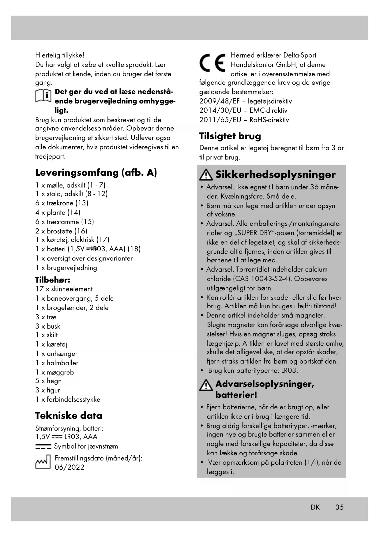 - Tryk igen på knappen (17d) for at deaktivere det elektriske køretøj. Opbevaring, rengøring Opbevar altid artiklen tør, ren, uden batterier og ved stuetemperatur, når den ikke er i brug. Rengøres kun med en fugtig rengøringsklud, og tørres af bagefter. OBS: Skinnerne skal rengøres før første brug! VIGTIGT! Må aldrig rengøres med skrappe rengøringsmidler. Henvisninger vedr. bortskaffelse Med henblik på at beskytte miljøet bedst muligt, er det vigtigt, at du ikke smider dit produkt ud sammen med husholdningsaf- faldet, når det ikke længere kan anvendes, men i stedet sørger for at bortskaffe det på en forsvarlig måde. For at få oplysninger om genbrugsstationer og deres åbningstider, bedes du kontakte deres ansvarlige administration. DK37DK Defekte eller brugte batterier, genopladelige eller ej, skal genbruges i overensstemmelse med direktiv 2006/66/EF samt alle ændringer heraf. Du skal indlevere batterierne, genopladelige eller ej, og/eller produktet hos de genbrugsstati- oner, der findes i dit lokalområde. Emballagema- terialer som f.eks. plasticposer er ikke beregnede til børn. Opbevar emballagematerialet utilgæn- geligt for børn. Miljøskader på grund af ukorrekt bortskaffelse af batterierne, genopladelige eller ej! Batterier, genopladelige eller ej, må ikke bortskaffes sammen med husholdningsaffaldet. De kan indeholde giftige tungmetaller, og er derfor un- derlagt den samme håndtering som farligt affald. Tungmetallernes kemiske symboler er som følger: Cd = cadmium, Hg = kviksølv, Pb = bly. Indlever derfor de brugte batterier, genopladelige eller ej, på en af de kommunale genbrugsstationer. Bortskaf produktet og emballagemateria- lerne miljørigtigt. Vær opmærksom på emballagemateria- lernes mærkning under affaldssorterin- gen. Disse er markeret med forkortelser (a) og tal (b), der har følgende betydning: 1-7: Kunststoffer/20-22: Papir og pap/80-98: Kompositmaterialer. Produktet og emballagematerialerne kan genbruges, hvorfor du bedes bortskaffe dem separat for at opnå en bedre affaldshåndtering. Triman-logoet er kun gældende for Frankrig. De forskellige bortskaffelsesmuligheder, der eksiste- rer for det udtjente produkt, kan du få mere infor- mation om hos kommune- eller byforvaltningen. Oplysninger om garanti og servicehåndtering Varen er fremstillet med største omhu og under løbende kontrol. DELTA-SPORT HANDELS- KONTOR GmbH yder private slutkunder tre års garanti på varen fra købsdato (Garantifrist) i henhold til følgende bestemmelser. Garantien gælder kun for materiale- og fremstillingsfejl. Garantien omfatter ikke dele, der er udsat for normal slid og derfor skal betragtes som sliddele (f.eks. batterier) og ikke skrøbelige dele, f.eks. kontakter, genopladelige batterier eller dele, der er fremstillet af glas. Garantien kan ikke gøres gældende, hvis varen er blevet anvendt ukorrekt eller uagtsomt eller til andre formål end det tilsigtede eller i det tilsigtede omfang. Garantien bortfalder ligeledes ved manglende overholdelse af anvisningerne i betjeningsvejledningen. Kunden skal kunne påvise, at der er tale om materiale- eller fremstil- lingsfejl og ikke fejl som følge af ovenstående omstændigheder. Garantien kan kun gøres gældende i garanti- perioden mod fremvisning af original kvittering. Gem derfor den originale kvittering Garantipe- rioden forlænges ikke i tilfælde af reparation i henhold til garantien, den lovpligtige garanti eller pr. kulance. Dette gælder også for udskifte- de og reparerede dele. I tilfælde af klager er det muligt at kontakte nedenstående servicelinje eller kontakte os pr. e-mail. Ved garantisager vil vi efter eget skøn reparere varen uden beregning, ombytte varen eller refundere købsprisen. Der er ingen yderli- gere rettigheder under garantien. Dine lovmæssige rettigheder, herunder navnlig garantikrav over for sælger, indskrænkes ikke som følge af denne garanti. IAN: 391028_2201 Service Danmark Tel.: 32 710005 E-Mail: deltasport@lidl.dk38 Congratulazioni! Avete acquistato un articolo di alta qualità. Con- sigliamo di familiarizzare con l’articolo prima di cominciare ad utilizzarlo. Leggere attentamente le seguenti istruzioni d’uso. Utilizzare l’articolo solo nel modo descritto e per gli ambiti di applicazione indicati. Conservare accuratamente queste istruzioni d’uso. In caso di trasferimento dell’articolo a terzi, consegnare tutti i documenti insieme all’articolo. Contenuto della confezione (imm. A) 1 x mulino, smontato (1 - 7) 1 x stalla smontata (8 - 12) 6 x chioma d’albero (13) 4 x pianta (14) 6 x tronco d’albero (15) 2 x pilone del ponte (16) 1 x veicolo, elettrico (17) 1 x batteria (1,5V LR03, AAA) (18) 1 x quadro delle varianti di montaggio 1 x istruzioni d’uso Accessori: 17 x elemento di binario 1 x passaggio a livello, in 5 pezzi 1 x parapetto del ponte, in 2 pezzi 3 x albero 3 x cespuglio 1 x cartello 1 x veicolo 1 x rimorchio 1 x balla di fieno 1 x forca 5 x recinzione 3 x figura 1 x pezzo di collegamento Dati tecnici Alimentazione di energia delle batterie:
