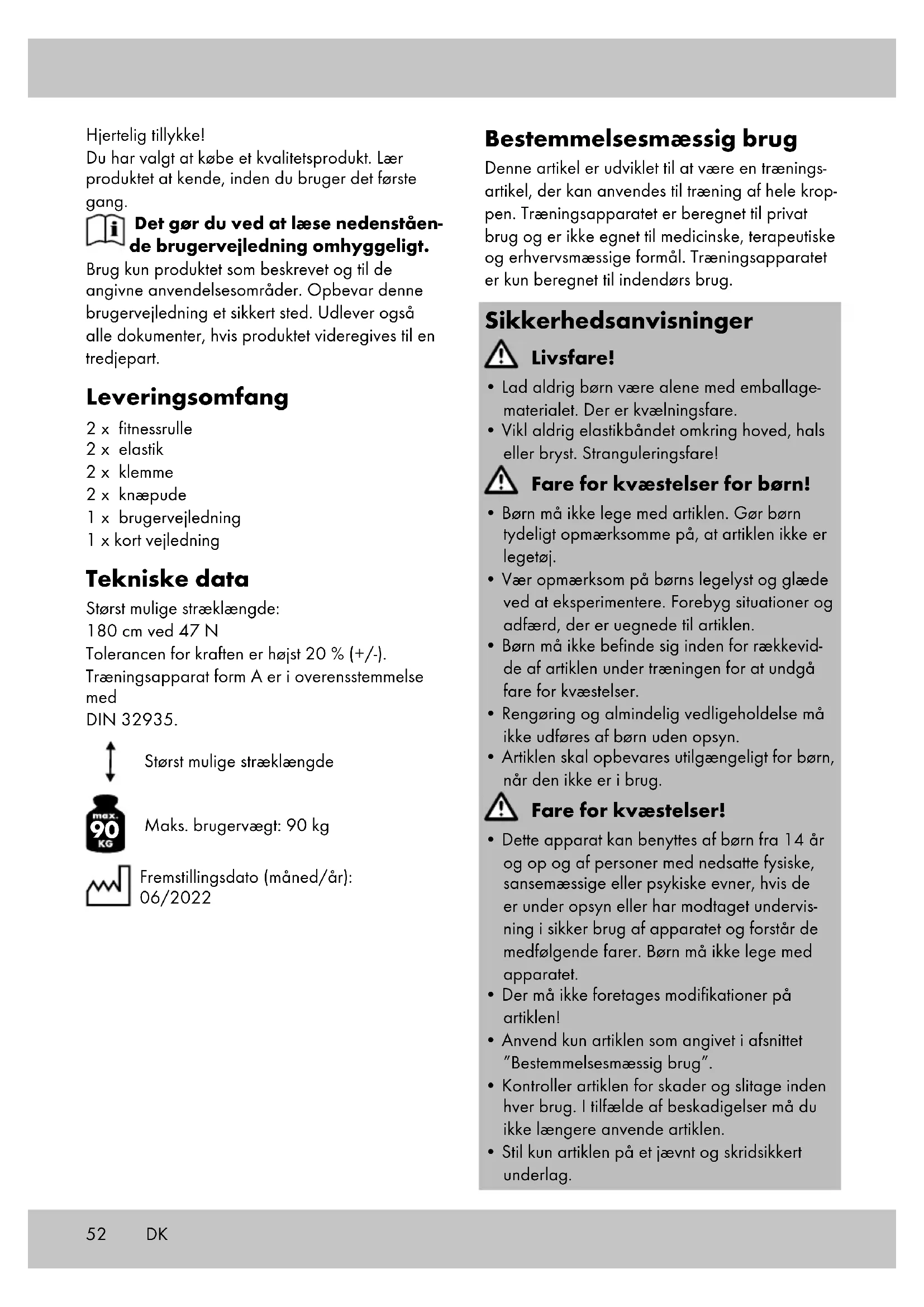 Maks. brugervægt: 90 kg Fremstillingsdato (måned/år): 06/2022 Bestemmelsesmæssig brug Denne artikel er udviklet til at være en trænings- artikel, der kan anvendes til træning af hele krop- pen. Træningsapparatet er beregnet til privat brug og er ikke egnet til medicinske, terapeutiske og erhvervsmæssige formål. Træningsapparatet er kun beregnet til indendørs brug. Sikkerhedsanvisninger Livsfare!