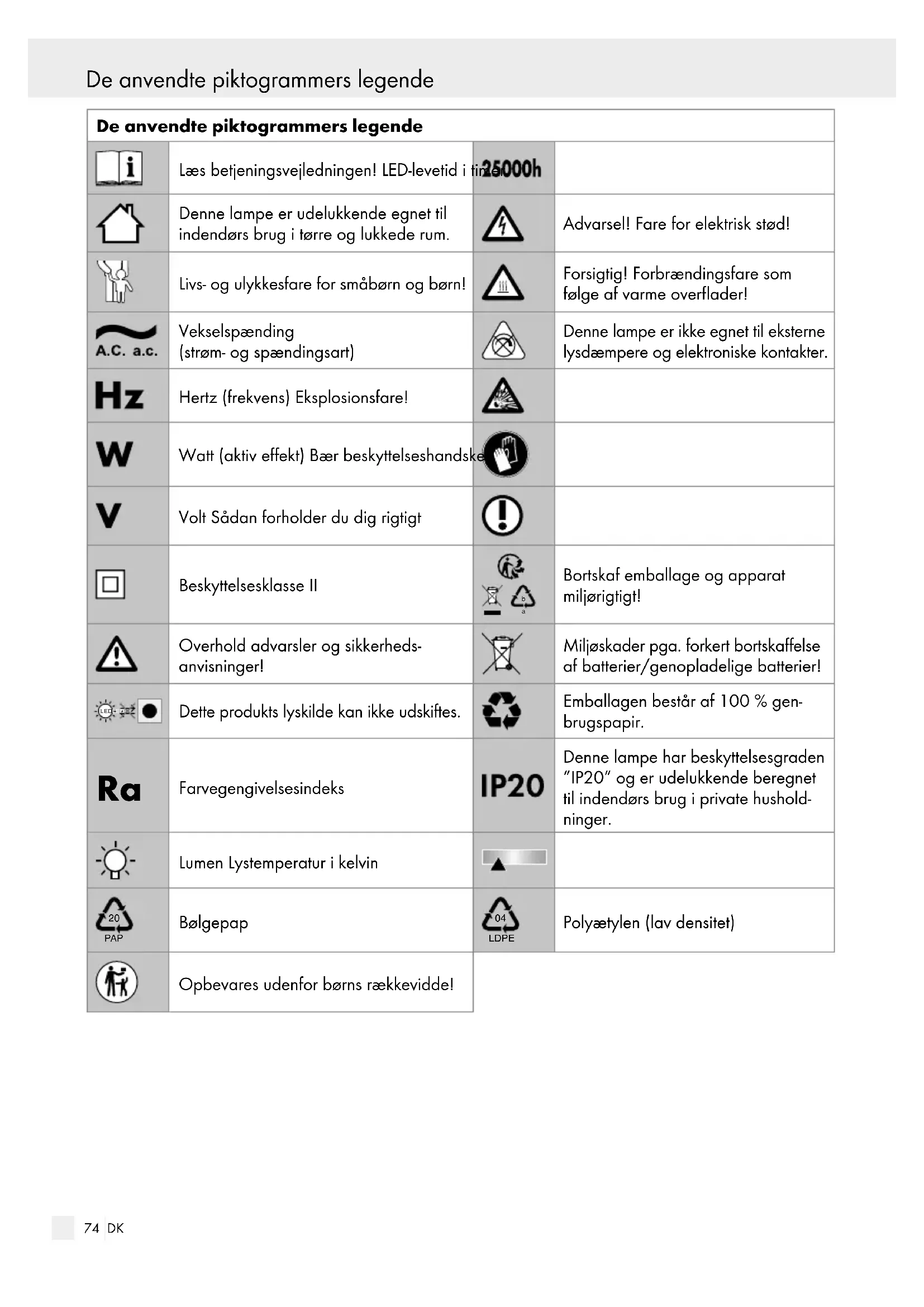 Bortskaf emballage og apparat miljørigtigt! Overhold advarsler og sikkerheds- anvisninger! Miljøskader pga. forkert bortskaffelse af batterier/genopladelige batterier! LED LED Dette produkts lyskilde kan ikke udskiftes. Emballagen består af 100 % gen- brugspapir.