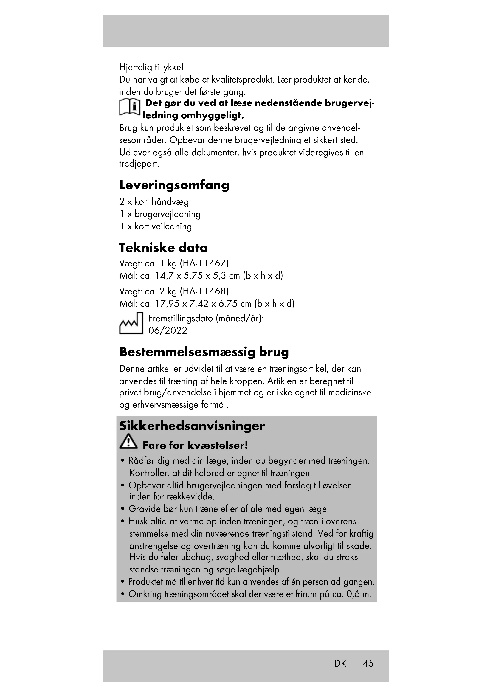 Vigtigt: Sørg for, at holde lårene parallelle. Skyd bækkenet fremad, og hold overkroppen oprejst. Opbevaring, rengøring Opbevar altid artiklen tør og ren ved stuetemperatur, når den ikke er i brug. Rengør kun med en fugtig klud, og tør af bagefter. VIGTIGT! Må aldrig rengøres med skrappe rengøringsmidler. Henvisninger vedr. bortskaffelse Bortskaf artikel og emballage i overensstemmelse med lokalt gældende forskrifter. Emballagematerialer som f.eks. plastposer hører ikke hjemme i børnehænder. Opbevar emballagen utilgæn- geligt for børn. Bortskaf produkter og emballage miljørigtigt. DK48 Genbrugskoden anvendes til mærkning af forskellige materialer med henblik på genvinding. Koden består af genbrugssymbolet – som afspejler genvindingskredsløbet – og et nummer, der kendetegner materialet. Oplysninger om garanti og servicehåndtering Varen er fremstillet med største omhu og under løbende kontrol. DELTA-SPORT HANDELSKONTOR GmbH yder private slutkun- der tre års garanti på varen fra købsdato (Garantifrist) i henhold til følgende bestemmelser. Garantien gælder kun for materiale- og fremstillingsfejl. Garantien omfatter ikke dele, der er udsat for normal slid og derfor skal betragtes som sliddele (f.eks. batterier) og ikke skrøbelige dele, f.eks. kontakter, genopladelige batterier eller dele, der er fremstillet af glas. Garantien kan ikke gøres gældende, hvis varen er blevet anvendt ukorrekt eller uagtsomt eller til andre formål end det tilsigtede eller i det tilsigtede omfang. Garantien bortfalder ligeledes ved manglende overholdelse af anvisningerne i betjeningsvejlednin- gen. Kunden skal kunne påvise, at der er tale om materiale- eller fremstillingsfejl og ikke fejl som følge af ovenstående omstændig- heder. Garantien kan kun gøres gældende i garantiperioden mod frem- visning af original kvittering. Gem derfor den originale kvittering Garantiperioden forlænges ikke i tilfælde af reparation i henhold til garantien, den lovpligtige garanti eller pr. kulance. Dette gælder også for udskiftede og reparerede dele. I tilfælde af klager er det muligt at kontakte nedenstående servi- celinje eller kontakte os pr. e-mail. Ved garantisager vil vi efter eget skøn reparere varen uden beregning, ombytte varen eller refundere købsprisen. Der er ingen yderligere rettigheder under garantien. Dine lovmæssige rettigheder, herunder navnlig garantikrav over for sælger, indskrænkes ikke som følge af denne garanti. IAN: 391390_2201 Service Danmark Tel.: 32 710005 E-Mail: deltasport@lidl.dk DK49 Congratulazioni! Avete acquistato un articolo di alta qualità. Consigliamo di fami- liarizzare con l’articolo prima di cominciare ad utilizzarlo. Leggere attentamente le seguenti istruzioni d’uso. Utilizzare l’articolo solo nel modo descritto e per gli ambiti di ap- plicazione indicati. Conservare accuratamente queste istruzioni d’uso. In caso di trasferimento dell’articolo a terzi, consegnare tutti i documenti insieme all’articolo. Contenuto della fornitura 2 x manubrio 1 x istruzioni d’uso 1 x brevi istruzioni Dati tecnici Peso: ca. 1 kg (HA-11467) Misure: ca. 14,7 x 5,75 x 5,3 cm (l x A x P) Peso: ca. 2 kg (HA-11468) Misure: ca. 17,95 x 7,42 x 6,75 cm (l x A x P) Data di produzione (mese/anno): 06/2022 Uso conforme alla destinazione Questo articolo è stato sviluppato quale strumento di allena- mento per tutto il corpo. L’articolo è concepito per l’impiego in ambito privato/domestico e non è adatto a scopo medico né commerciale. Indicazioni di sicurezza Pericolo di lesioni!