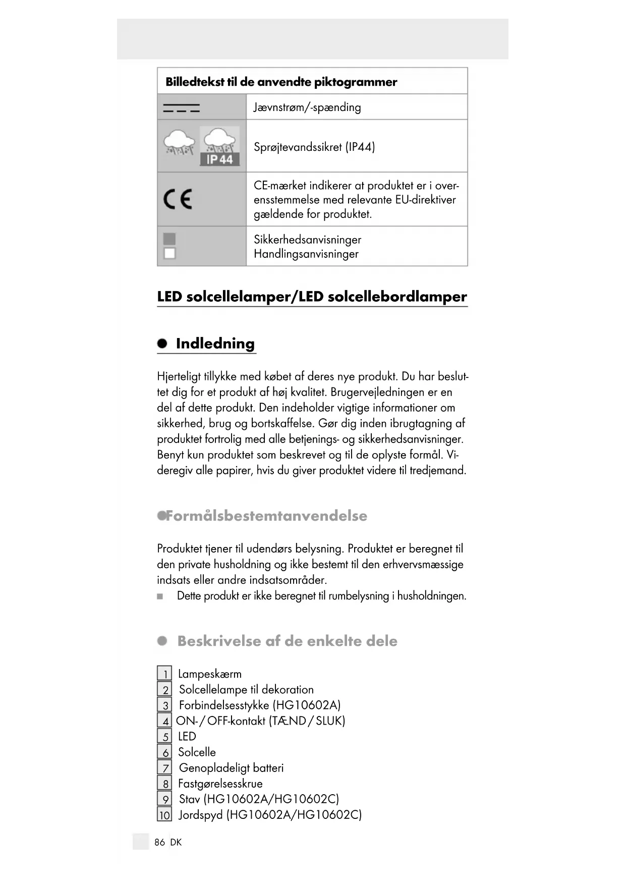 NINGER TIL FREMTIDEN! Dette produkt kan benyttes af børn fra 8-årsalderen og opad, samt af personer med forringede fysiske, følelses- mæssige eller mentale evner eller med mangel på erfaring og viden, når de er under opsyn eller er blevet vejledt med hensyn til produktet og forstår de deraf resulterende farer. Børn må ikke lege med produktet. Rengøring og brugerved- ligeholdelse må ikke udføres af børn uden at være under opsyn. Anvend ikke produktet, når De konstaterer nogle beskadi- gelser. Lyskilden er ikke udskiftelig. Skulle lyskilden i slutningen af dens levetid svigte, så skal hele produktet udskiftes. Produktspecifikke sikkerhedshenvisninger Sørg for at solarcellen ikke er tilsnavset eller dækket af sne og is om vinteren. Det forringer solcellens effektivitet.88 DK Sikkerhedshenvisninger for batterier/akkuer LIVSFARE! Hold batterier/akkuer udenfor børns række- vidde. Opsøg i tilfælde af slugning straks lægehjælp! Indtagelse kan forårsage forbrændinger, perforering af blødt væv og døden. Alvorlige forbrændinger kan fore- komme inden for 2 timer efter indtagelse. EKSPLOSIONSFARE! Genoplad aldrig ikke- opladelige batterier igen. Kortslut ikke batterier/ akkuer og/eller åben disse ikke. Der kan opstå overophedning, brandfare eller eksplosion. Smid batterier/akkuer aldrig i ild eller vand. Udsæt batterier/akkuer ikke for mekanisk belastning. Risiko for udsivning fra batteriene/akkuerne Undgå ekstreme betingelser og temperaturer, som kan på- virke batterier/akkuer, f.eks. varmelegemer/direkte sollys. Hvis batterier/akkuer er lækket, skal du undgå at få kemika- lierne på huden, i øjnene og i slimhinderne! Skyl de berørte steder med det samme med klart vand og opsøg en læge! BÆR BESKYTTELSESHANDSKER! Udløbne eller beskadigede batterier/akkuer kan forår- sage ætsninger ved berøring med huden. Bær i dette tilfælde derfor egnede beskyttelseshandsker. I tilfælde af en lækage hos batterierne/akkuerne, skal De fjerne disse med det samme fra produktet for at undgå be- skadigelser. Fjern batterierne/akkuerne, når produktet ikke anvendes i en længere periode. Risiko for beskadigelse af produktet Anvend udelukkende den angivne batteri-/akkutype! Indsæt batterier/akkuer iht. polaritetsmærkningen (+) og (-) til batteri/akku og produktet. Rengør kontakter ved batteriet/det genopladelige batteri og i batterirummet før ilægningen med en tør, fnugfri klud eller en vatpind! Fjern brugte batterier/akkuer omgående fra produktet. Funktionsmåde Ved solindstråling forvandler produktets indbyggede solcelle ly- set til elektrisk energi og lagrer denne i en Ni-MH-akku. Tænd for produktet med ON-/OFF-kontakten