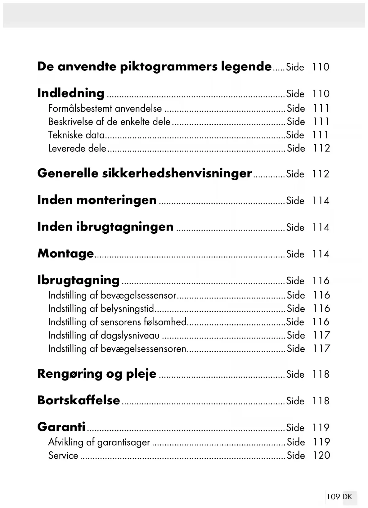 reagerer på bevægelser i registreringsområdet.118 DK Rengøring og pleje Fjern sikringen i sikringskassen inden rengøringen eller sluk for sikkerhedskontakten. Dyk produktet aldrig i vand eller andre væsker. I modsat fald kan produktet tage skade. Rengør produktet med en fnugfri, let fugtet klud og mildt rengø- ringsmiddel. Indsæt sikringen efter rengøringen og før ibrugtagningen og tænd for effektafbryderen. Bortskaffelse Indpakningen består af miljøvenlige materialer, som De kan bortskaffe- over de lokale genbrugssteder.