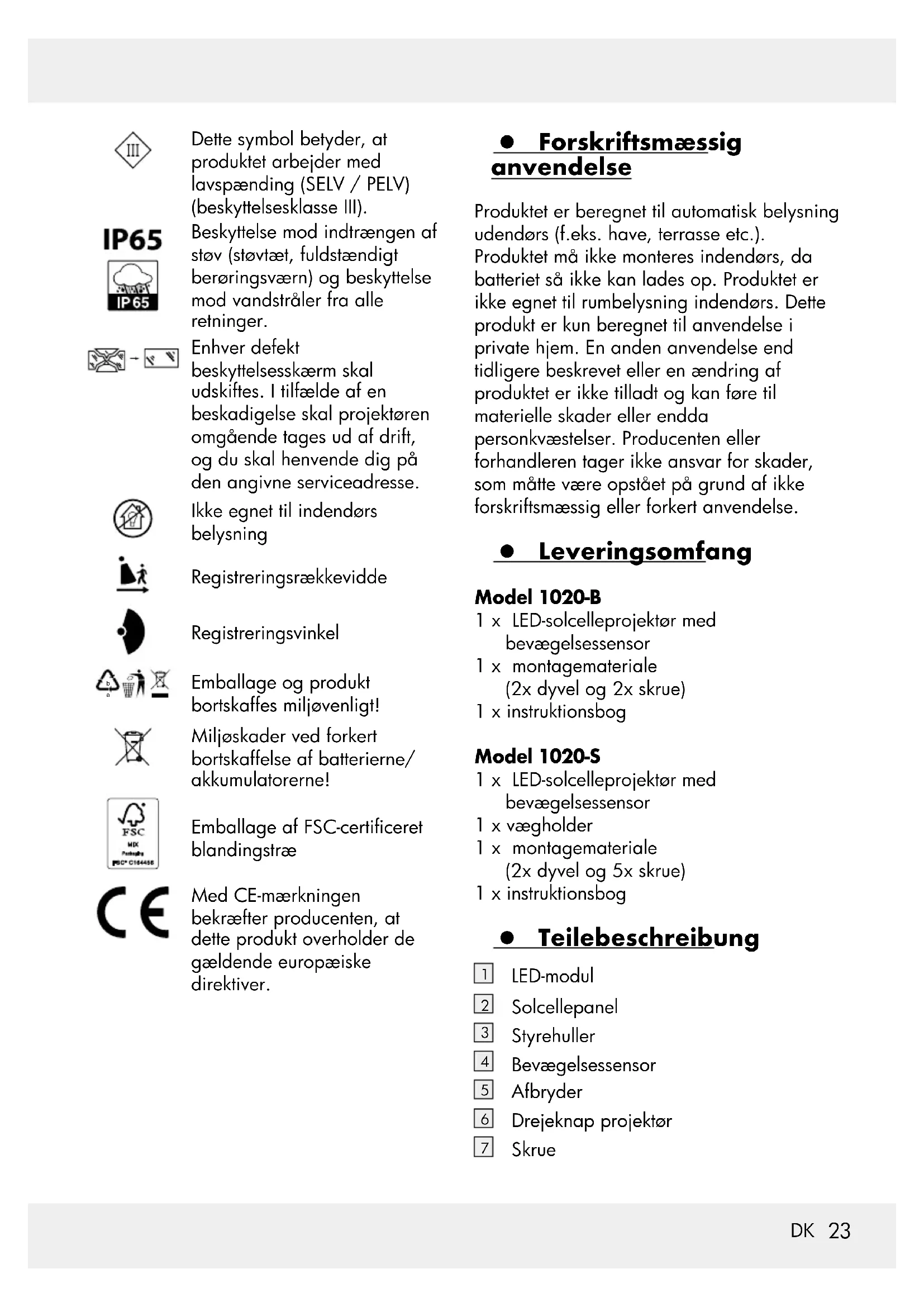 Emballage og produkt bortskaffes miljøvenligt! Miljøskader ved forkert bortskaffelse af batterierne/ akkumulatorerne! Emballage af FSC-certiceret blandingstræ Med CE-mærkningen bekræfter producenten, at dette produkt overholder de gældende europæiske direktiver. z Forskriftsmæssig anvendelse Produktet er beregnet til automatisk belysning udendørs (f.eks. have, terrasse etc.). Produktet må ikke monteres indendørs, da batteriet så ikke kan lades op. Produktet er ikke egnet til rumbelysning indendørs. Dette produkt er kun beregnet til anvendelse i private hjem. En anden anvendelse end tidligere beskrevet eller en ændring af produktet er ikke tilladt og kan føre til materielle skader eller endda personkvæstelser. Producenten eller forhandleren tager ikke ansvar for skader, som måtte være opstået på grund af ikke forskriftsmæssig eller forkert anvendelse. z Leveringsomfang Model 1020-B 1 x LED-solcelleprojektør med bevægelsessensor 1 x montagemateriale (2x dyvel og 2x skrue) 1 x instruktionsbog Model 1020-S 1 x LED-solcelleprojektør med bevægelsessensor 1 x vægholder 1 x montagemateriale (2x dyvel og 5x skrue) 1 x instruktionsbog z Teilebeschreibung