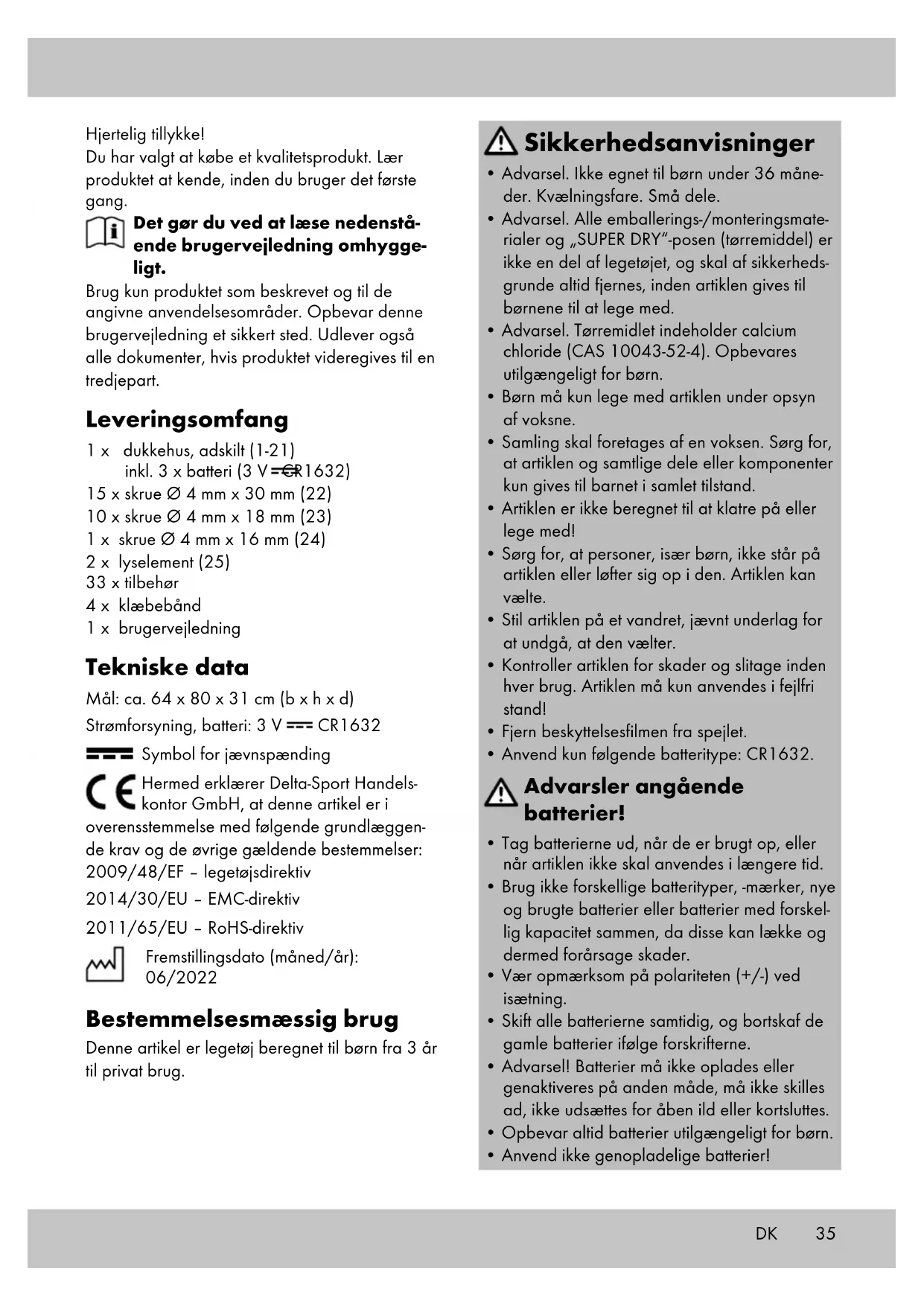 lyselementet (25) igen. Fastgør dørklokken på dukkehuset. Opbevaring, rengøring Opbevar altid artiklen tør, ren, uden batterier og ved stuetemperatur, når den ikke er i brug. Tør den kun af med en tør rengøringsklud. Rengør tekstiler med koldt vand, og lad dem tørre ved stuetemperatur. VIGTIGT! Må aldrig rengøres med skrappe rengøringsmidler. DK37 Henvisninger vedr. bortskaf- felse Med henblik på at beskytte miljøet bedst muligt, er det vigtigt, at du ikke smider dit produkt ud sammen med husholdningsaf- faldet, når det ikke længere kan anvendes, men i stedet sørger for at bortskaffe det på en forsvarlig måde. For at få oplysninger om genbrugsstationer og deres åbningstider, bedes du kontakte deres ansvarlige administration. Defekte eller brugte batterier, genopladelige eller ej, skal genbruges i overensstemmelse med direktiv 2006/66/EF samt alle ændringer heraf. Du skal indlevere batterierne, genopladelige eller ej, og/eller produktet hos de genbrugsstati- oner, der findes i dit lokalområde. Emballagema- terialer som f.eks. plasticposer er ikke beregnede til børn. Opbevar emballagematerialet utilgæn- geligt for børn. Miljøskader på grund af ukorrekt bortskaffelse af batterierne, genopladeli- ge eller ej! Batterier, genopladelige eller ej, må ikke bortskaffes sammen med husholdningsaffaldet. De kan indeholde giftige tungmetaller, og er derfor underlagt den samme håndtering som farligt affald. Tungmetallernes kemiske symboler er som følger: Cd = cadmium, Hg = kviksølv, Pb = bly. Indlever derfor de brugte batterier, genopladelige eller ej, på en af de kommunale genbrugsstationer. Bortskaf produktet og emballagemateria- lerne miljørigtigt. Vær opmærksom på emballagemateria- lernes mærkning under affaldssorterin- gen. Disse er markeret med forkortelser (a) og tal (b), der har følgende betydning: 1-7: Kunststoffer/20-22: Papir og pap/ 80-98: Kompositmaterialer. Produktet og emballagematerialerne kan genbruges, hvorfor du bedes bortskaffe dem separat for at opnå en bedre affaldshåndtering. Triman-logoet er kun gældende for Frankrig. De forskellige bortskaffel- sesmuligheder, der eksisterer for det udtjente produkt, kan du få mere information om hos kommune- eller byforvaltningen. Oplysninger om garanti og servicehåndtering Varen er fremstillet med største omhu og under løbende kontrol. DELTA-SPORT HANDELSKONTOR GmbH yder private slutkunder tre års garanti på varen fra købsdato (Garantifrist) i henhold til følgende bestemmel- ser. Garantien gælder kun for materiale- og fremstillingsfejl. Garantien omfatter ikke dele, der er udsat for normal slid og derfor skal betragtes som sliddele (f.eks. batterier) og ikke skrøbelige dele, f.eks. kontakter, genopladelige batterier eller dele, der er fremstillet af glas. Garantien kan ikke gøres gældende, hvis varen er blevet anvendt ukorrekt eller uagtsomt eller til andre formål end det tilsigtede eller i det tilsigtede omfang. Garantien bortfalder ligeledes ved manglende overholdelse af anvisningerne i betjeningsvejledningen. Kunden skal kunne påvise, at der er tale om materiale- eller fremstil- lingsfejl og ikke fejl som følge af ovenstående omstændigheder. Garantien kan kun gøres gældende i garanti- perioden mod fremvisning af original kvittering. Gem derfor den originale kvittering Garantipe- rioden forlænges ikke i tilfælde af reparation i henhold til garantien, den lovpligtige garanti eller pr. kulance. Dette gælder også for udskifte- de og reparerede dele. I tilfælde af klager er det muligt at kontakte nedenstående servicelinje eller kontakte os pr. e-mail. Ved garantisager vil vi efter eget skøn reparere varen uden beregning, ombytte varen eller refundere købsprisen. Der er ingen yderli- gere rettigheder under garantien. Dine lovmæssige rettigheder, herunder navnlig garantikrav over for sælger, indskrænkes ikke som følge af denne garanti. IAN: 393053_2201 Service Danmark Tel.: 32 710005 E-Mail: deltasport@lidl.dk DK38 Congratulazioni! Avete acquistato un articolo di alta qualità. Con- sigliamo di familiarizzare con l’articolo prima di cominciare ad utilizzarlo. Leggere attentamente le seguenti istruzioni d’uso. Utilizzare l’articolo solo nel modo descritto e per gli ambiti di applicazione indicati. Conservare accuratamente queste istruzioni d’uso. In caso di trasferimento dell’articolo a terzi, consegnare tutti i documenti insieme all’articolo. Contenuto della fornitura 1 x casa delle bambole, smontata (1-21) con 3 x pila (3 V CR1632) 15 x vite Ø 4 mm x 30 mm (22) 10 x vite Ø 4 mm x 18 mm (23) 1 x vite Ø 4 mm x 16 mm (24) 2 x lampada (25) 33 x accessorio 4 x striscia adesiva 1 x istruzioni d’uso Dati tecnici Misure: ca. 64 x 80 x 31 cm (l x A x P) Alimentazione a pile: 3 V CR1632 Simbolo di corrente continua Con la presente Delta-Sport Handelskon- tor GmbH dichiara che questo articolo è conforme ai seguenti requisiti di base e alle altre disposizioni vigenti: 2009/48/CE – Direttiva sulla sicurezza dei giocattoli 2014/30/UE – Direttiva EMC 2011/65/UE – Direttiva RoHS Data di produzione (mese/anno): 06/2022 Uso conforme alla destinazio-