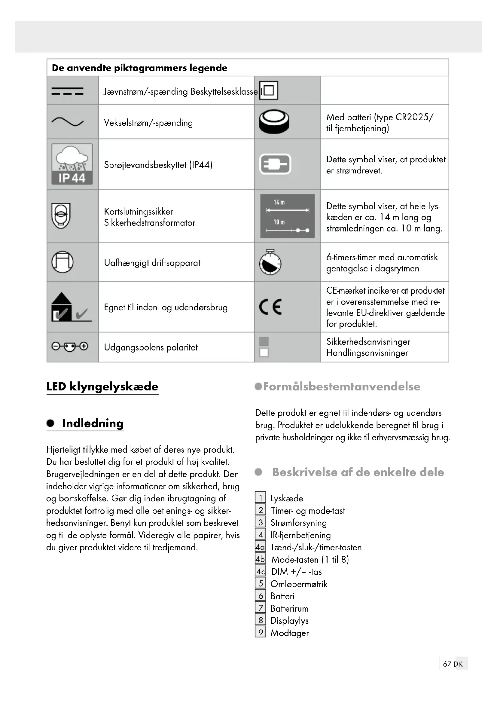 | Kortslutningssikker Sikkerhedstransformator | 14 m 10 m | Dette symbol viser, at hele lys-kæden er ca. 14 m lang og strømledningen ca. 10 m lang. | |