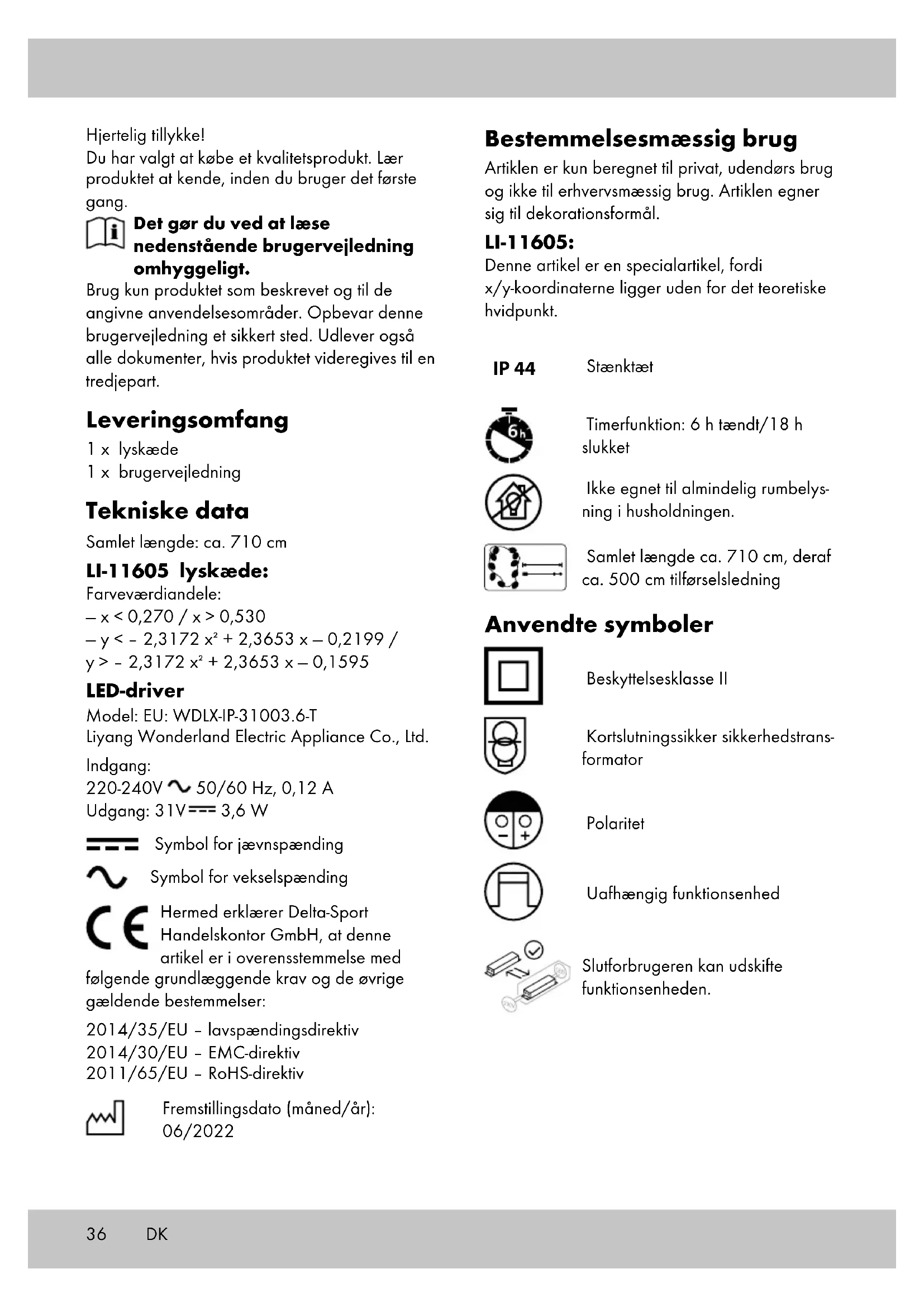 Posibilidad de atenuación de fuentes luminosas El mecanismo de control no permite la atenuación de fuentes luminosas Dimensiones exteriores del mecanismo de control Modelo: UE: WDLX-IP-31003.6-T: 102 x 41 x 41 mm Modelo BS WDLX-31003.6-T: 106 x 49 x 46 mm Peso del mecanismo de control Modelo: UE: WDLX-IP-31003.6-T: 50 g Modelo BS WDLX- 31003.6-T: 56 g Retirada del mecanismo de control del artículo Saque el mecanismo de control de la toma de corriente y desconéctelo del artículo Compatibilidad con fuentes luminosas atenuables El mecanismo de control no permite la atenuación de fuentes luminosas36 Hjertelig tillykke! Du har valgt at købe et kvalitetsprodukt. Lær produktet at kende, inden du bruger det første gang. Det gør du ved at læse nedenstående brugervejledning omhyggeligt. Brug kun produktet som beskrevet og til de angivne anvendelsesområder. Opbevar denne brugervejledning et sikkert sted. Udlever også alle dokumenter, hvis produktet videregives til en tredjepart. Leveringsomfang 1 x lyskæde 1 x brugervejledning Tekniske data Samlet længde: ca. 710 cm LI-11605 lyskæde: Farveværdiandele: — x < 0,270 / x > 0,530 — y < – 2,3172 x + 2,3653 x — 0,2199 / y > – 2,3172 x + 2,3653 x — 0,1595 LED-driver Model: EU: WDLX-IP-31003.6-T Liyang Wonderland Electric Appliance Co., Ltd. Indgang: 220-240V 50/60 Hz, 0,12 A Udgang: 31V 3,6 W Symbol for jævnspænding Symbol for vekselspænding Hermed erklærer Delta-Sport Handelskontor GmbH, at denne artikel er i overensstemmelse med følgende grundlæggende krav og de øvrige gældende bestemmelser: 2014/35/EU – lavspændingsdirektiv 2014/30/EU – EMC-direktiv 2011/65/EU – RoHS-direktiv Fremstillingsdato (måned/år): 06/2022 Bestemmelsesmæssig brug Artiklen er kun beregnet til privat, udendørs brug og ikke til erhvervsmæssig brug. Artiklen egner sig til dekorationsformål. LI-11605: Denne artikel er en specialartikel, fordi x/y-koordinaterne ligger uden for det teoretiske hvidpunkt. IP 44 Stænktæt Timerfunktion: 6 h tændt/18 h slukket Ikke egnet til almindelig rumbelys- ning i husholdningen. Samlet længde ca. 710 cm, deraf ca. 500 cm tilførselsledning Anvendte symboler Beskyttelsesklasse II Kortslutningssikker sikkerhedstrans- formator Polaritet Uafhængig funktionsenhed Slutforbrugeren kan udskifte funktionsenheden. DK37DK Sikkerhedsanvisninger Vigtigt: Læs denne brugervejledning omhyggeligt, og opbevar den til senere brug! Livsfare!